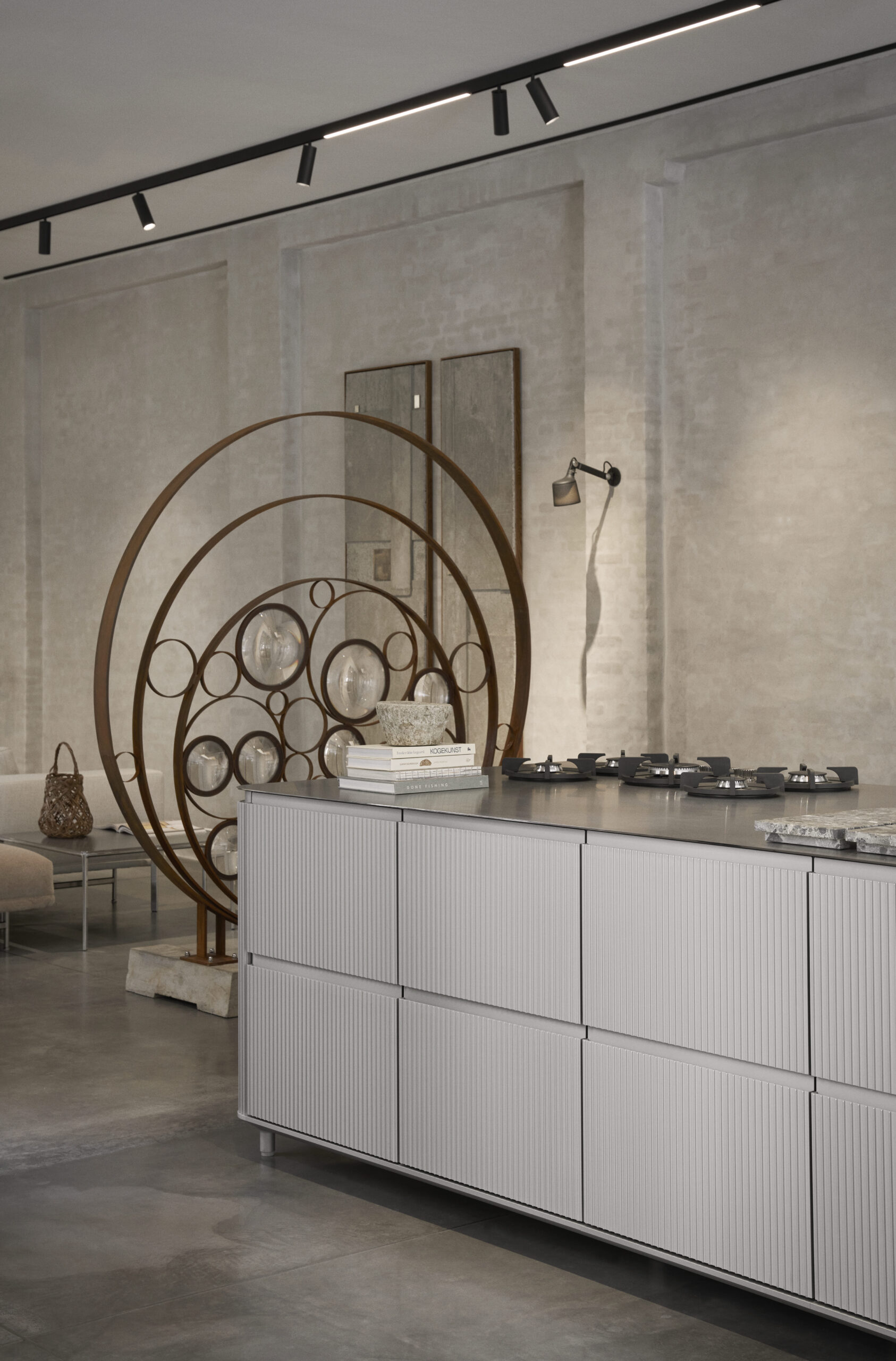 “I like the simplicity of a subtle color choice to match the new all-metal kitchen, making it stand out. It is completed with Vipp classics dressed in fresh upholsteries and topped with an artistic interpretation of a salon station as a nod to Vipp’s history.” — Julie Cloos Mølgaard
