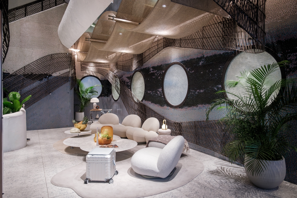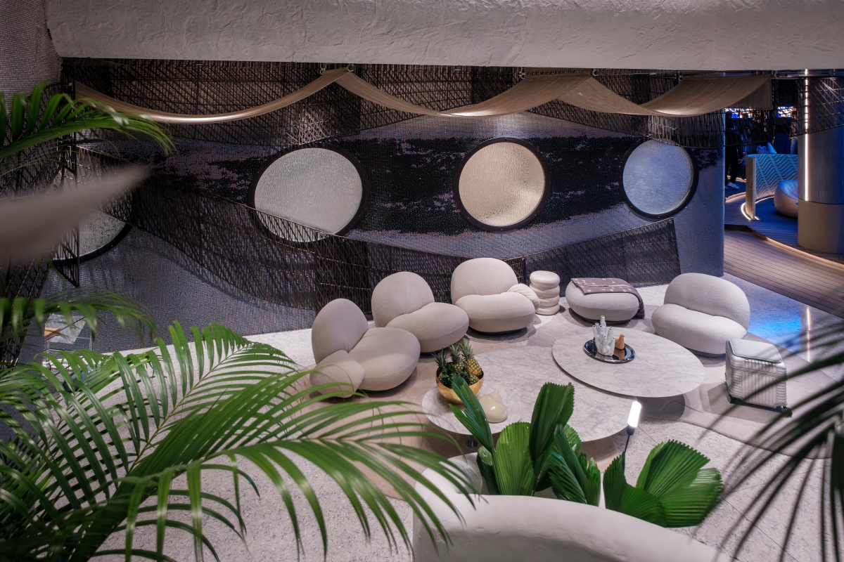 The room is imagined as a threshold, a place for people to pause, gather, and settle before moving through the cruise.