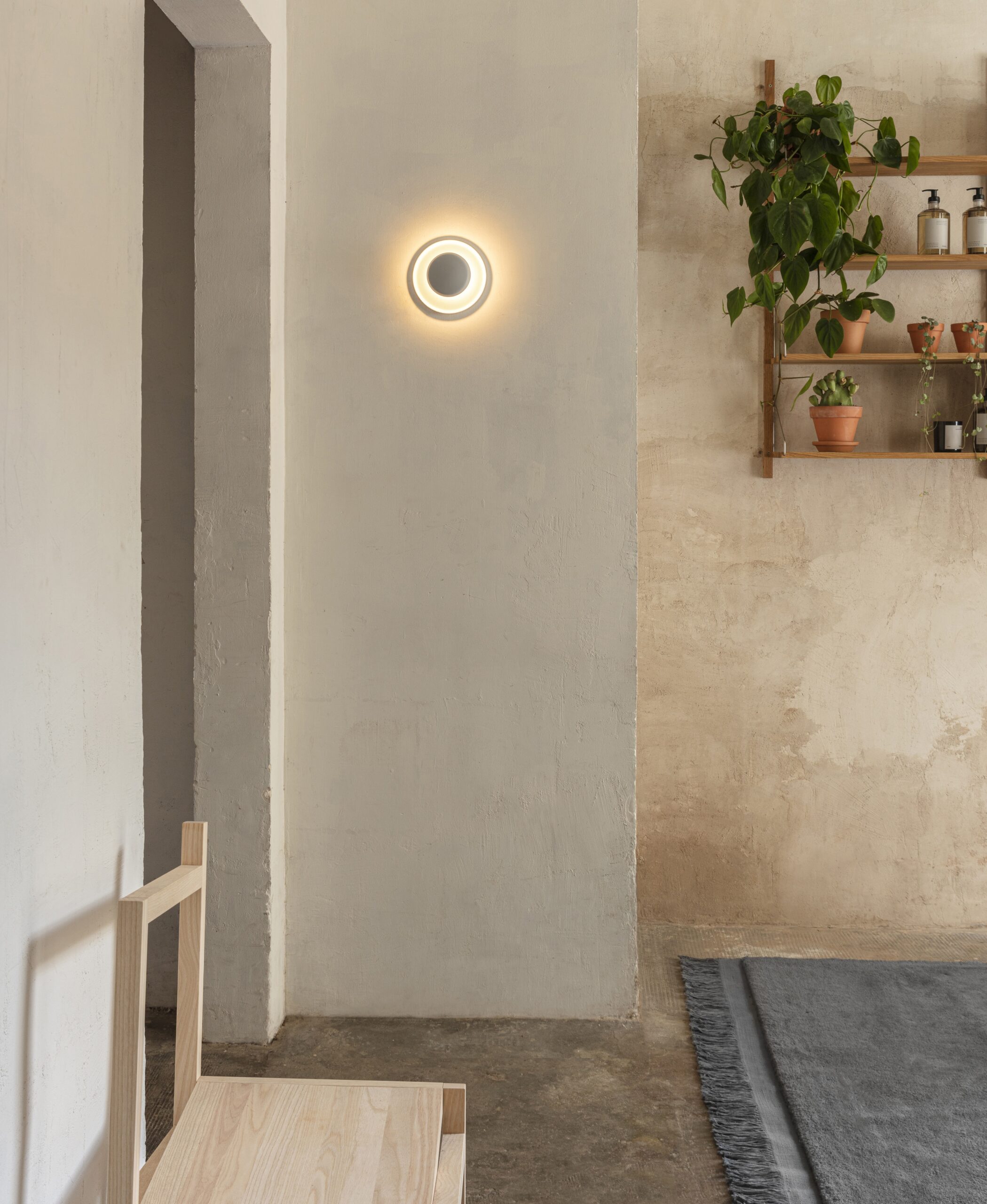 The Top wall sconce . Its small central sphere reflects the light towards a larger surrounding ring generating a halo type effect of even and indirect lighting and creating a relaxed ambience. The light appears to be framed within its own diameter, its attractive and minimalist design doubles as a piece of abstract wall art. The Top wall sconce is made from aluminium and is available in different sizes; mini, small, medium and large, the latter is equipped with a glass diffuser that emits a general direct style lighting