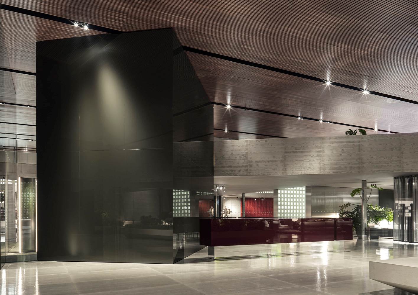 The must-have architectural icon is once again the fireplace, this year in ten different versions, while the reception area features two Musk-lacquered parallelepipeds that rise up to the ceiling, as well as two Plum-lacquered horizontal blocks that act as front desk.