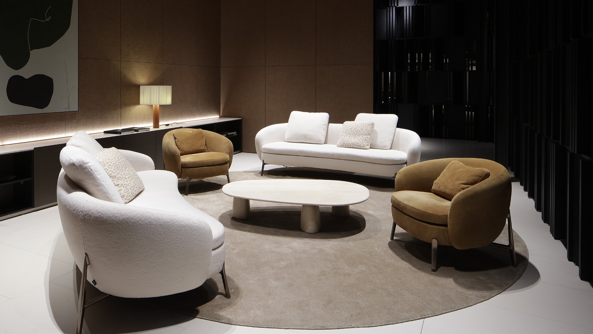 This design of lines, angles, and axes therefore leads to the heart of the stand, where it gives way to a softer and more comfortable appeal. It is an enveloping multisensory design that in fact acts as a fil rouge between all the numerous settings: a palette of warm and intense tones, the delicate scent of leather and bergamot (the new Poliform fragrance), the muffled effect of the 70s-style licorice carpet that softens the passage between the rooms, up to the harmonious musical background designed specifically to accompany visitors along the exhibition path.