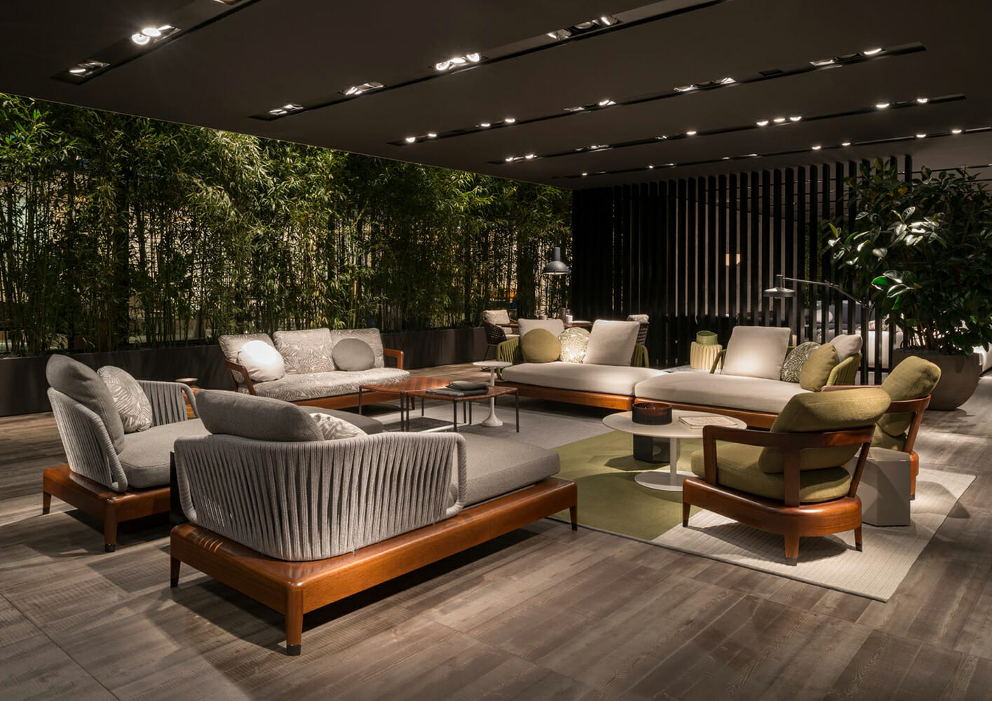 An vast collection of chairs, with bold personalities, around which a series of accessories revolves – tables, coffee and accent tables, a rug – that all work together to form different interpretations of outdoor space, creating a sophisticated play of visual associations with the interior decor.