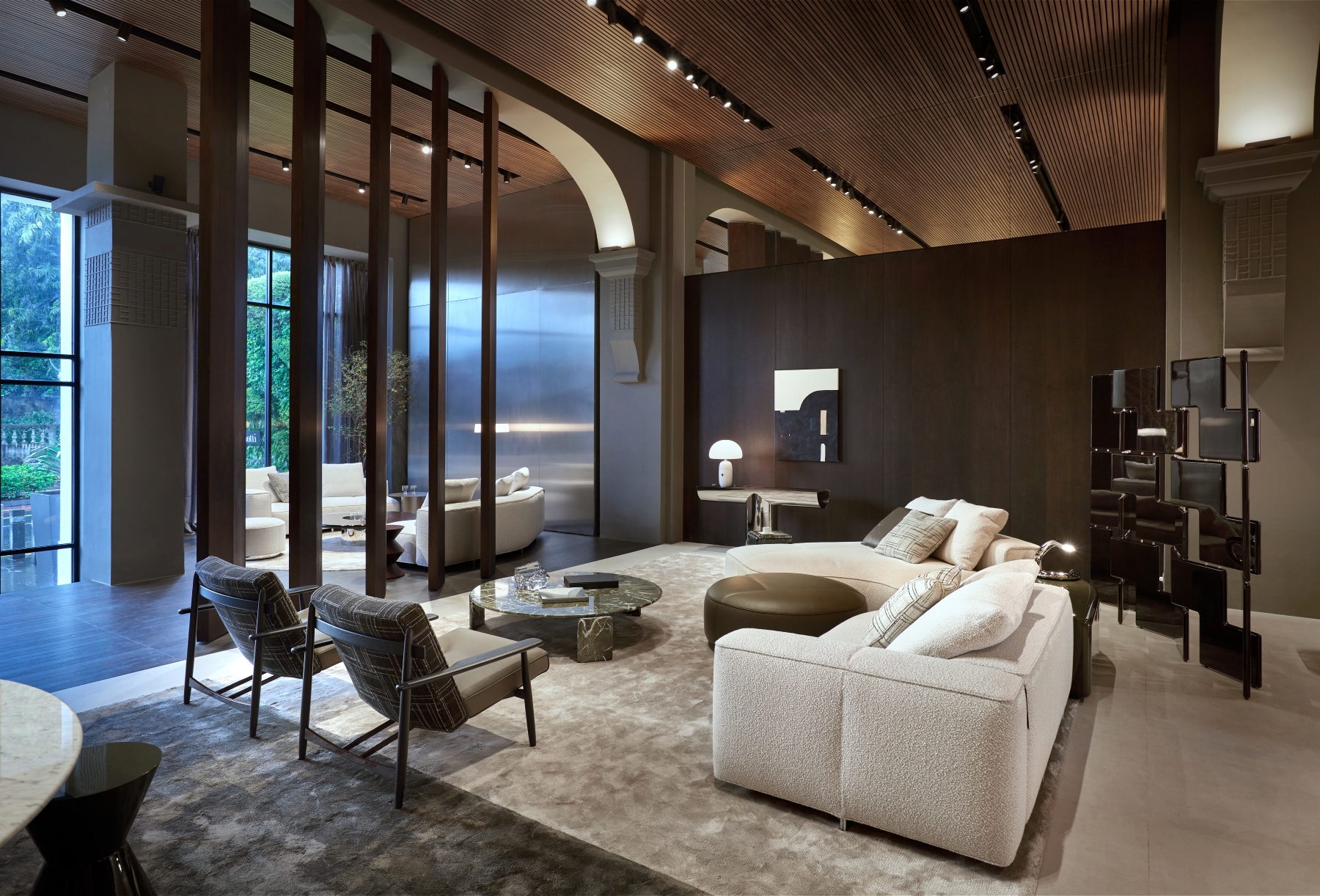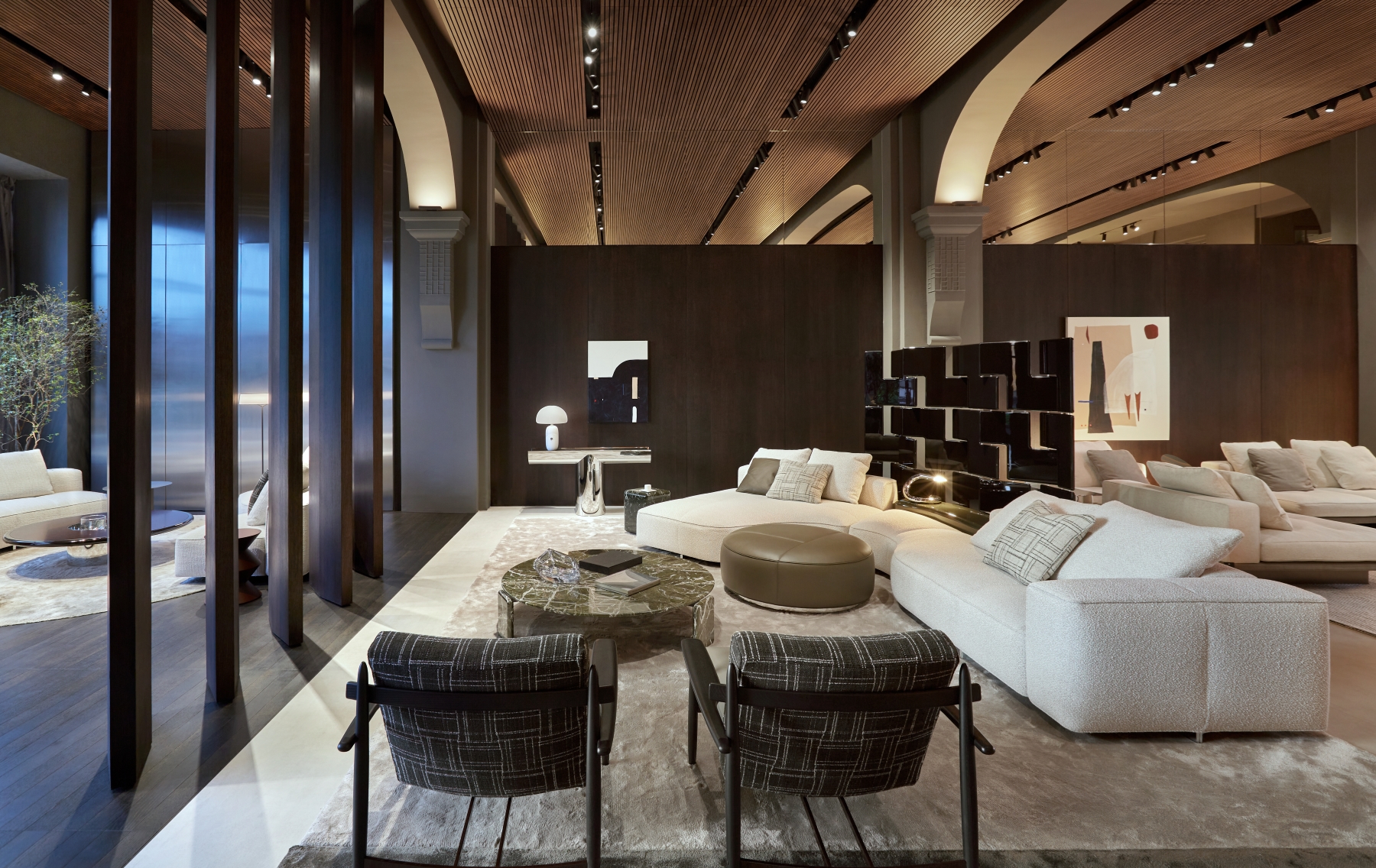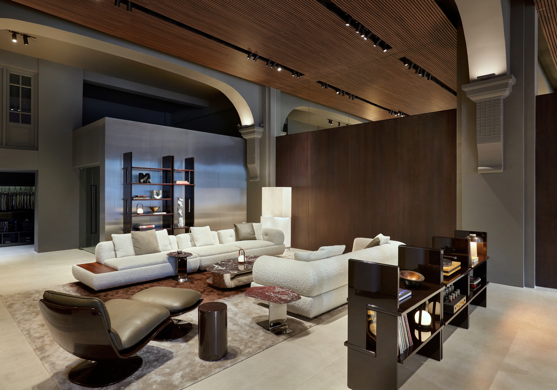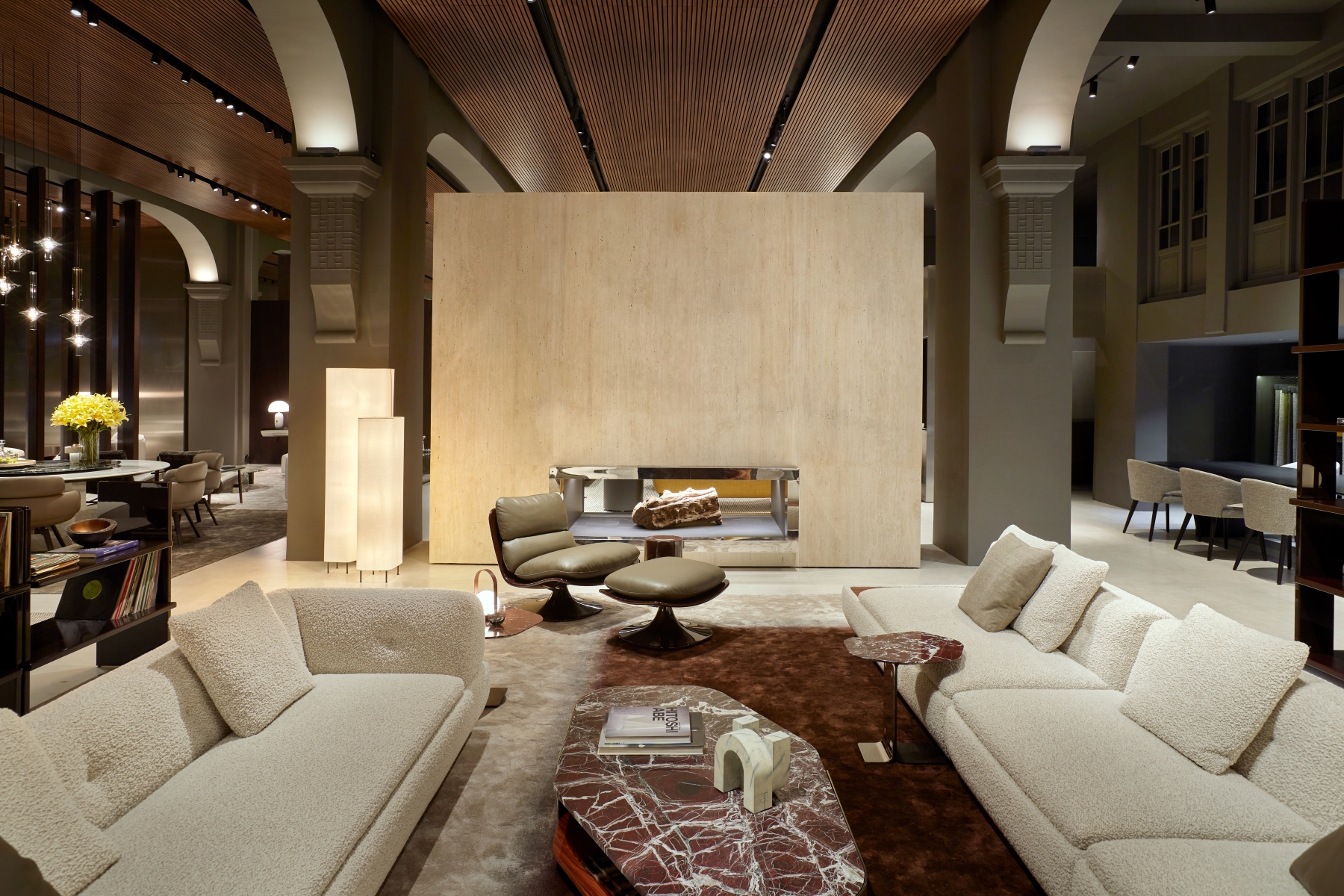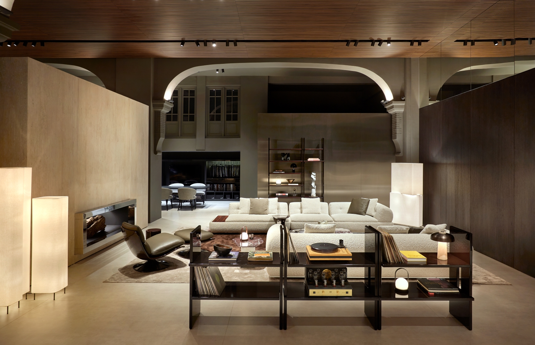 Innovative design elements define the updated space, including pivoting wood partitions, a standing fireplace made of white Travertine, and reflective chrome finishes. These features highlight the showroom’s architectural sophistication and make it a true destination for contemporary living. The new interiors are a harmonious interplay of textures and finishes, designed to create a warm and refined atmosphere. Wengé-coloured oak panelling alternates with polished stainless steel, while the flooring combines wood with concrete-effect surfaces, creating a balanced contrast. The ceiling, made entirely of wood-effect slats, completes the cohesive aesthetic. Wood accents are complemented by stainless steel details, and mirrored panels add depth and light, creating striking reflections that elevate the spatial perception.