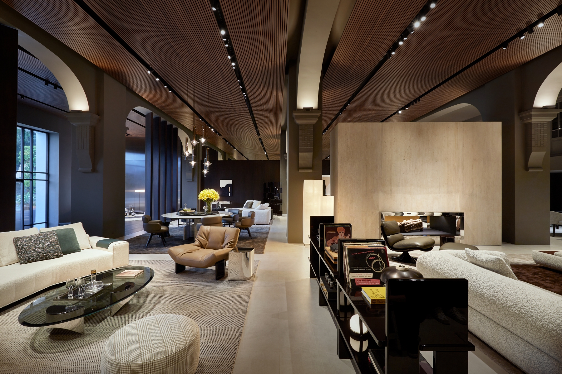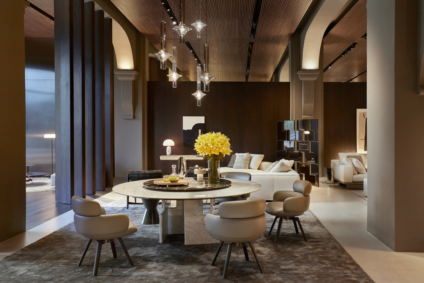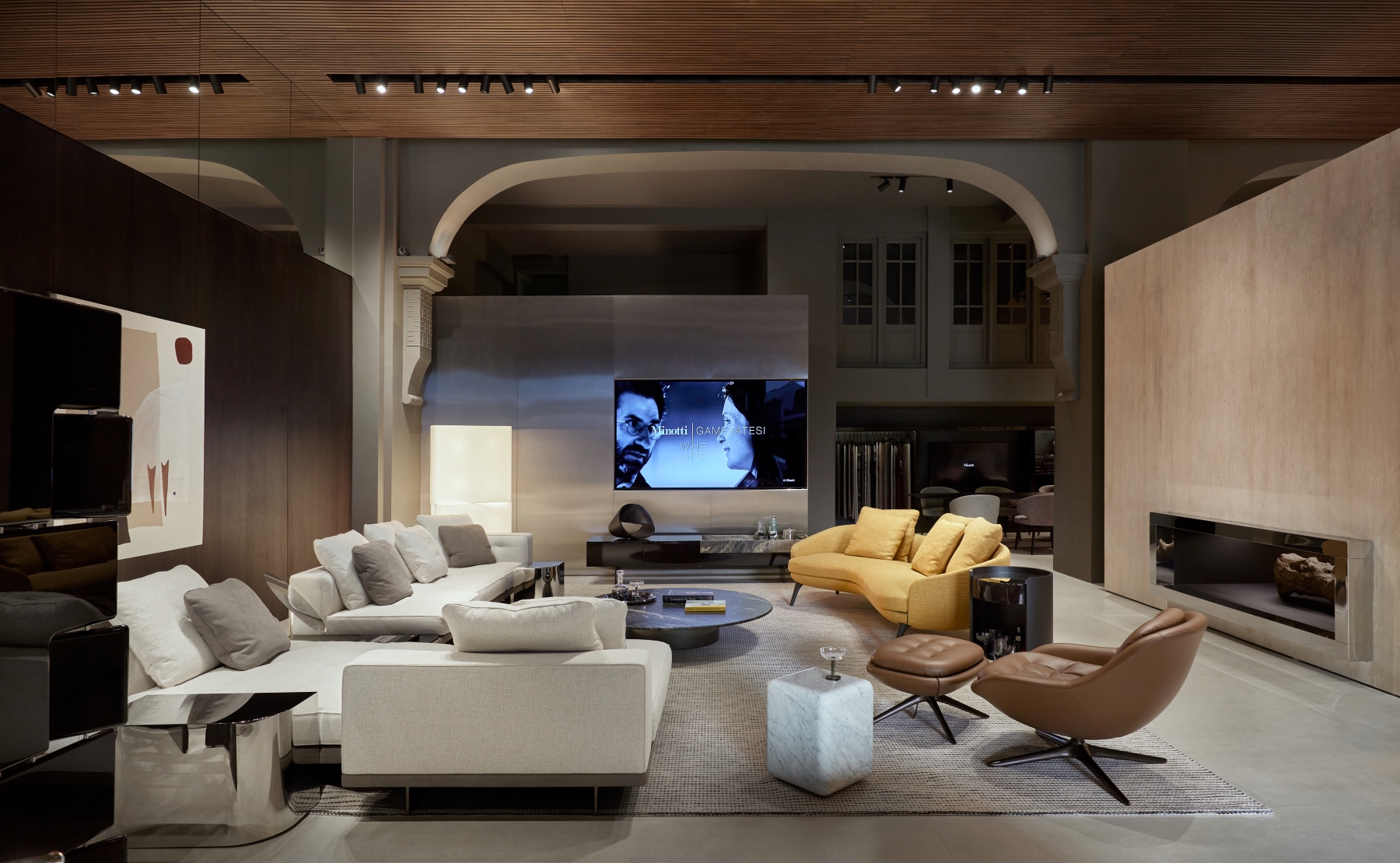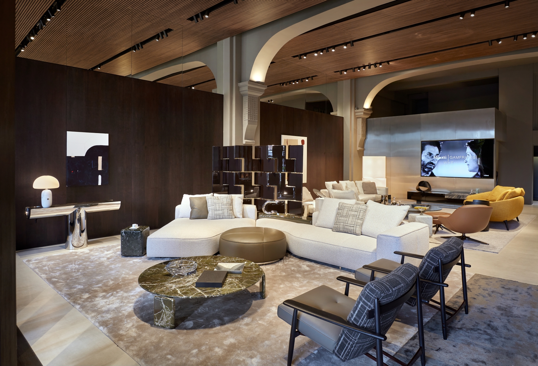 Innovative design elements define the updated space, including pivoting wood partitions, a standing fireplace made of white Travertine, and reflective chrome finishes. These features highlight the showroom’s architectural sophistication and make it a true destination for contemporary living. The new interiors are a harmonious interplay of textures and finishes, designed to create a warm and refined atmosphere. Wengé-coloured oak panelling alternates with polished stainless steel, while the flooring combines wood with concrete-effect surfaces, creating a balanced contrast. The ceiling, made entirely of wood-effect slats, completes the cohesive aesthetic. Wood accents are complemented by stainless steel details, and mirrored panels add depth and light, creating striking reflections that elevate the spatial perception.