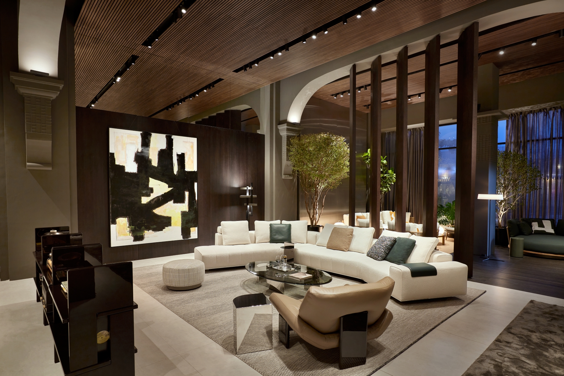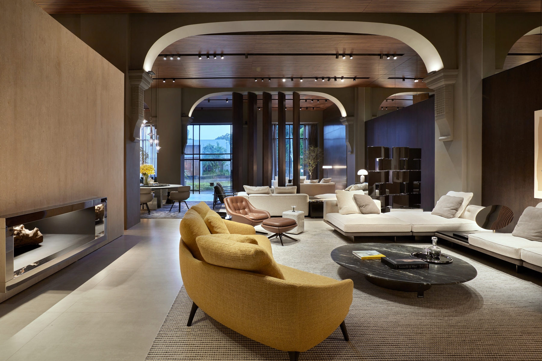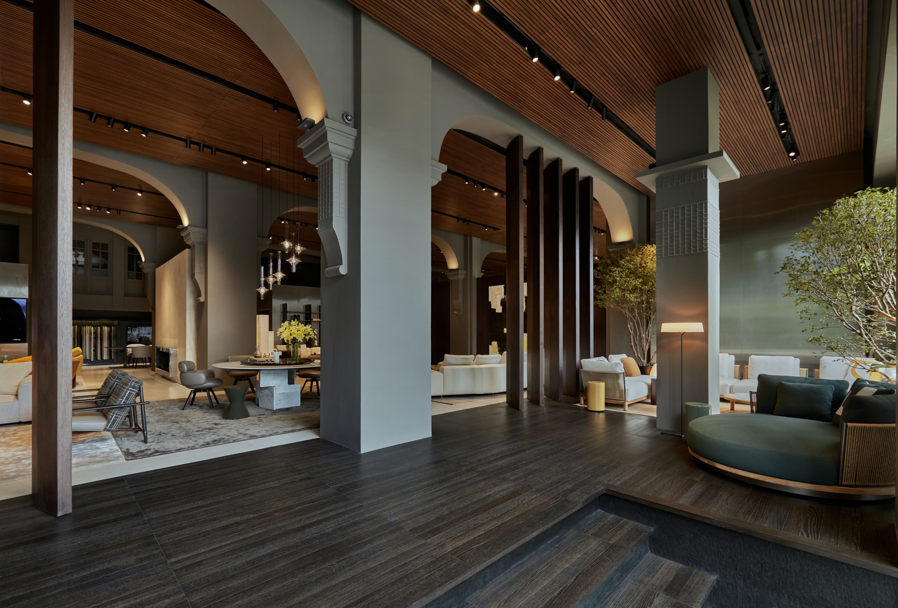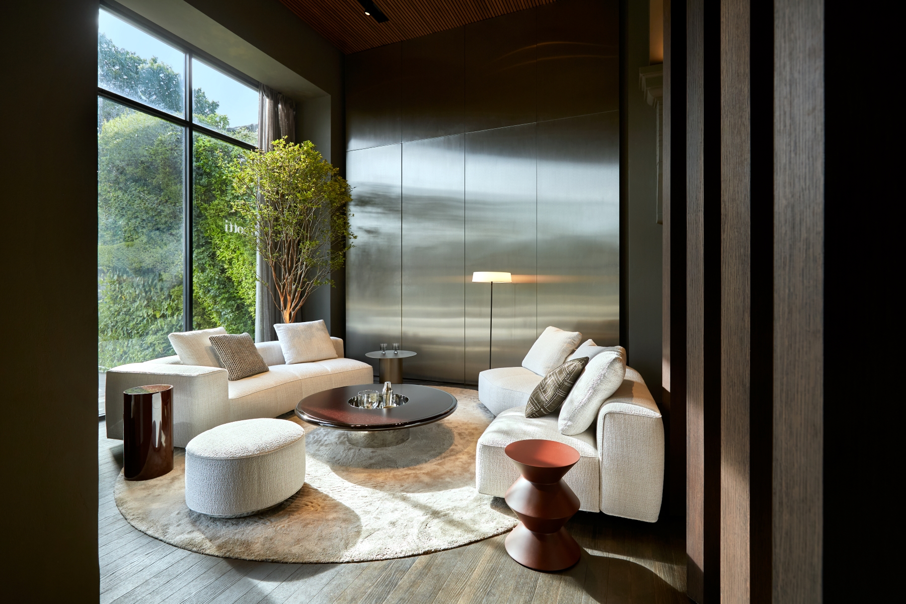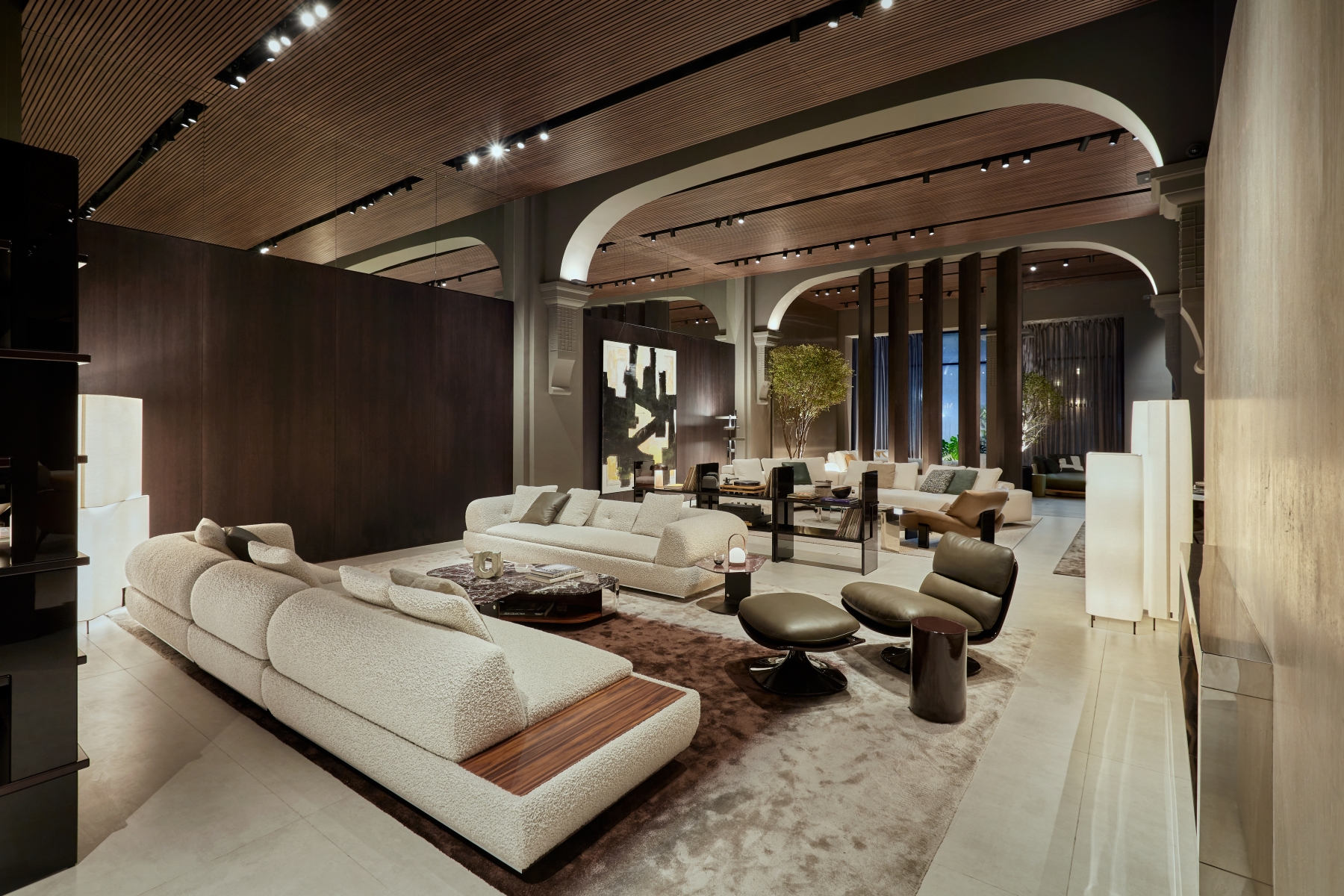 Innovative design elements define the updated space, including pivoting wood partitions, a standing fireplace made of white Travertine, and reflective chrome finishes. These features highlight the showroom’s architectural sophistication and make it a true destination for contemporary living. The new interiors are a harmonious interplay of textures and finishes, designed to create a warm and refined atmosphere. Wengé-coloured oak panelling alternates with polished stainless steel, while the flooring combines wood with concrete-effect surfaces, creating a balanced contrast. The ceiling, made entirely of wood-effect slats, completes the cohesive aesthetic. Wood accents are complemented by stainless steel details, and mirrored panels add depth and light, creating striking reflections that elevate the spatial perception.