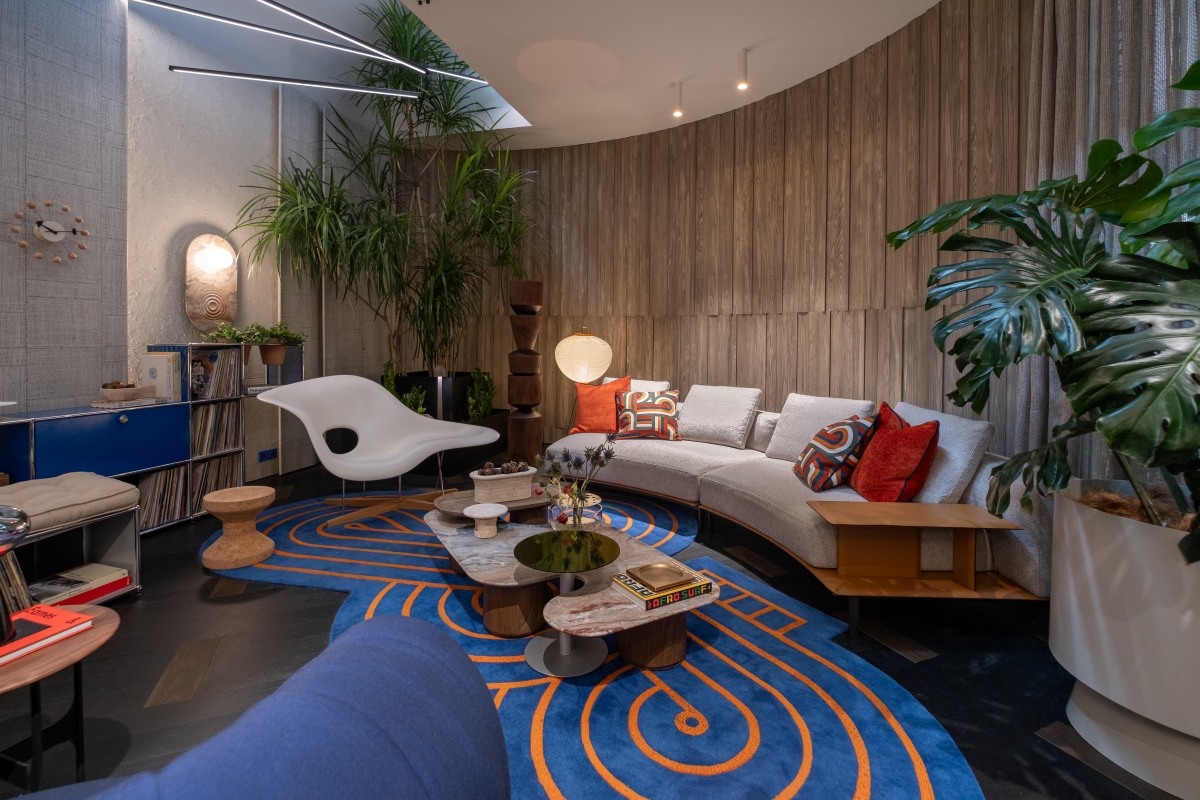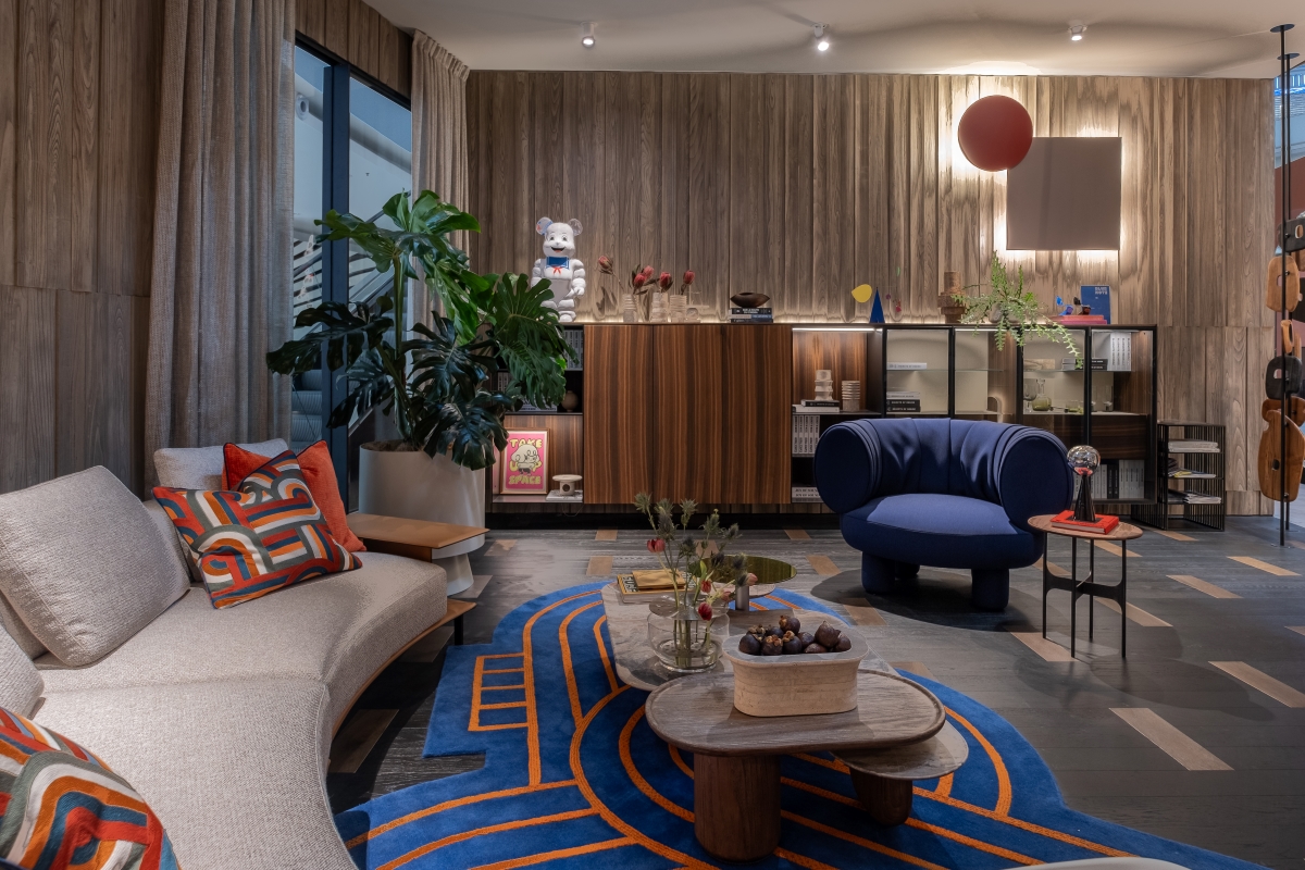 Key highlights of the room include the customizable Code cabinet by Poliform, the chic Sumo armchair by Maison Dada, the comfy Brera sofa by Poliform, the legendary La Chaise by Vitra, the easy-to-carry Melt table lamp by Tom Dixon, and the adaptable Sticks lamp by Vibia, which can be configured for ceiling, wall, or floor settings.