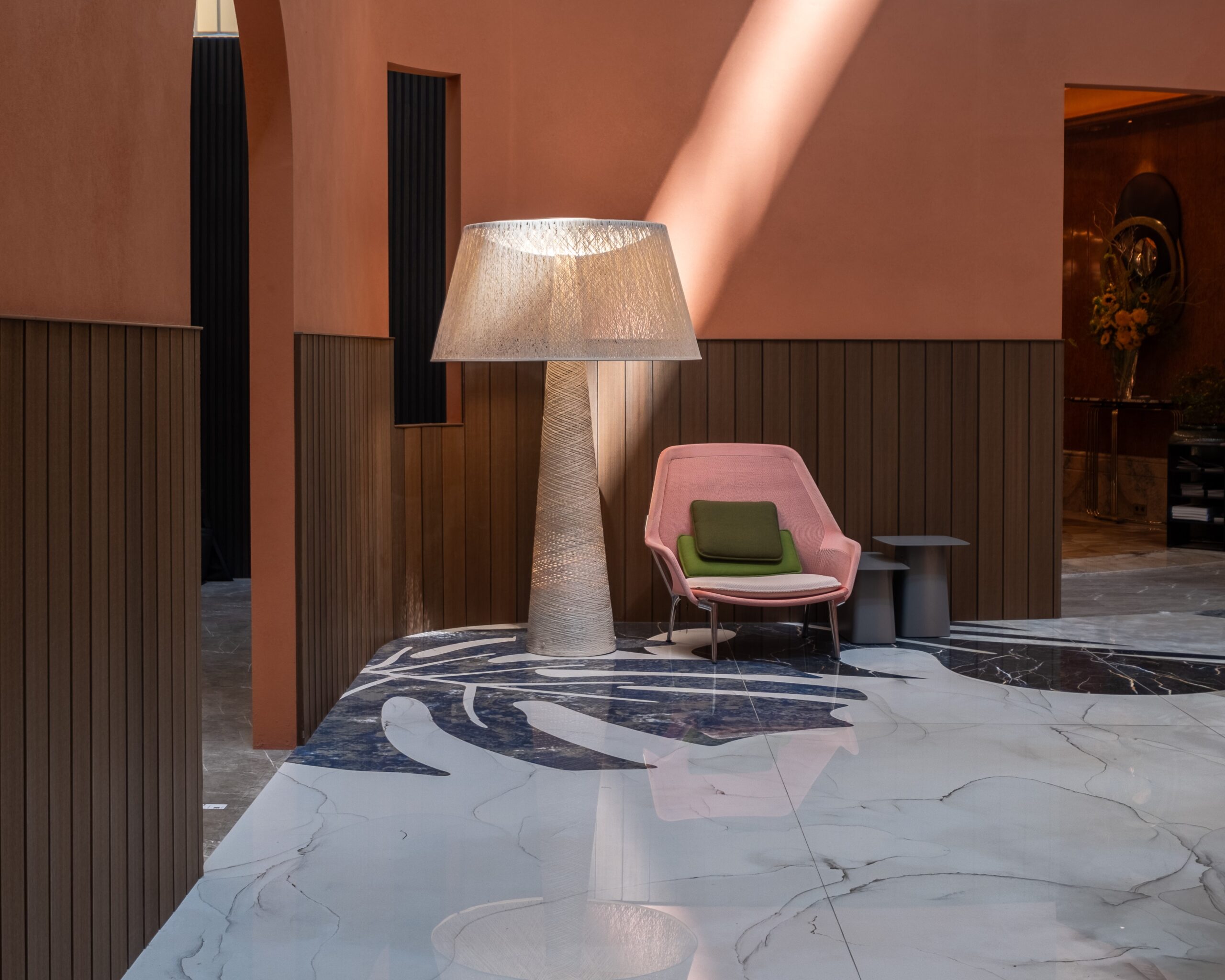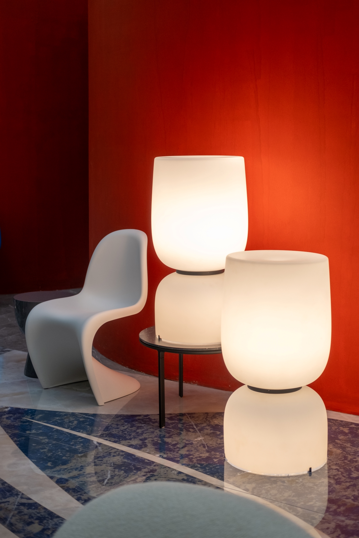 Key highlights include design icons like the Panton Chair by Vitra, the Pacha Lounge Chair by Gubi, the playful Out floor lamp with its flexible arch by Vibia, the durable Open Air Coffee Table by Vipp, and the luxurious leather details of the Magenta Serving Trolley by Pinetti.