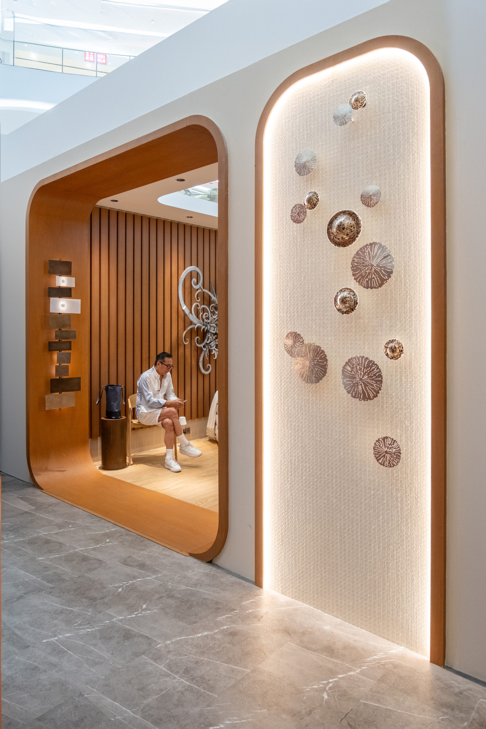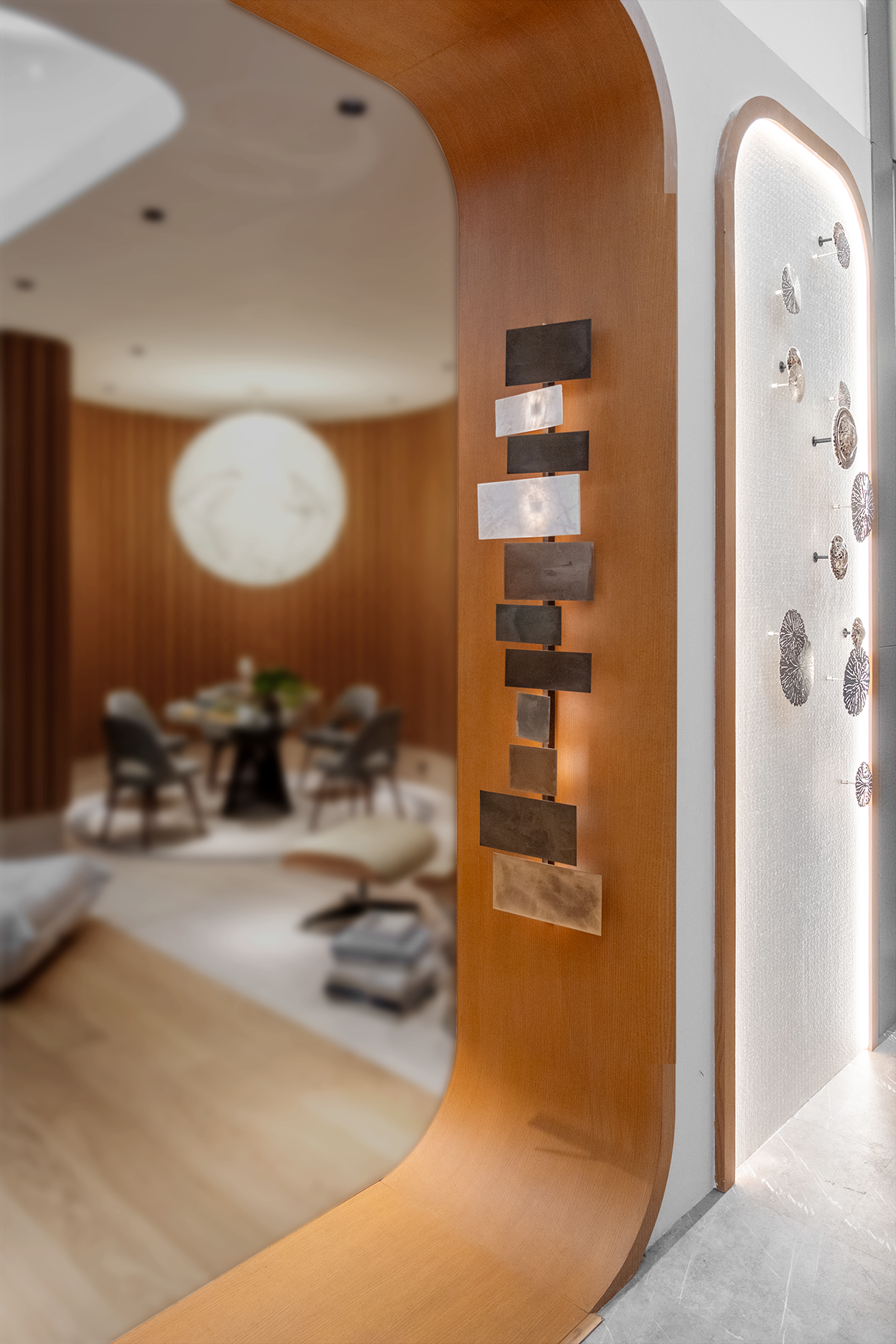 Inspired by Roland Adam’s travels to Kyoto, the space beautifully blends modern simplicity with a touch of tradition. The room captures the warmth and brightness of summer, with lighting that enhances the natural tones of the interior. Soft, warm wood paneling creates a seamless flow throughout the space, complemented by contemporary sculptural lighting elements that also serve as an elegant wall art.