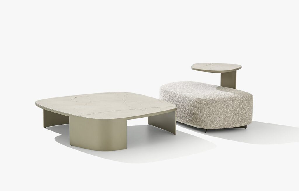 Designed as natural complements to the Saint-Germain system for their organic shapes and quiet elegance, the Koishi coffee tables accompany with personality all the sofas and armchairs in the collection. The sculptural yet minimalist metal structure supports the precious top in ebony stone, marble, reflective glass, or wood.