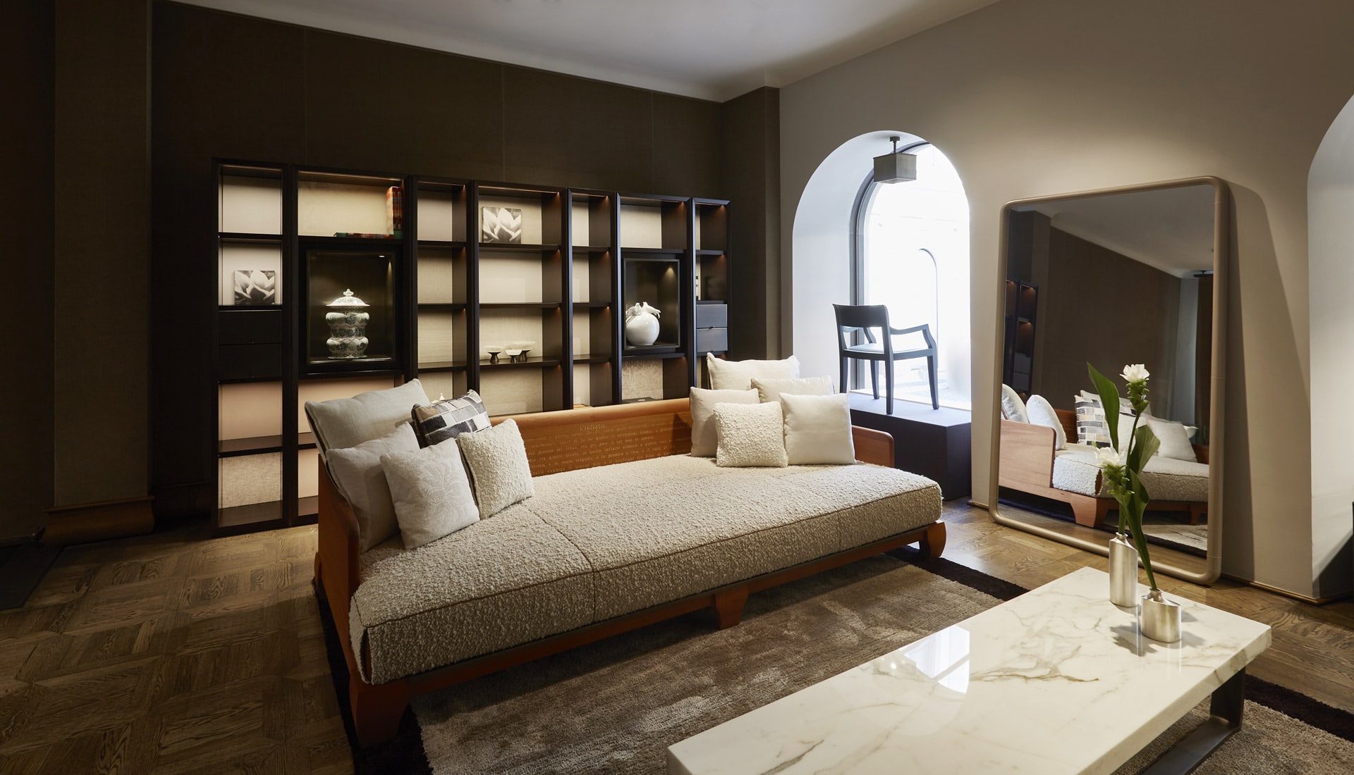 This project has now become part of the catalogue and includes specially designed pairings and finishes, almost like the creation of a sartorial gown. This ability to produce a “perfect-fit” piece of furniture, one that seems like a second skin, is something that Romeo Sozzi has always strived for in his work with Promemoria and this is now transformed into an even deeper interpretation of the concept of sustainability. A piece of furniture that metaphorically cradles the user, responds to a need for physical and emotional comfort, and becomes a companion we cannot live without. A companion with whom we will form a lasting relationship, which will be passed down to others. This applies equally to a sofa, a chaise longue and a Komodo bed, or a Campanula table lamp.