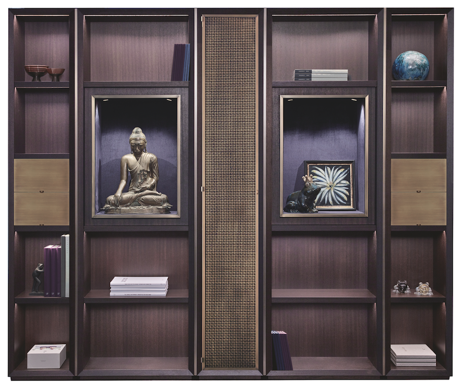 La Belle Aurore, the cabinet which, as its name suggests, is a true apparition, a discreet and hypnotic flash that illuminates the darkness. Only one side of its soul is exposed, the closed front of dark mahogany marked in the centre by a large bronze button, like a switch for turning on dreams. Or perhaps like a seal to be opened which reveals a bottle of Champagne to enjoy with a friend without telling the rest of the world. Whereas the inside is a different face: an aurora. Spaces to redefine, adjustable shelves, lights which reflect. All to be slowly discovered.