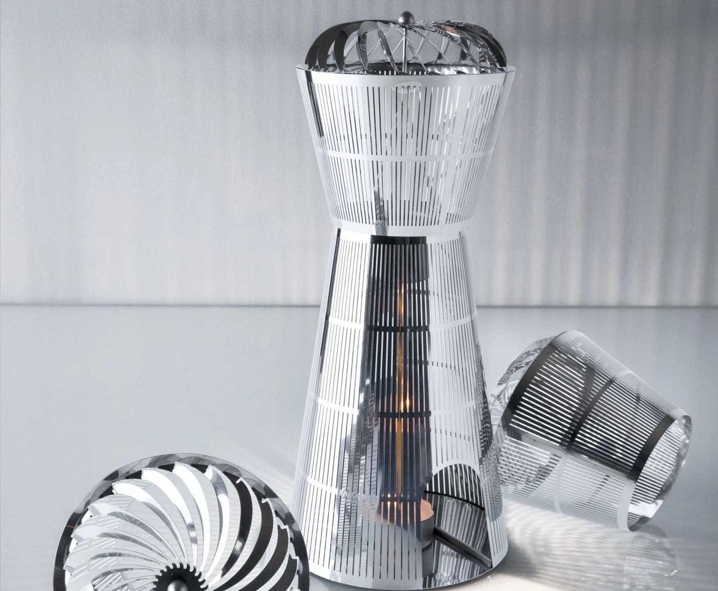 Cage is a candle-powered table top turbine, engineered to diffuse, accelerate and quickly propel fragrances to all parts of your interior. Manufactured from finely etched stainless steel, this ingenious and original kinetic product is both magical and functional. Using a single tea light that both warms the scented oil and spins the inbuilt fan, we have created an innovative slow-tech response to the plastic electronic diffusers that increasingly saturate the market.