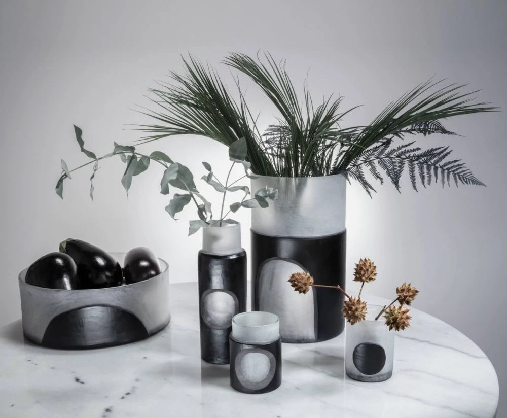 Mouth-blown, double layered black and white glass has been acutely cut back to define a series of circular motifs. Artisanal glass makers in India carefully carved away layers of glass in a design process that explores the opaque, the translucent and the transparent. The intention was for the chunky and heavy glass to take on an ethereal lightness.