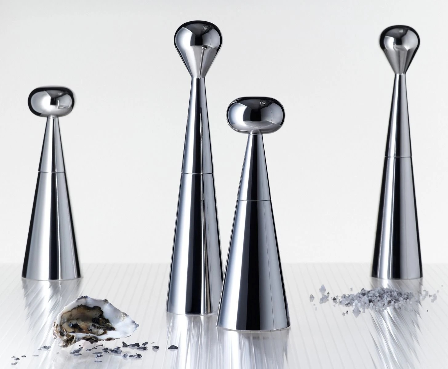 Salt and pepper play a heroic role in the kitchen. Mill is a set of grinders with expressed handles and sleek conical silhouettes made of stainless steel. Mill grinder has expressive handles and a sleek conical silhouette made of stainless steel. Created with longevity in mind, the vessel is designed with a robust mechanism that has been developed by experts. The stainless steel finish allows the grinder to be easily cleaned, and meets catering quality standards.