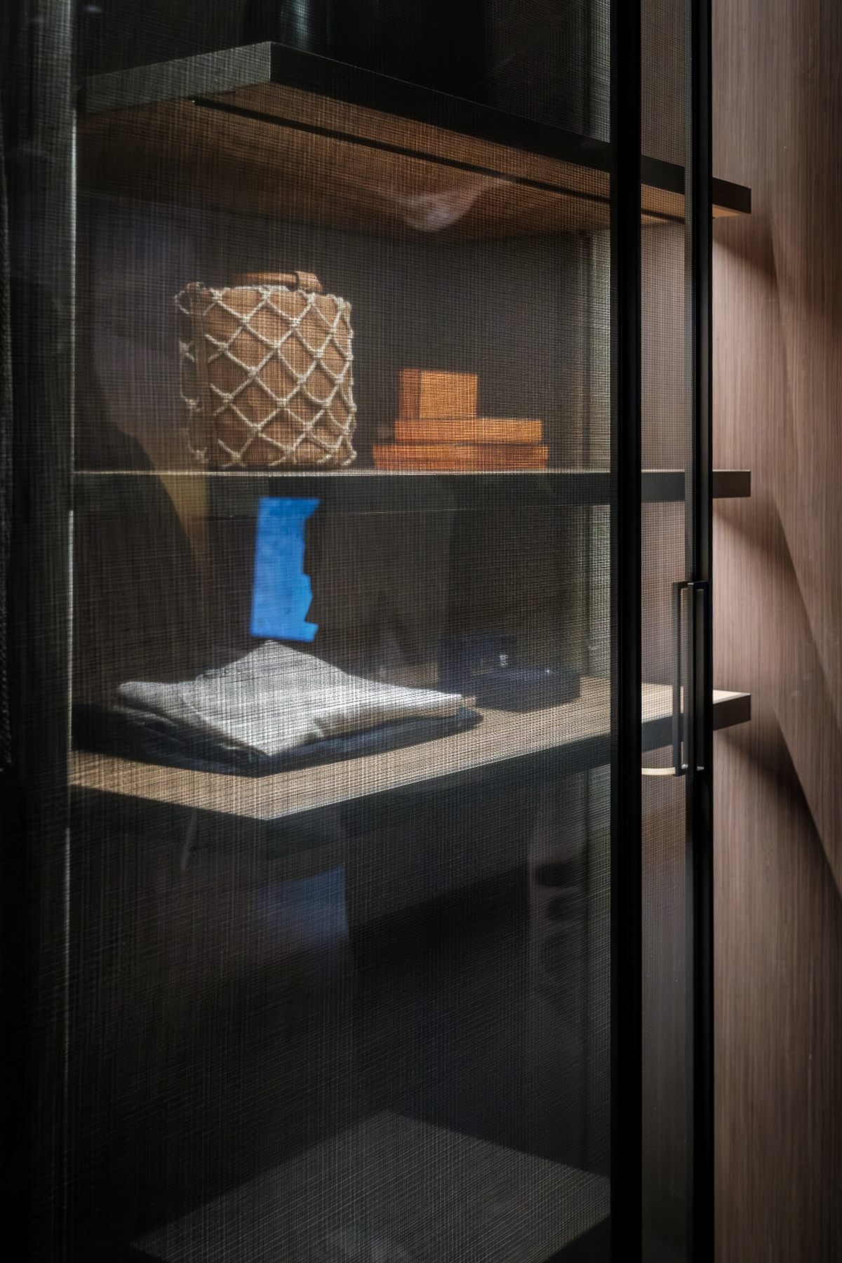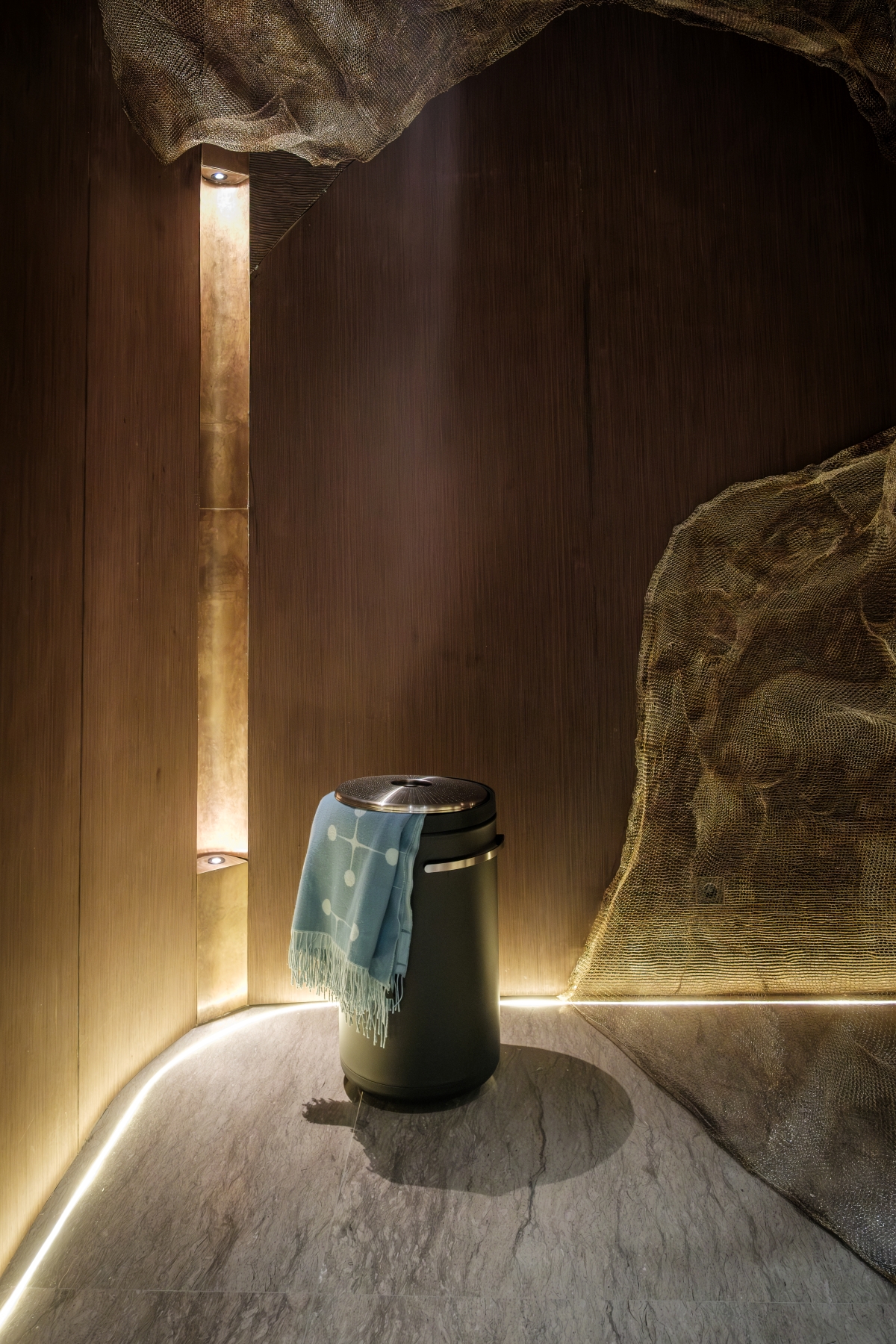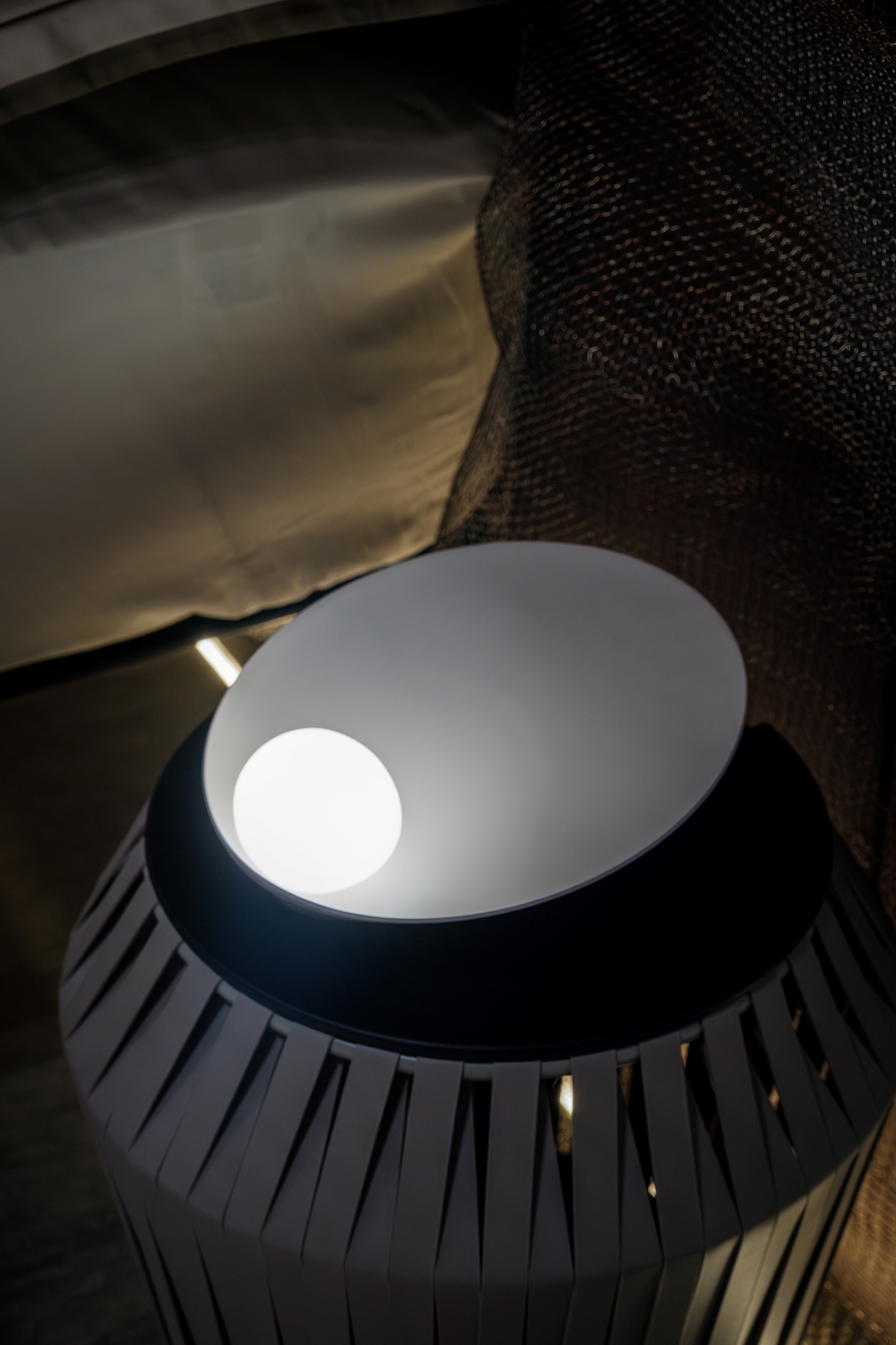 He draws from the ocean: waves that look powerful from a distance yet become unexpectedly soothing once you move within their rhythm. That duality shapes the room’s language, interpreted through woven metalwork from Sumba formed into a soft, enveloping canopy that moves like water held in place.