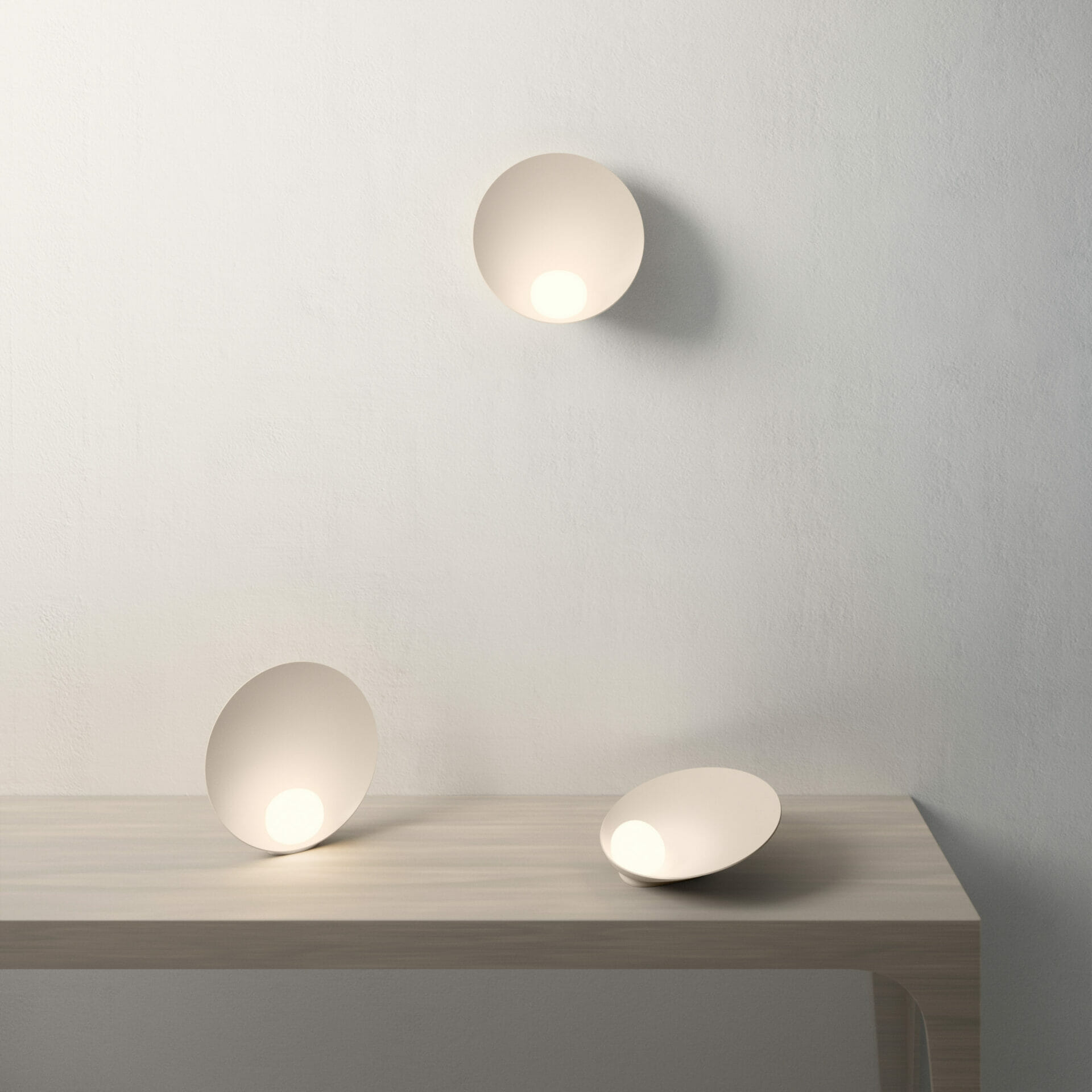 The concave curves of MUSA by Note Design Studio, a collection of wall sconce, table and floor lamps that combine hand blown opal glass and feminine reflective surfaces.
