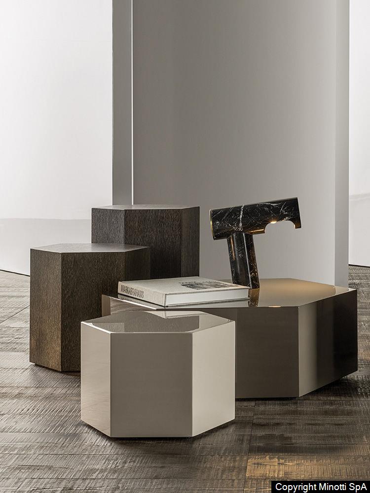 The fascination of the hexagonal prism derives from its many light-reflecting facets, a quality that is enhanced by glossy lacquer finishes in four sophisticated shades: Corten, Petroleum, Sand and Mud.