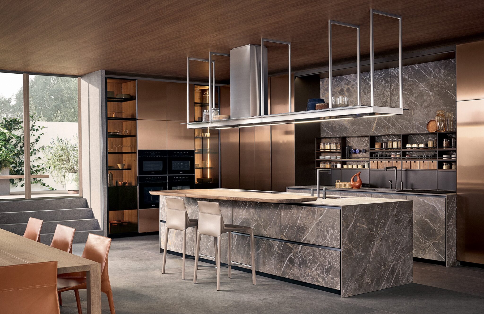 A restyling of the iconic and consolidated Alea model, Alea Pro is characterized by the most marked expressiveness. The linear design of the original system has been reinterpreted in light of a redefinition of the details, in particular of the opening grooves, underlined by a profile that highlights the vertical and horizontal lines. The door design with a chamfered upper edge upper edge and handle profile matched to the profile is new, as is the detail of the spaced side panel, which gives a lighter look to the base units. The display doors for base units, wall units, and tall units create plays of transparency that give rhythm to the composition. The result is a kitchen system that combines a very high operational capacity with a contemporary look, to be customized with a very wide range of materials and finishes.