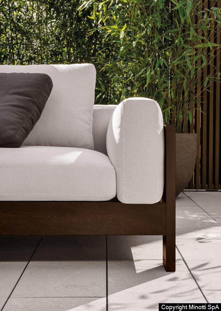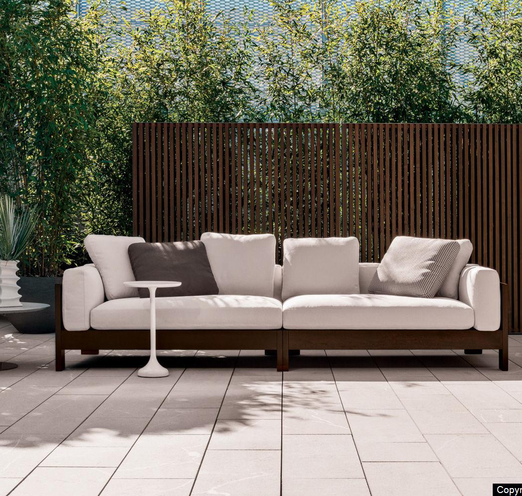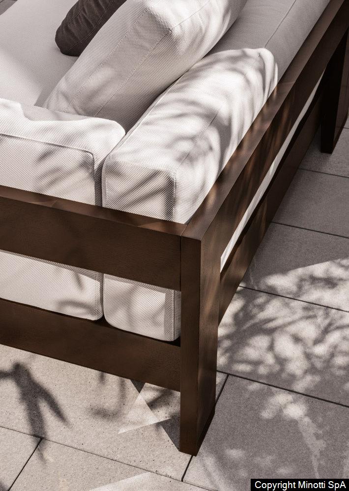 The Alison “Dark Brown” Outdoor sofa is raised off the ground on 3,5 cm high anodized aluminum blocks, groove-mounted and stained the same color as the wood, to prevent direct contact with the paving and thus protect the frame from moisture. In the new seating system, even the cushions have been redesigned to convey the air of casual elegance that sets Alison “Dark Brown” Outdoor apart. Specifically, the cushions have been made softer, thanks to the use of new inserts in high resilience variable-density polyurethane foam, sheathed in eco-friendly water-repellent fiber.