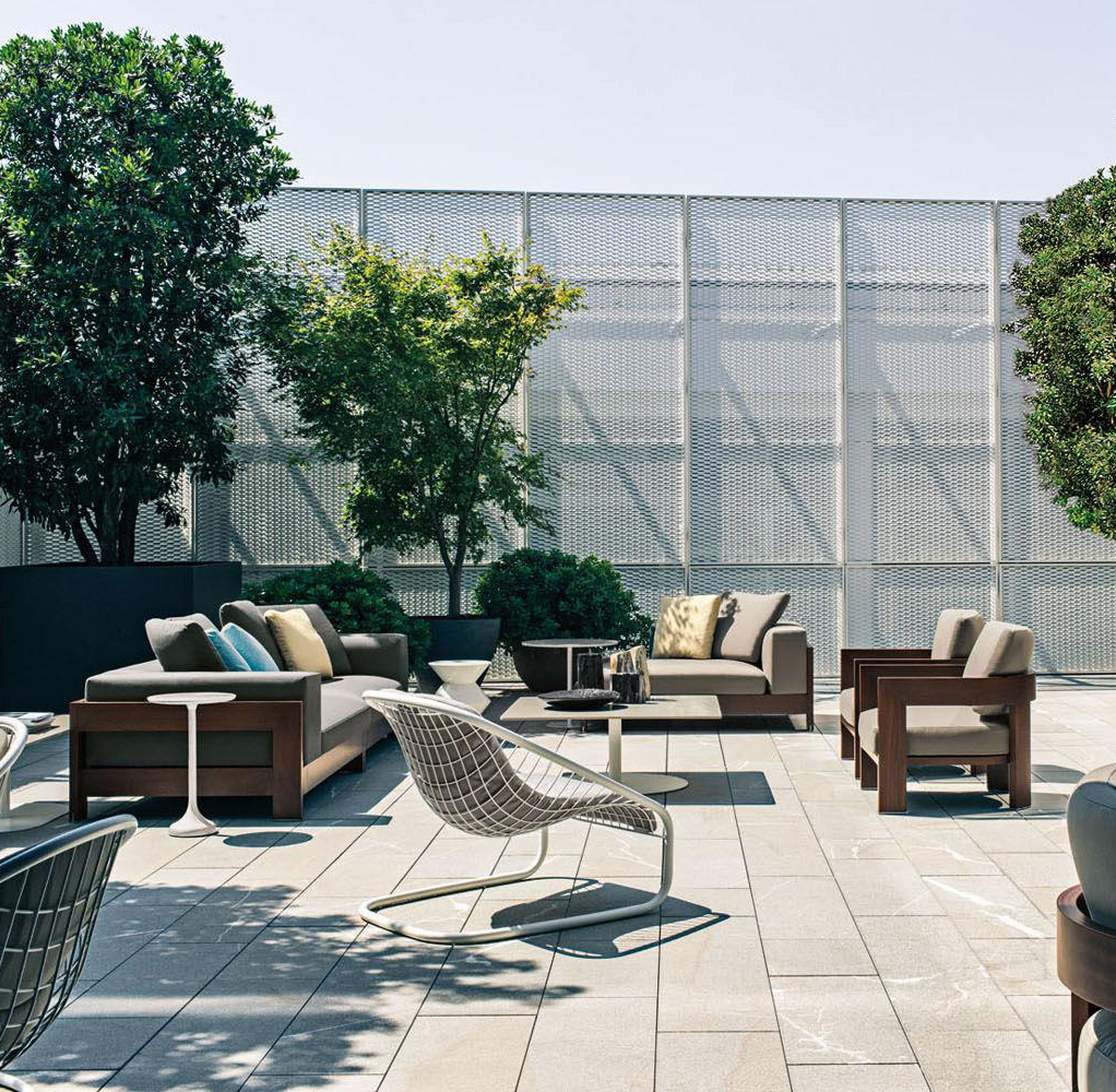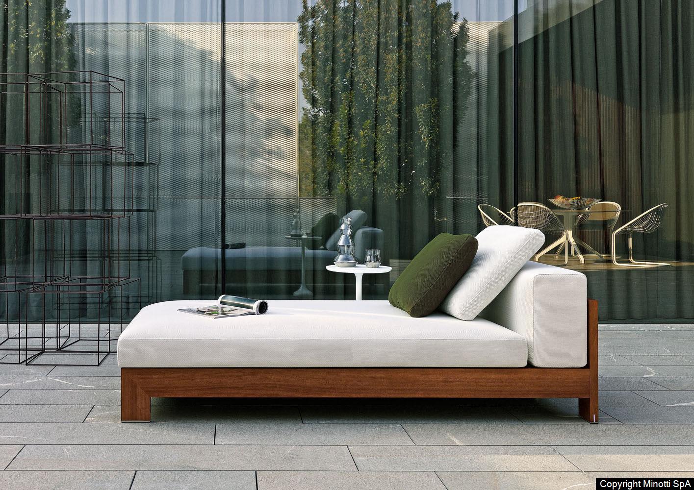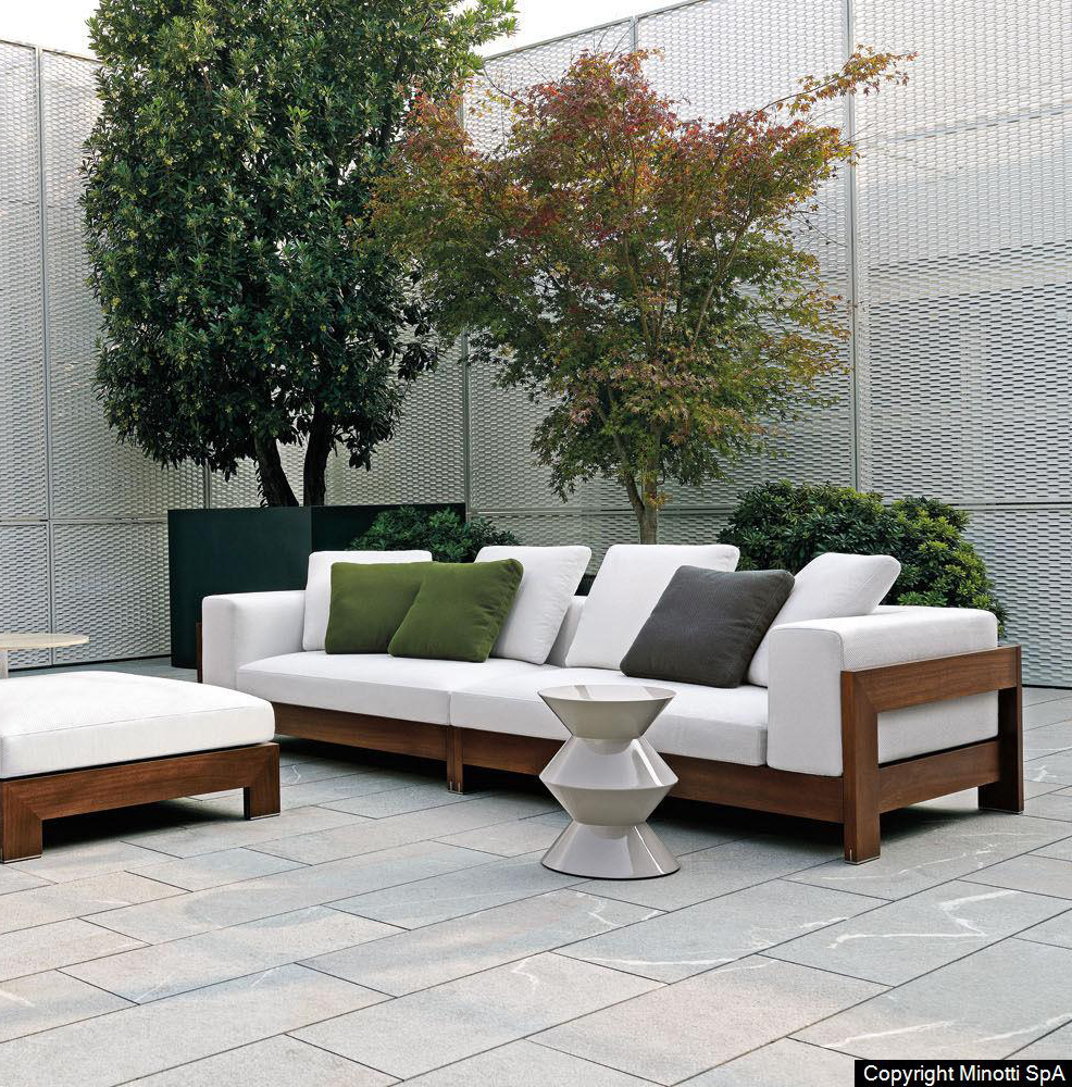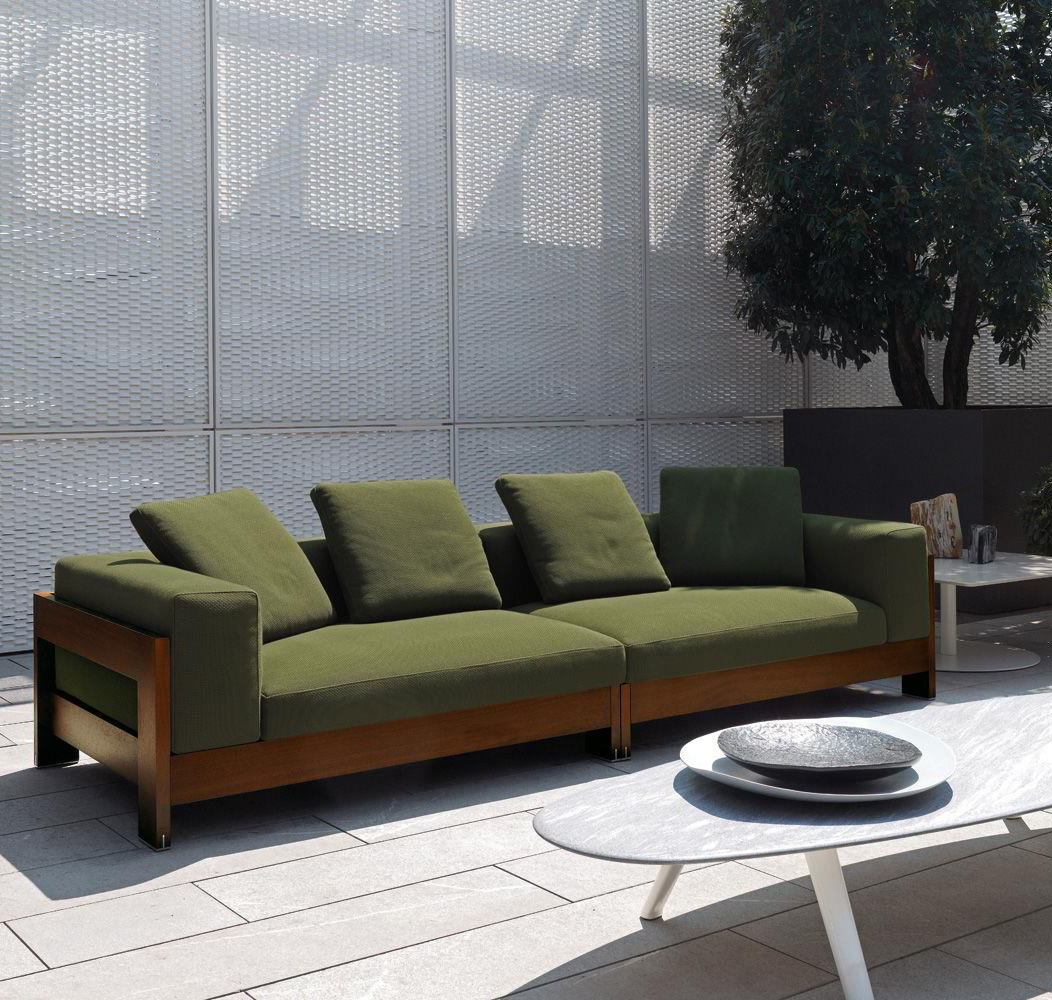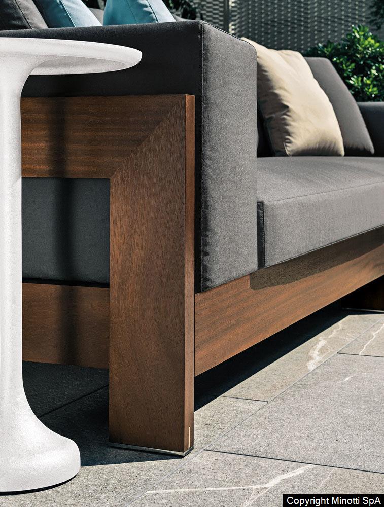 A seating system designed in 2006, and now in its iroko version, in a way foreshadowed the concept of the Lifescape Collection. In other words, a range of furnishings whose use was specifically designed for both indoor and outdoor use. The sleek design of Alison Iroko Outdoor, with its simple squared-off lines, finds its ultimate expression in the choice of iroko heartwood for its exposed frame. Its warm color and smooth touch, thanks to the natural finish, lend the frame a bold look and play up the architectural details, like the 45° angle joint on the arms.The clean lines of the frame are matched by the seat, back and armrest cushions that share the same square shape, but are generously padded. A new, exclusive collection of exterior fabrics, available in sophisticated colors and textures, lends a crisp, lively note to the Alison Iroko Outdoor sofas. Iroko wood furniture frames rest on stainless steel tips set into slots in the wood. This technique eliminates direct contact between the wood and the outdoor surface as a safeguard against damage due to humidity.