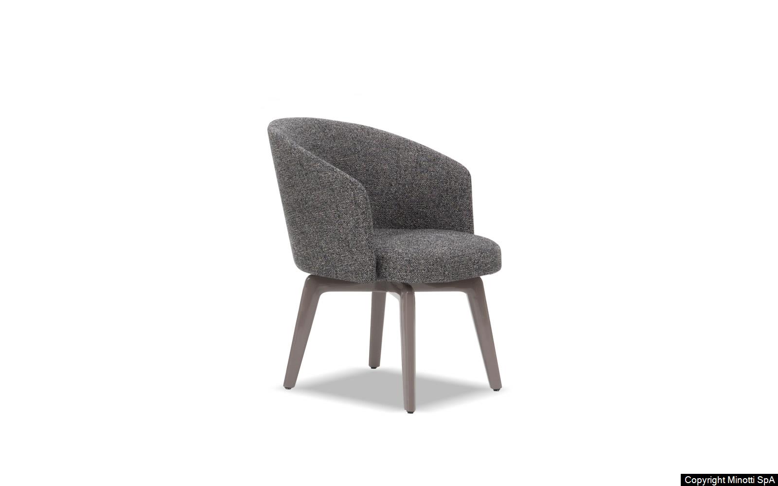 The padded structure is made of a cold-formed foam shell covered in soft padding and rests on a base available in two finishes: solid ash with open-pore Chestnut or Moka stain and solid beech with glossy lacquer finish in Sand, Granite or Mud. The option to choose the base, and the many different upholstery selections available for the seat, make Amélie an especially versatile chair that can lend understated elegance to any type of decor. The Amélie little armchair comes in versions with fixed or swivel base and can be paired with all the tables in the collection.