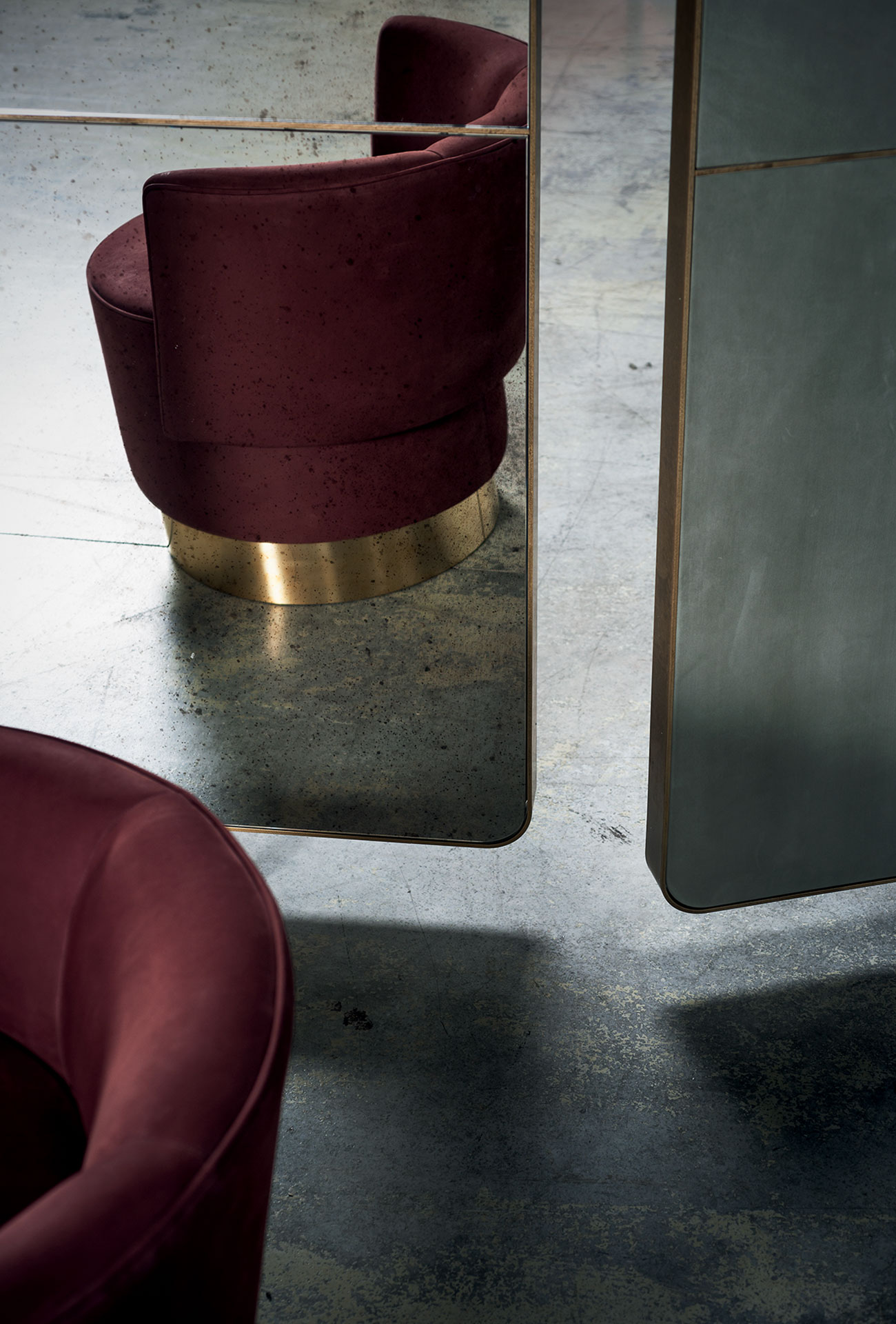 Seat and backrest frame in beech plywood. Base covered with satin-finished brass, in hand-finished burnished metal or in satin nickeled metal, with matte paint. On request it is possible to have the base in a different metal, with a surcharge to be defined according to the metal chosen. Differentiated density polyurethane foam filling with acrylic fibre covers. Decorative piping and button in the same shade of leather; upon request, it is possible for the decorative piping and the button to be in the other shades of leather shown in the catalogue. Available in all soft leathers.
