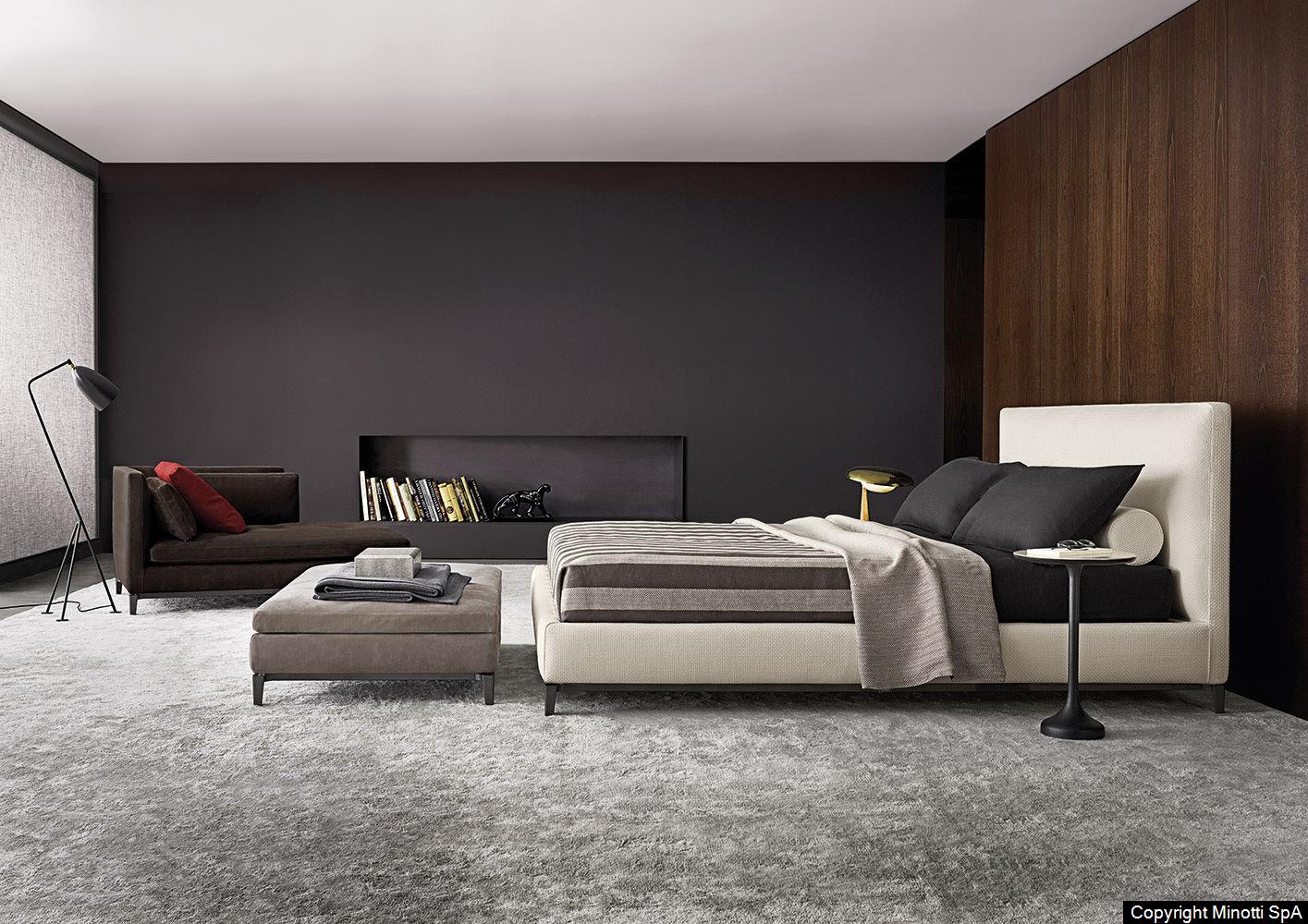 The aesthetic values of the Andersen seating system are reiterated in the bed of the same name, featuring balanced lines and raised frame with elegant feet in Pewter-colored finish.