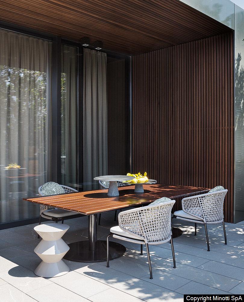 The Aston “Cord” Outdoor collection comes with a pewter colour polyester-painted metal frame specially treated for exterior use, as are the padded cushions, which are covered in waterproof fabric. The seat back is in a special braided 7 mm diameter polypropylene cord, available in the following colour variations: Light Gray, Dark Brown, Sand, Sunflower, Khaki Green and Rust, a perfect match for the fabrics in the Art Lifescape 02 textile collection and the shade of Alison “dark brown” outdoor. The painted metal frame is finished with a special polyester paint for exterior use in Pewter colour and the seat back is in a special braided polypropylene cord, available in two colour variations: light grey and dark brown. The seats feature an exclusive Minotti Studio laser-cut geometric design. Inner padding of the cushions is in highly durable expanded polyurethane covered in water repellent fibre.