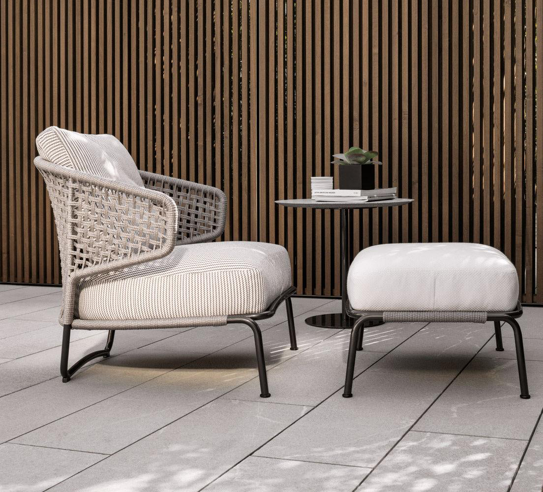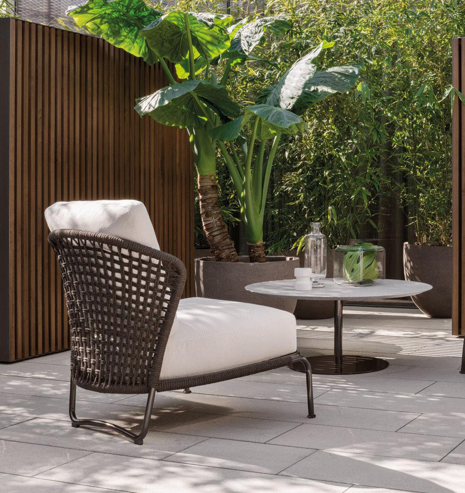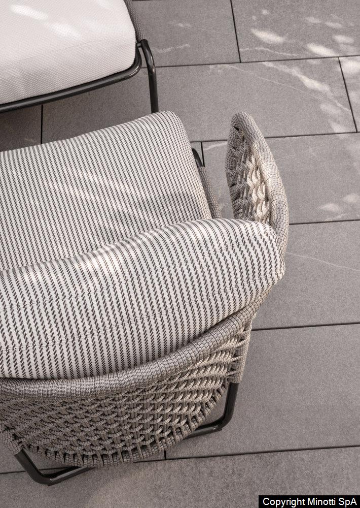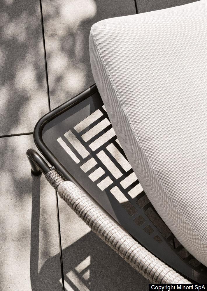 The Aston “Cord” Outdoor collection comes with a pewter colour polyester-painted metal frame specially treated for exterior use, as are the padded cushions, which are covered in waterproof fabric. The seat back is in a special braided 7 mm diameter polypropylene cord, available in the following colour variations: Light Gray, Dark Brown, Sand, Sunflower, Khaki Green and Rust, a perfect match for the fabrics in the Art Lifescape 02 textile collection and the shade of Alison “dark brown” outdoor. The painted metal frame is finished with a special polyester paint for exterior use in Pewter colour and the seat back is in a special braided polypropylene cord, available in two colour variations: light grey and dark brown. The seats feature an exclusive Minotti Studio laser-cut geometric design. Inner padding of the cushions is in highly durable expanded polyurethane covered in water repellent fibre.