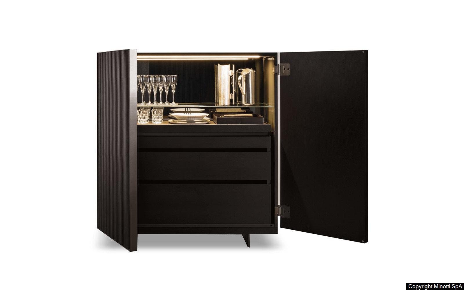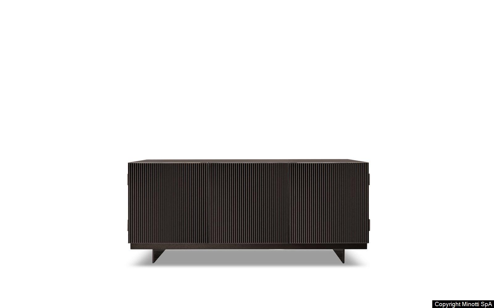 The sophisticated workmanship that distinguishes the Aylon family of cabinets traces back to the heritage of cabinet-making typical of Italy’s Brianza area.The sleek shapes combine with a taste for refined details, like the unusual workmanship on the doors, created through the use of turned strips of solid oak, with open pore Moka color lacquer finish, set into an elegant metal frame with a matt Pewter color finish. The meticulous attention focused on each construction detail is also evident in the hinges, crafted from an exclusive Minotti Studio design. The hinges can be adjusted for height, width and depth and allow the doors to open 190 degrees. The structure comes in glossy lacquer Sand, Clay or Granite finish. The Aylon series includes two sideboards, a cupboard and a living-space unit featuring a clever play of shapes, with a lateral projecting storage element.