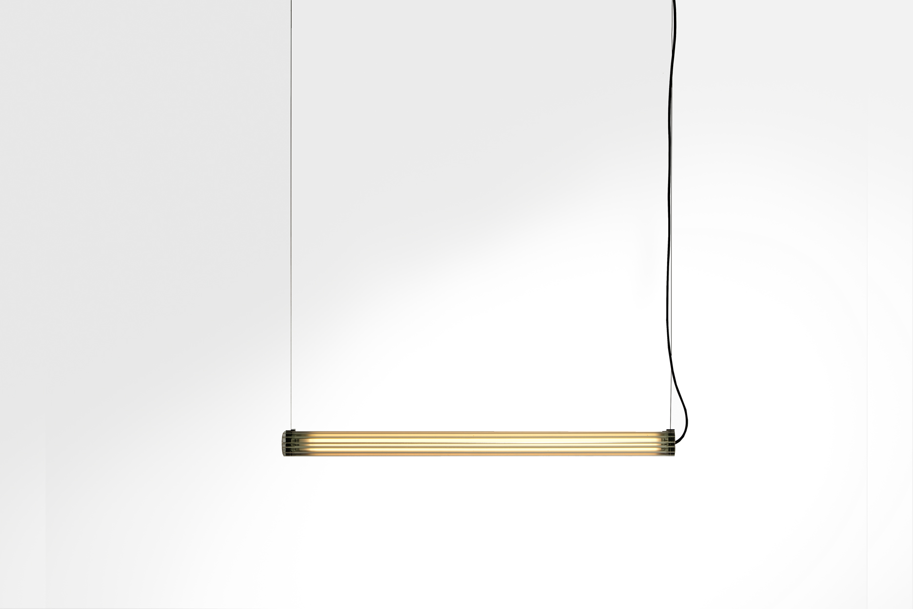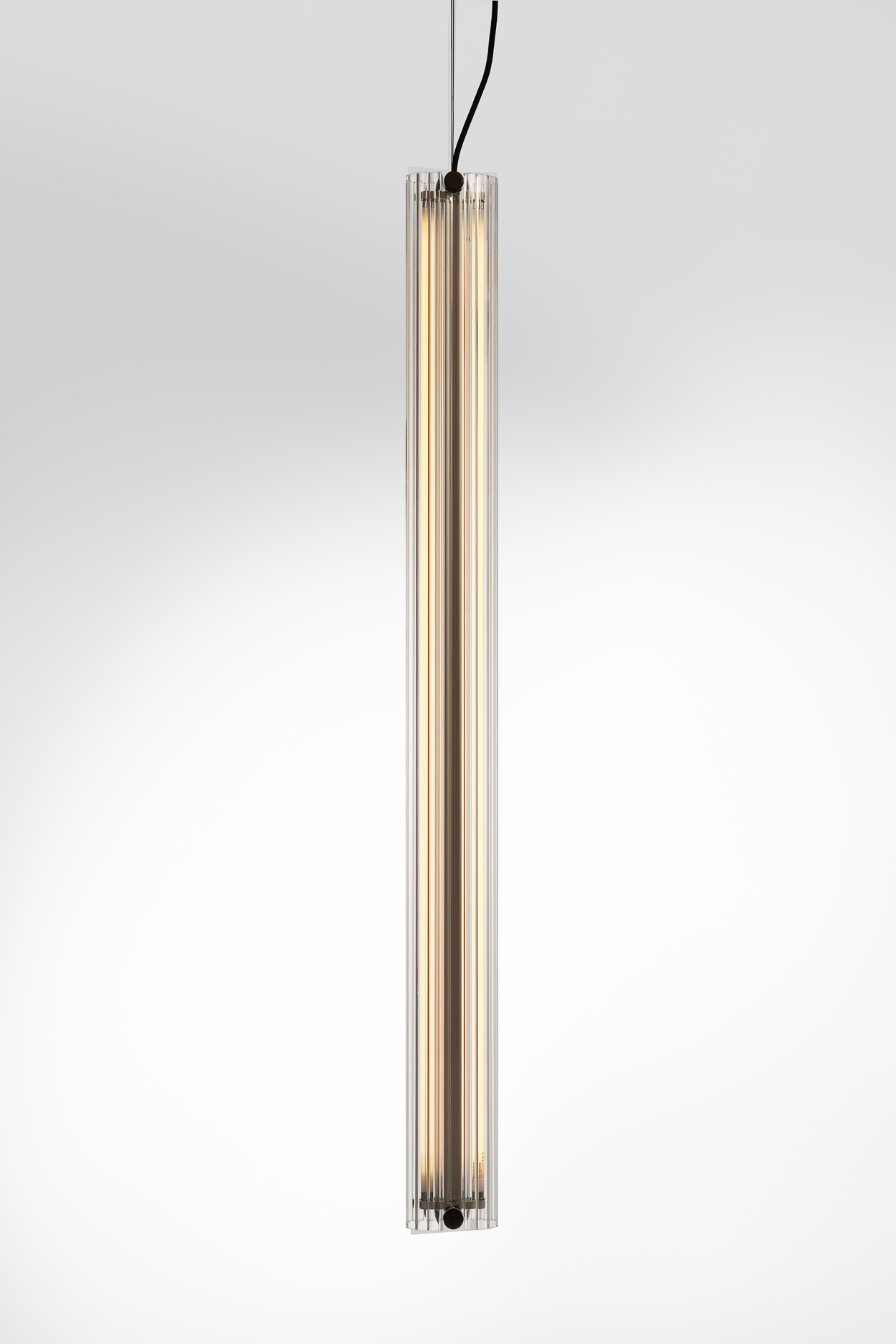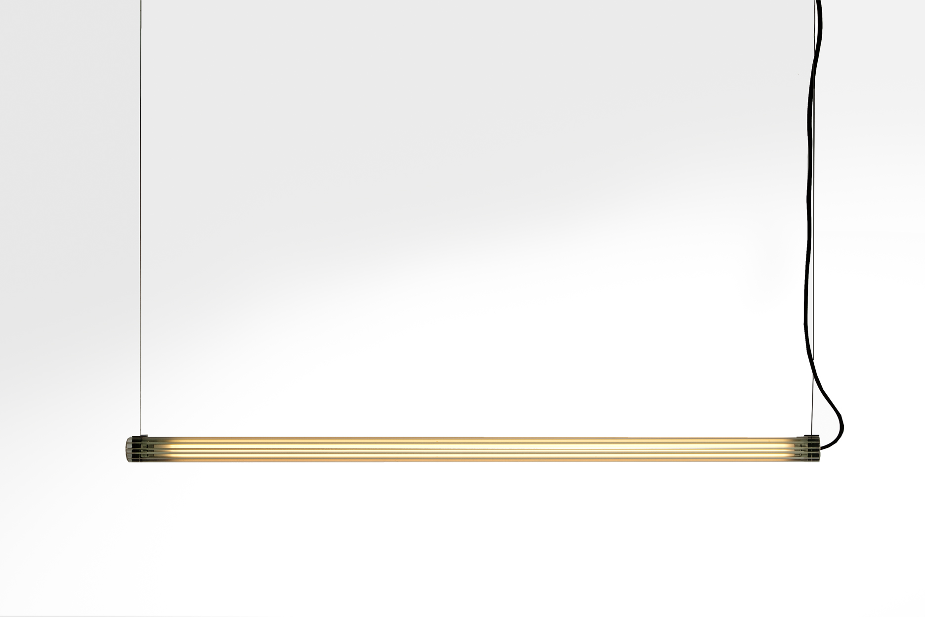 Suspension lamp. Aluminium structure, graphite anodized. Extruded transparent glass difusser. Dimmable and no dimmable options.