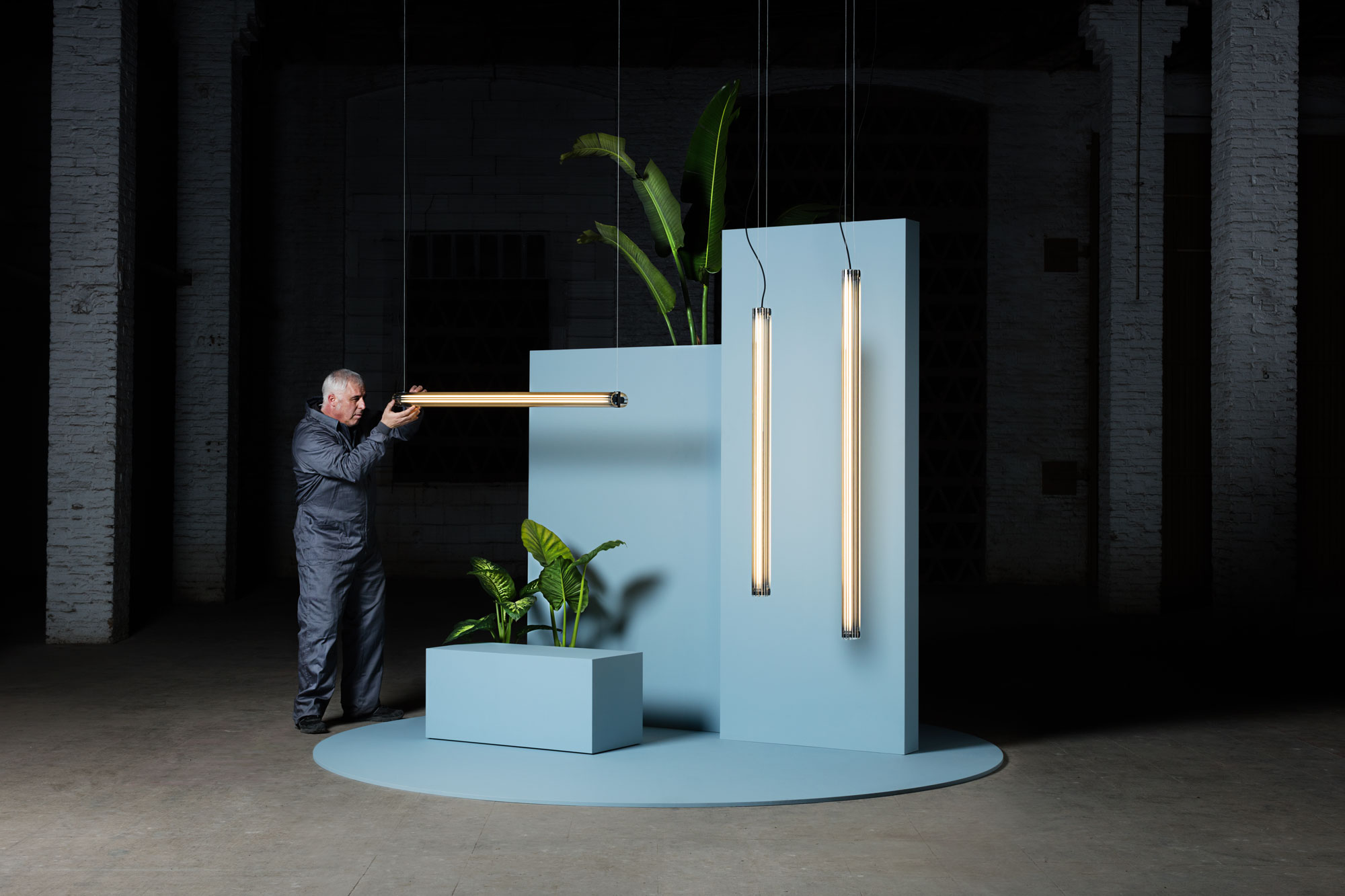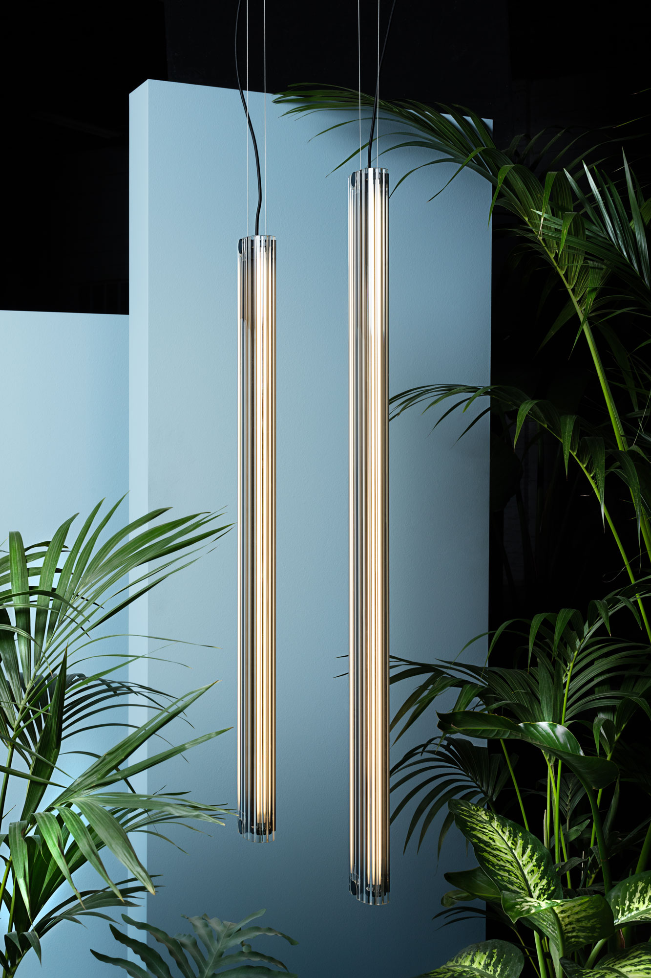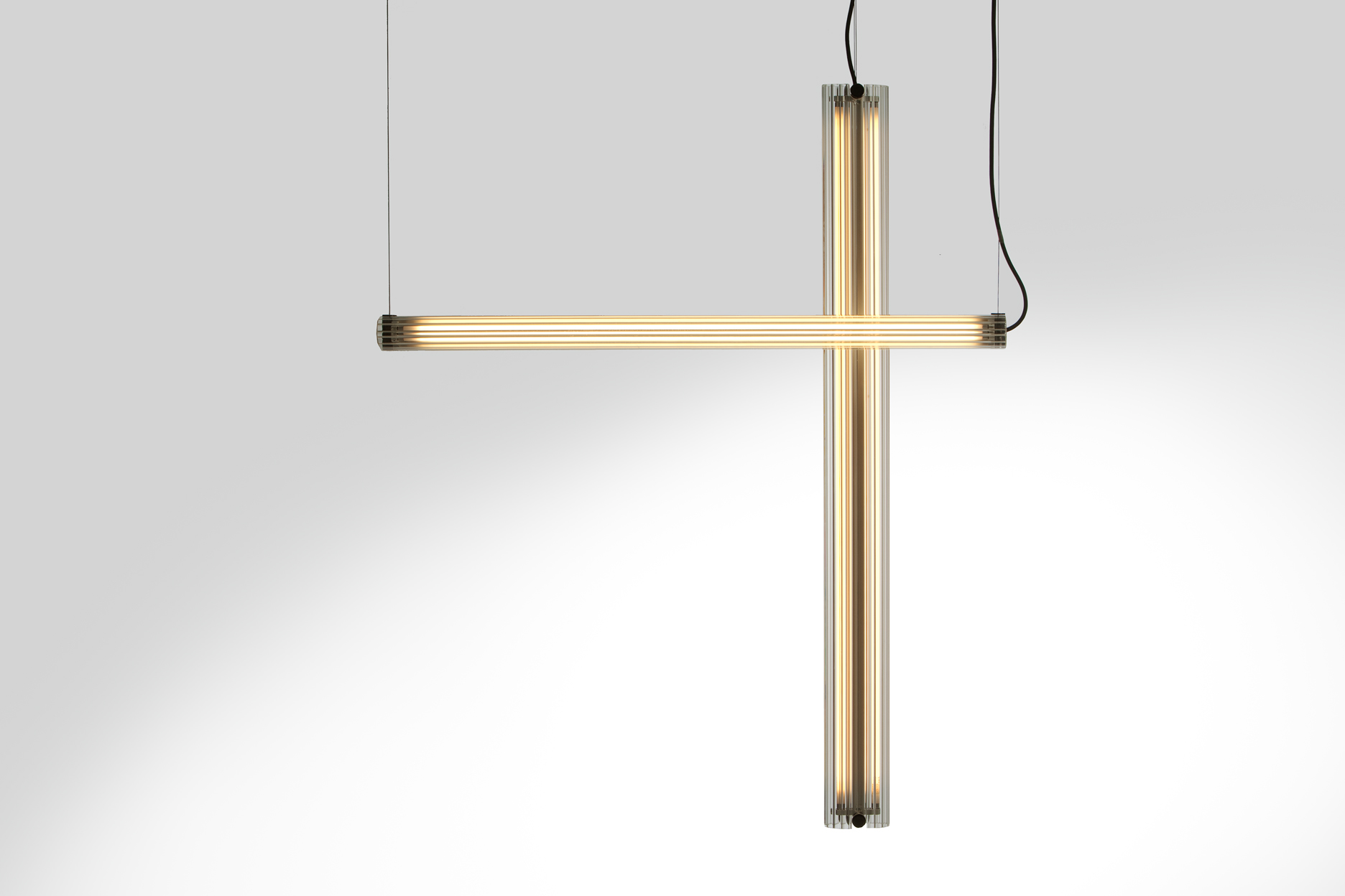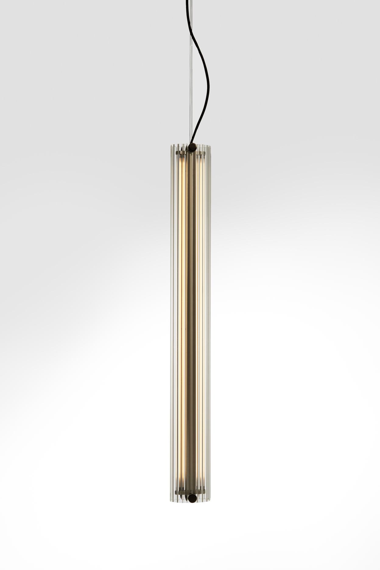 Suspension lamp. Aluminium structure, graphite anodized. Extruded transparent glass difusser. Dimmable and no dimmable options.