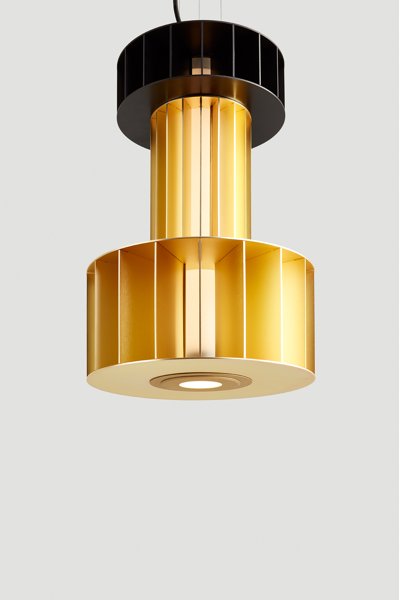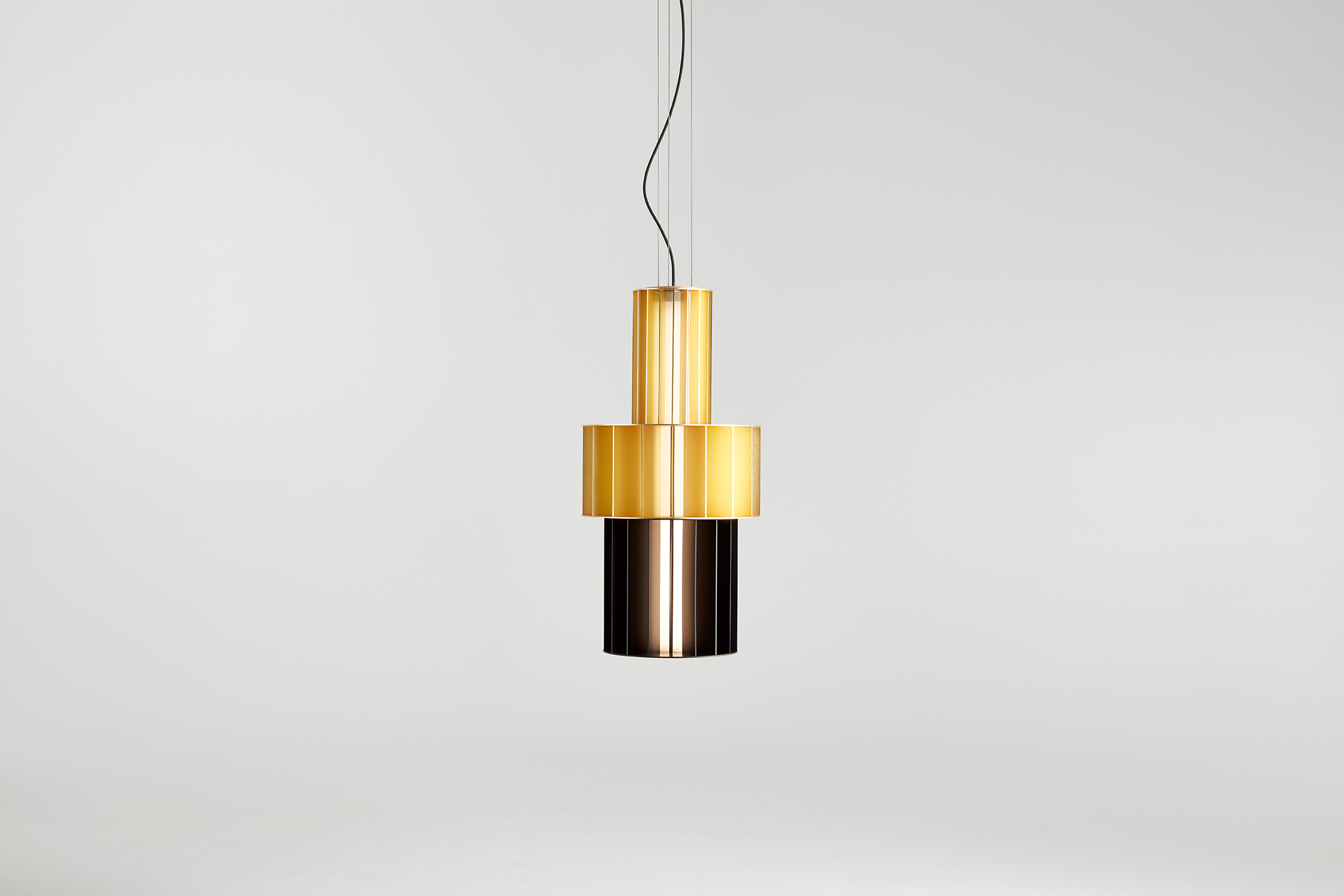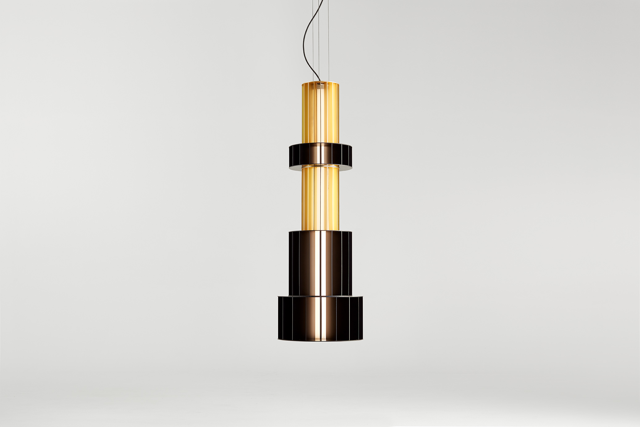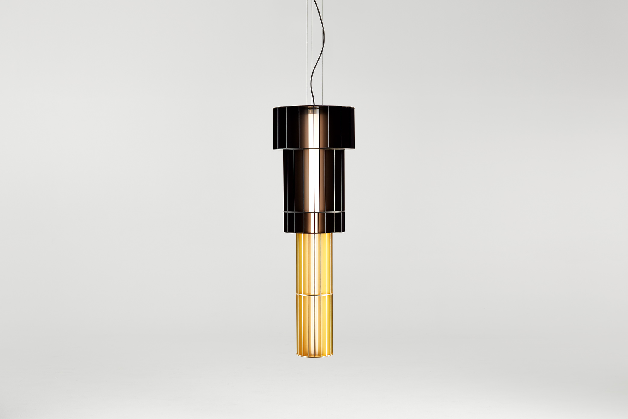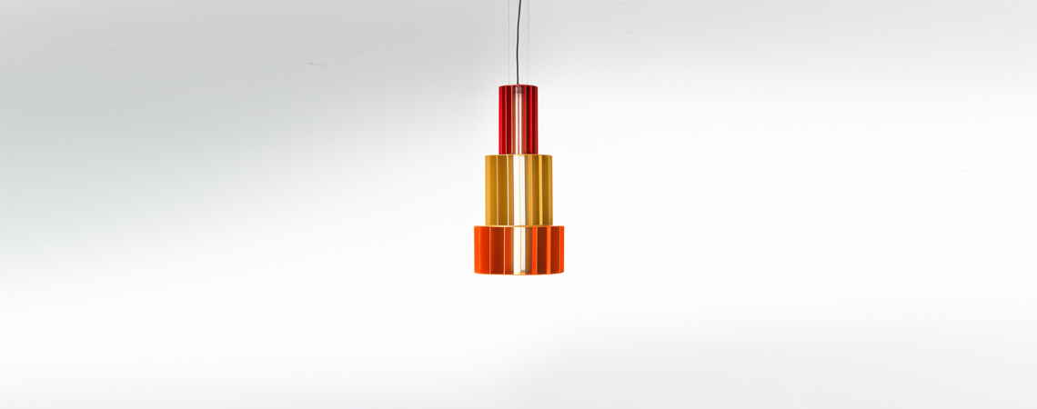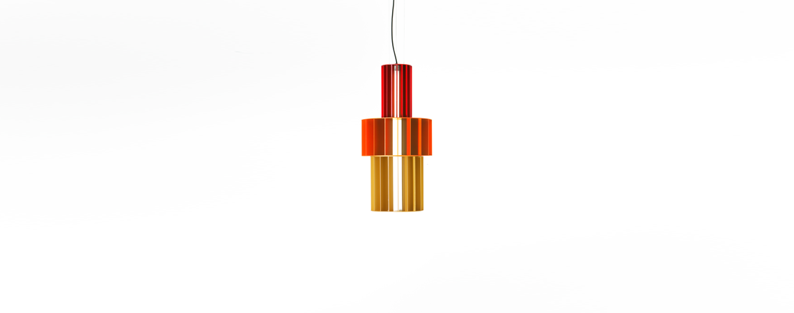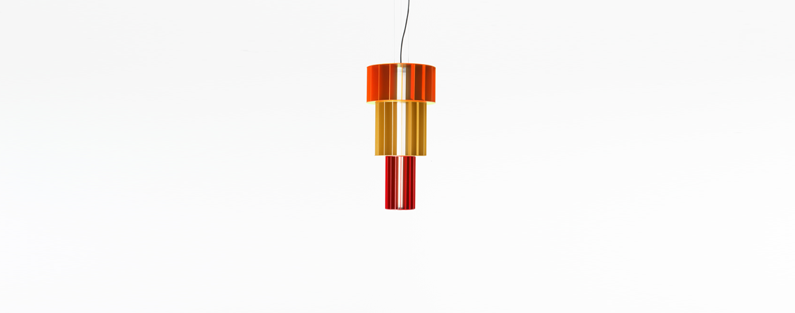 Suspension lamp. Unlimited options can be created by combining the modules in anodized aluminium yellow, orange and red. We offer two light source options: strip led column+module led on the bottom or only strip led column.