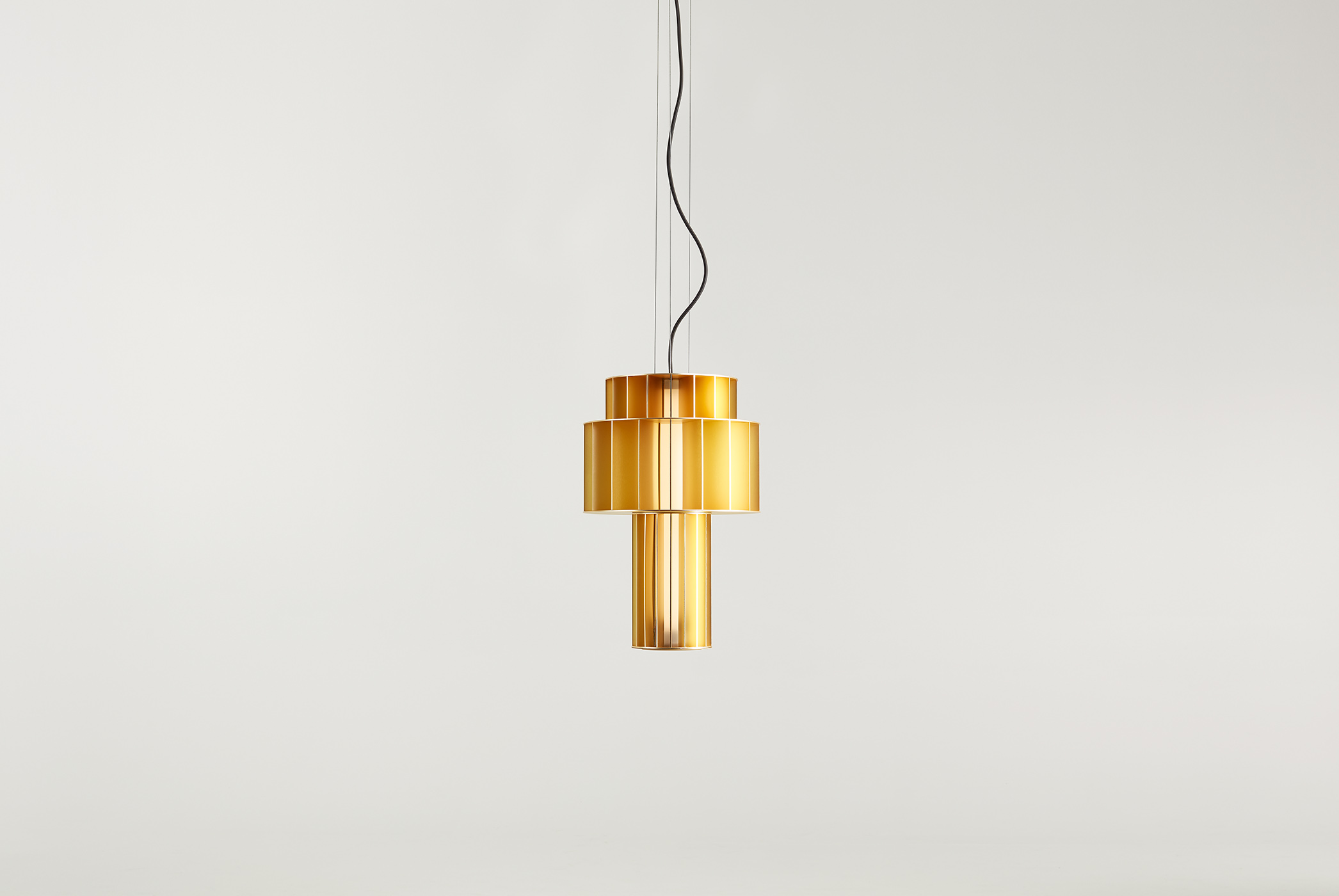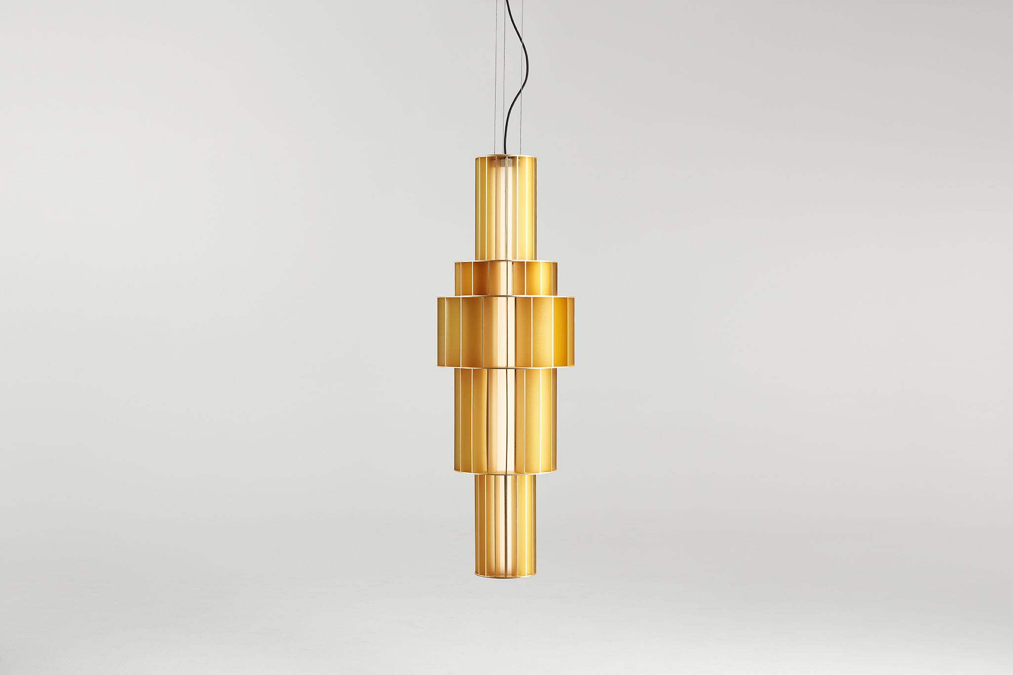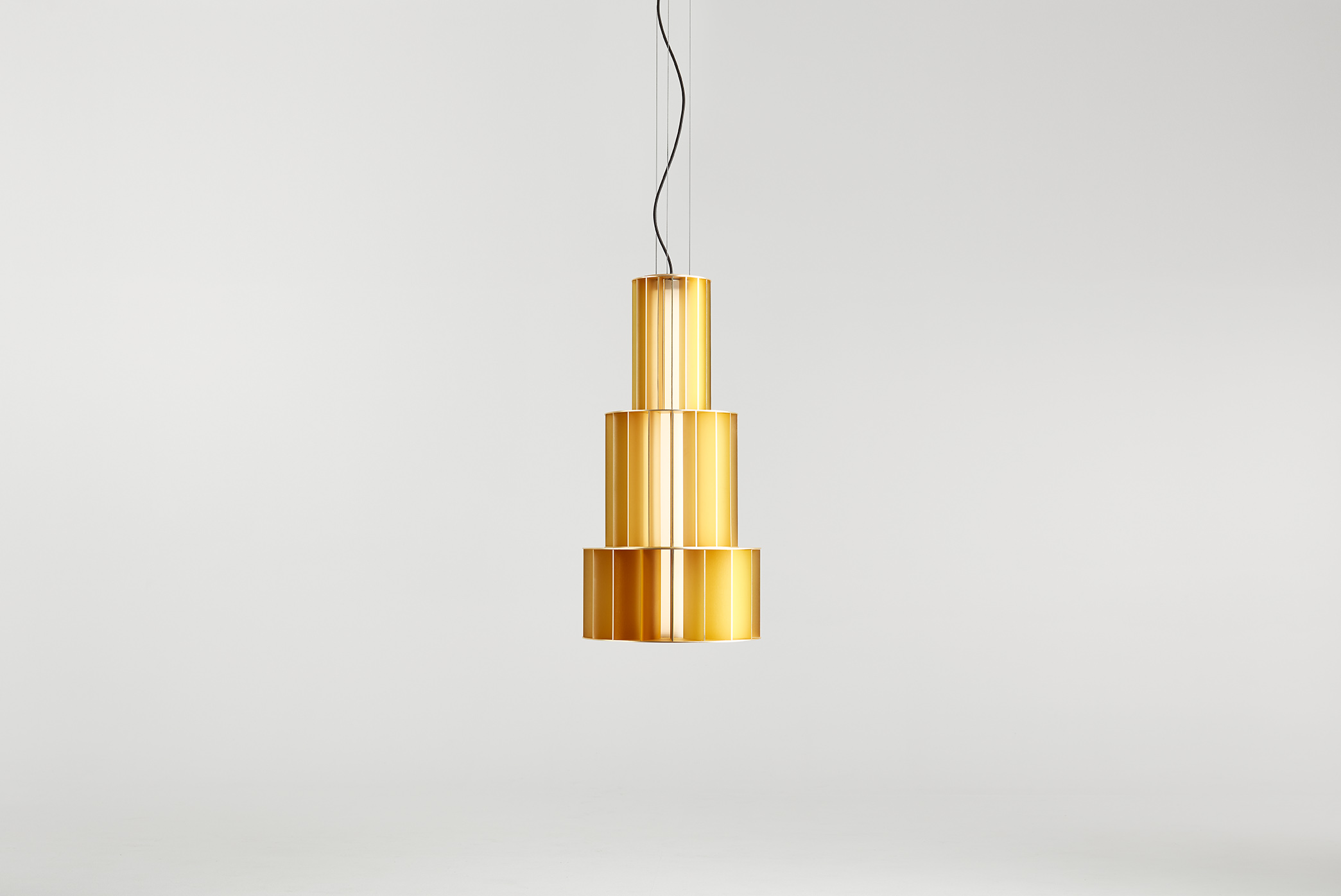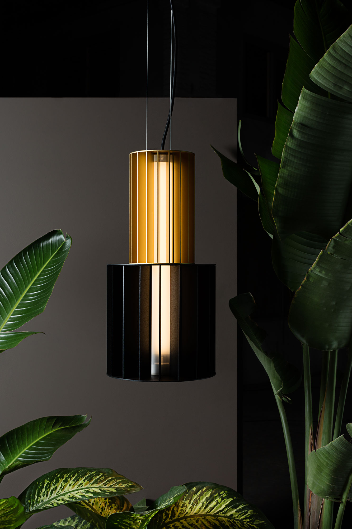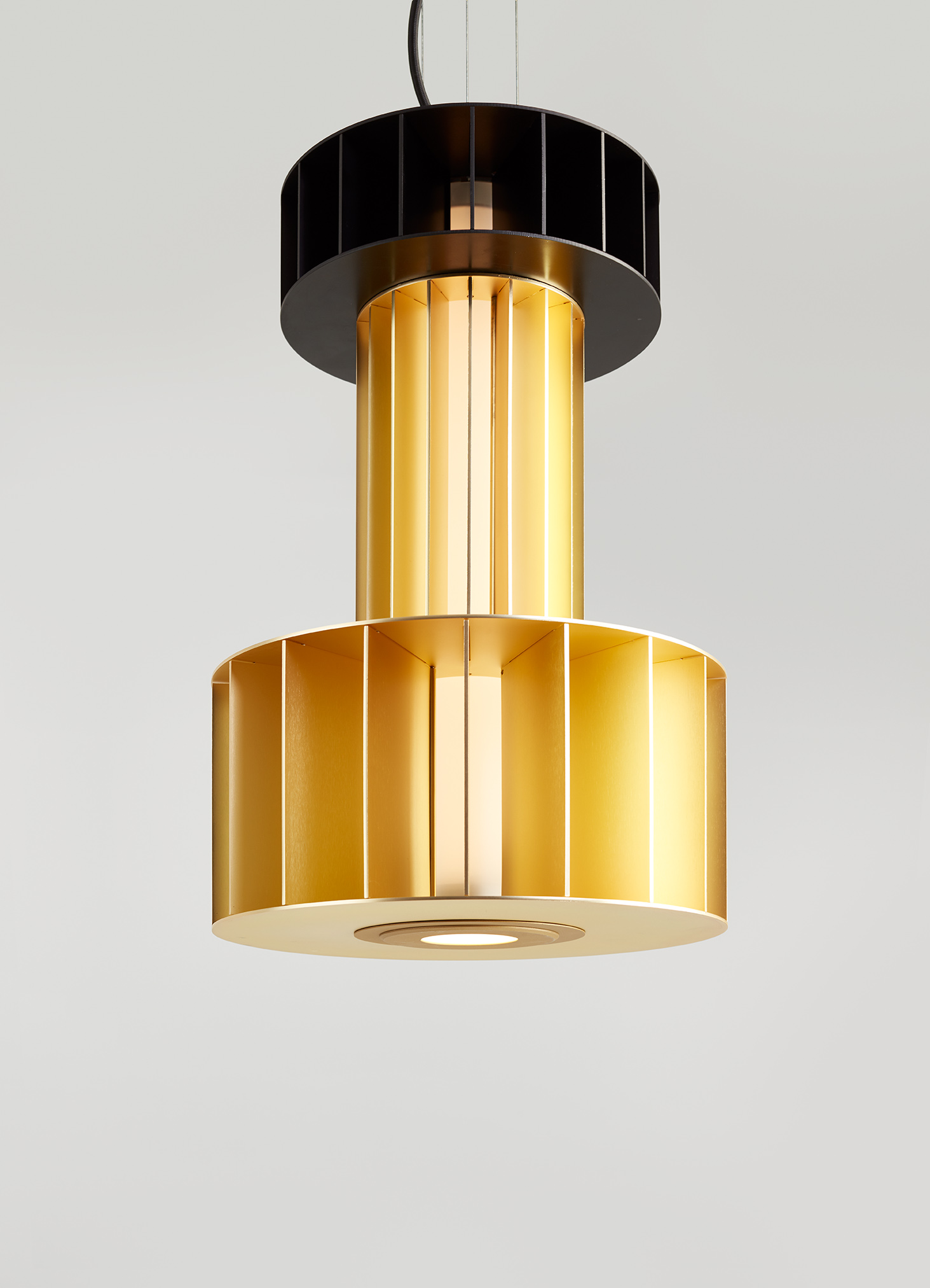 Suspension lamp. Unlimited options can be created by combining the modules in anodized aluminium yellow, orange and red. We offer two light source options: strip led column+module led on the bottom or only strip led column.