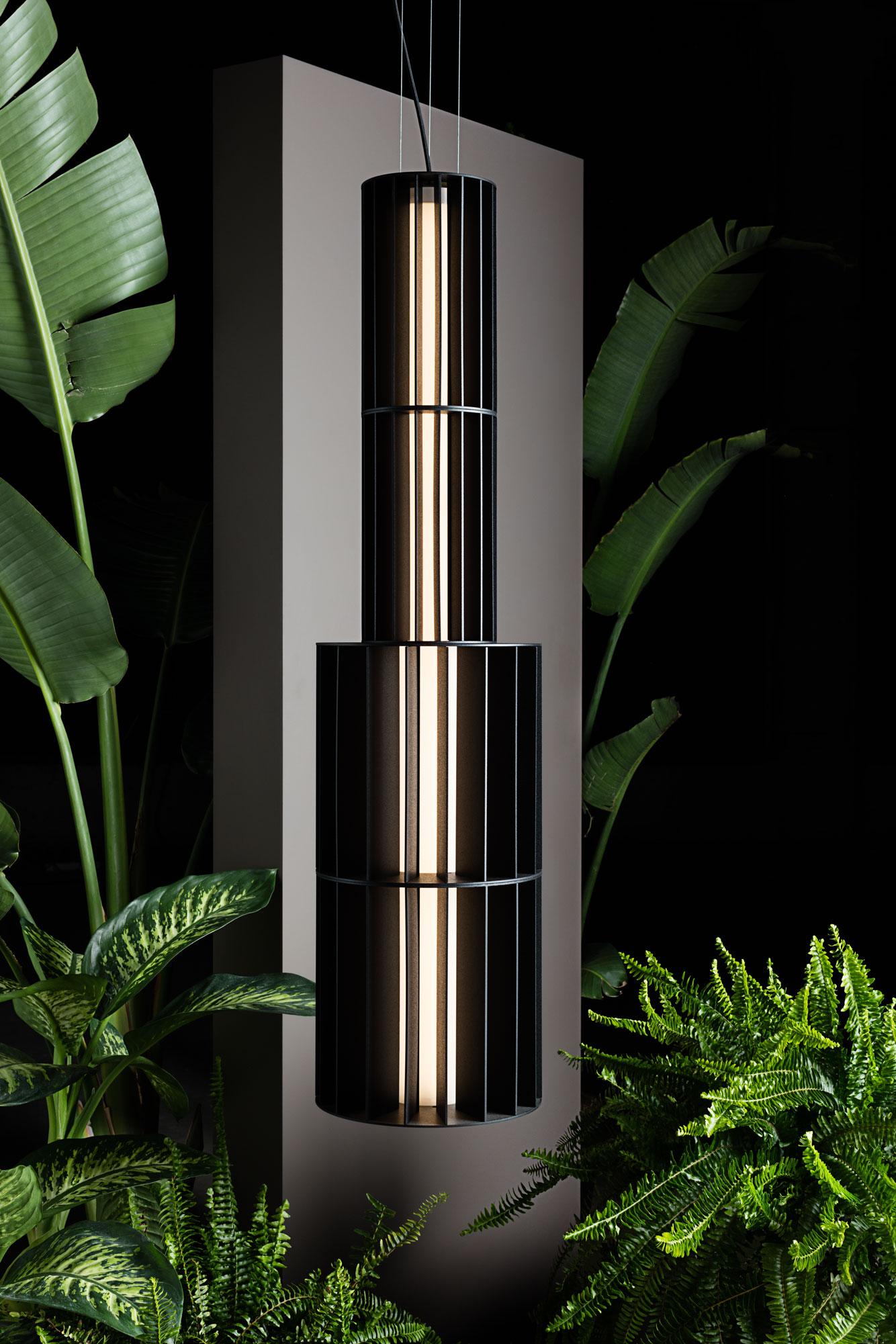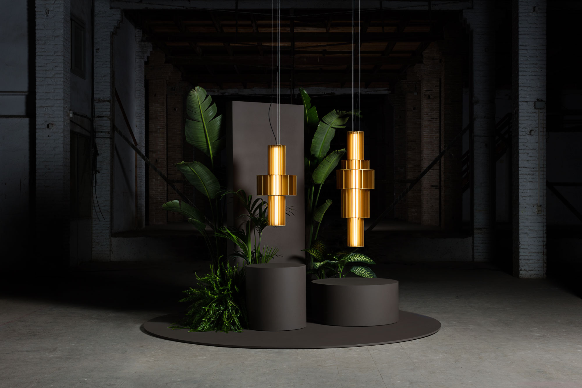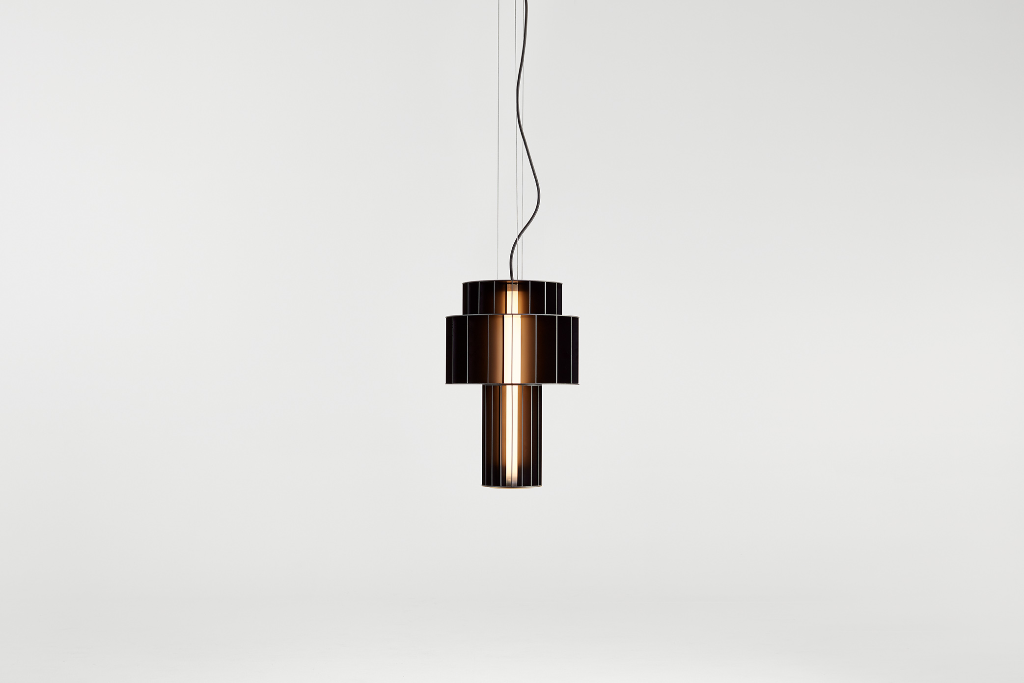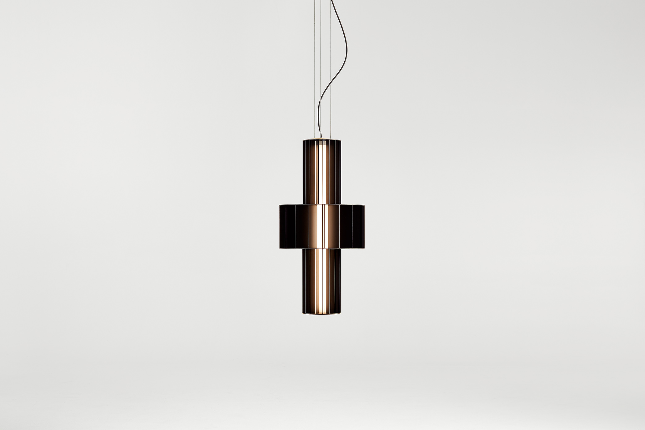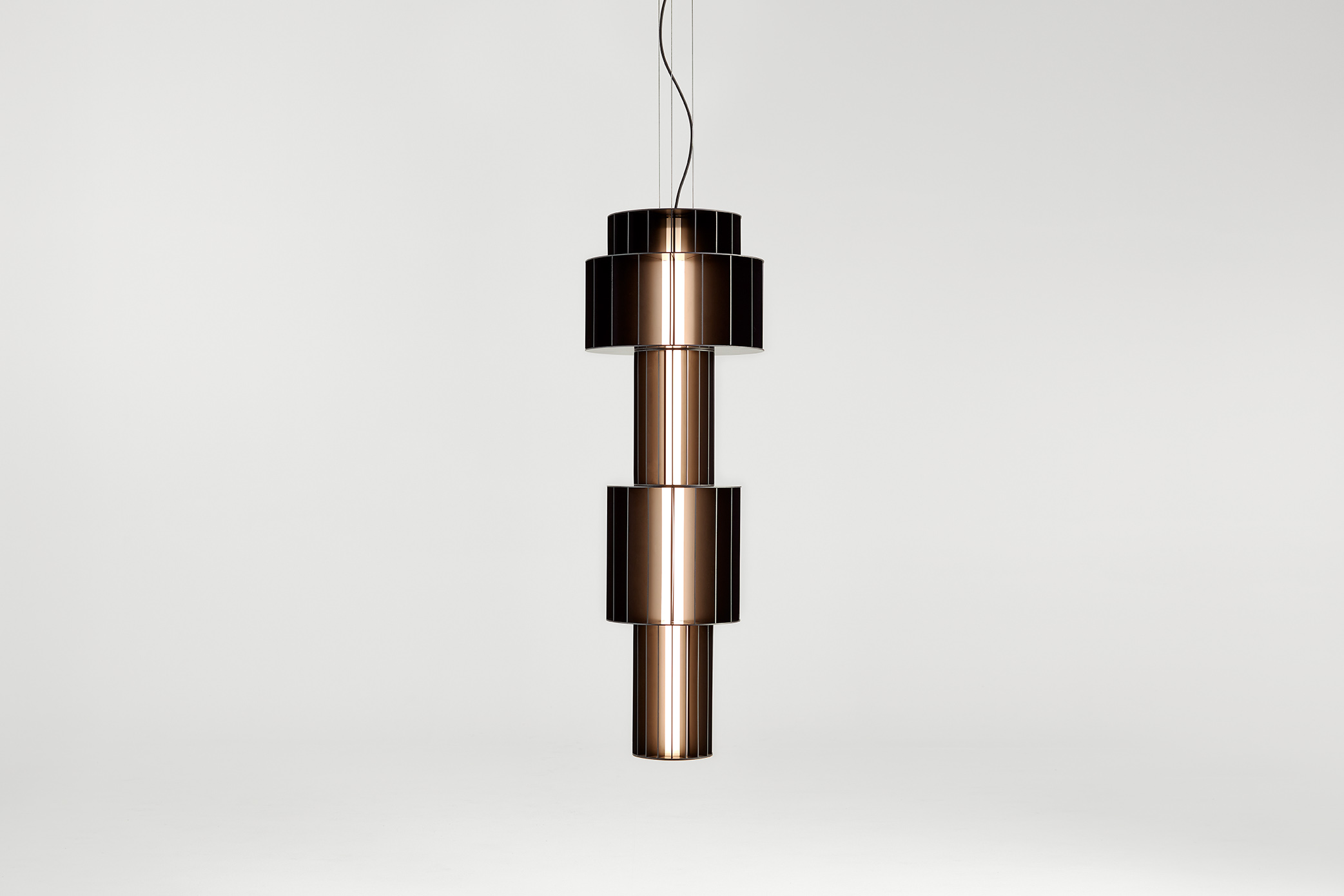 Suspension lamp. Unlimited options can be created by combining the modules in anodized aluminium yellow, orange and red. We offer two light source options: strip led column+module led on the bottom or only strip led column.