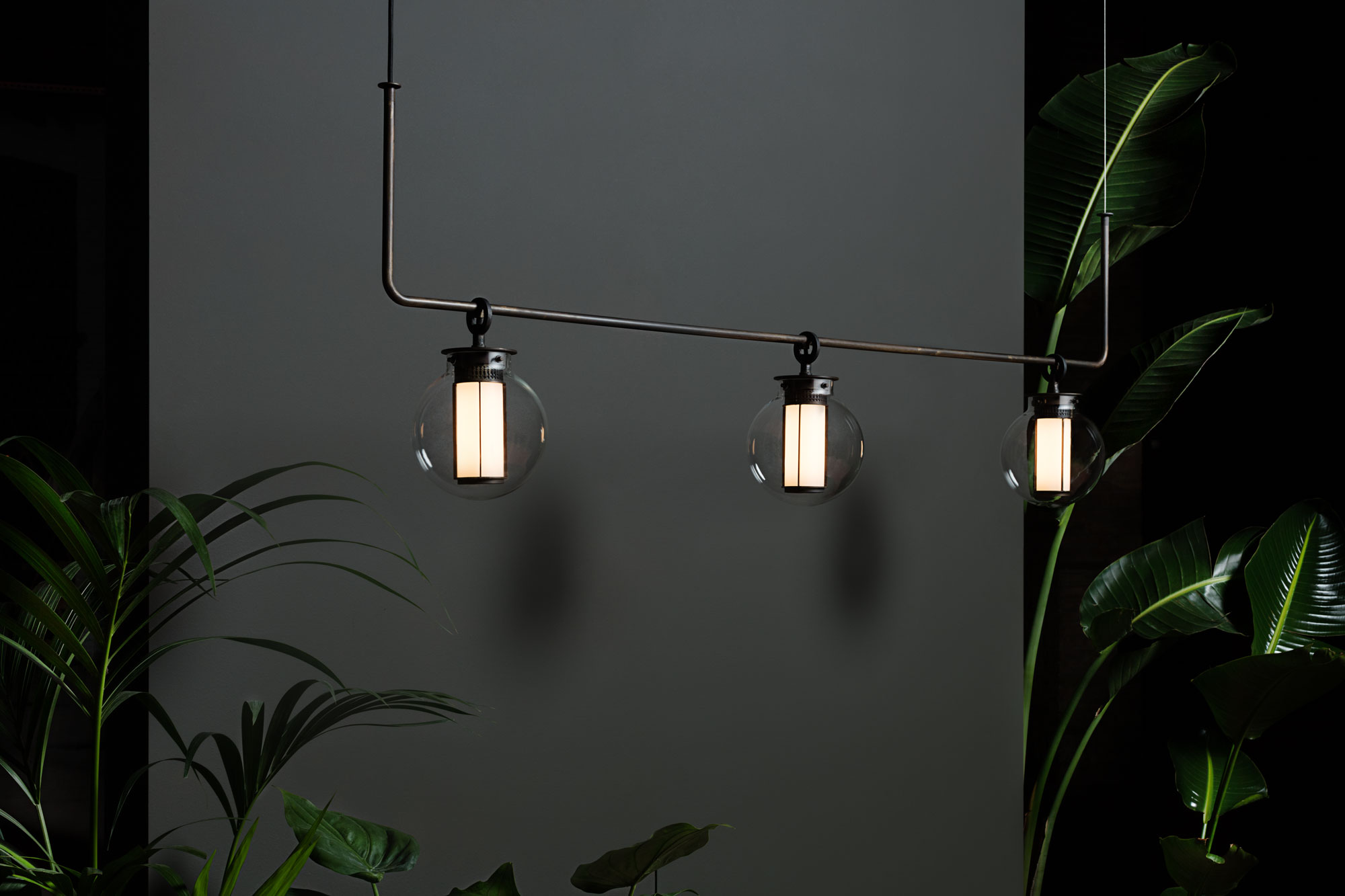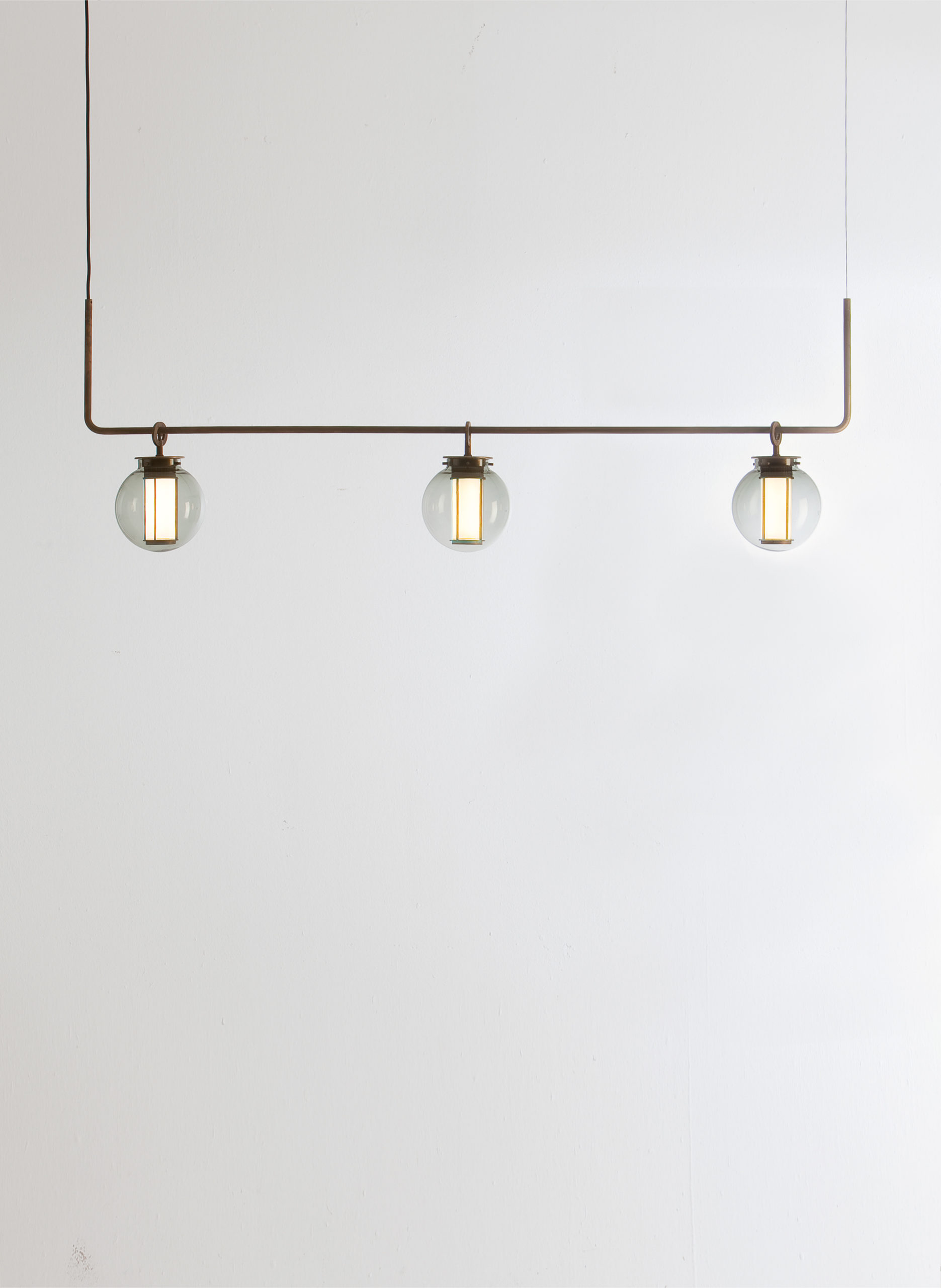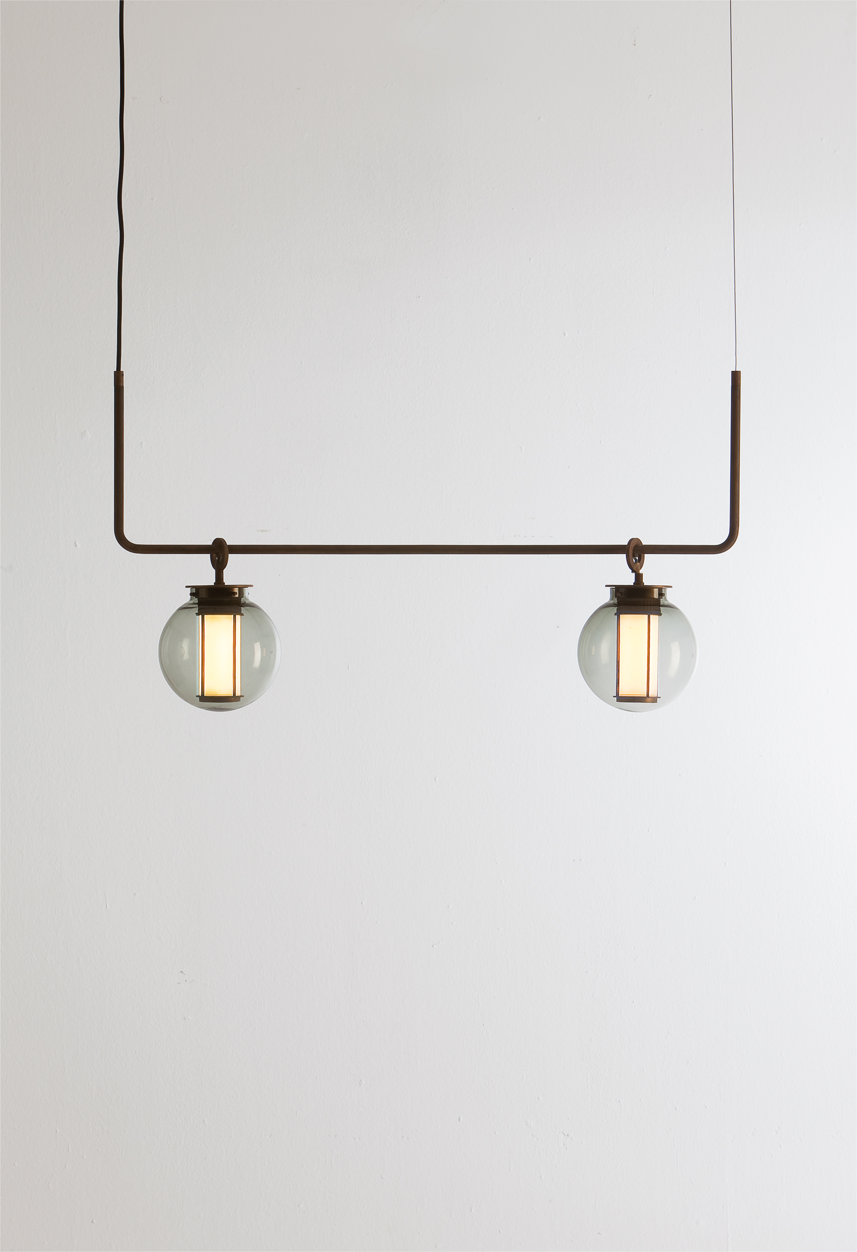 Suspension lamp. Structure and canopy in bronze electroplated steel. Diffuser in blown transparent, amber and grey glass. Strip LED column.