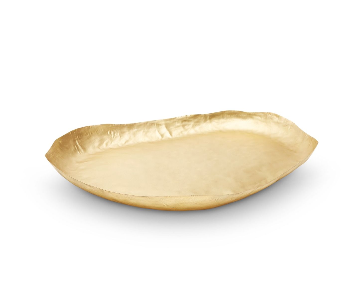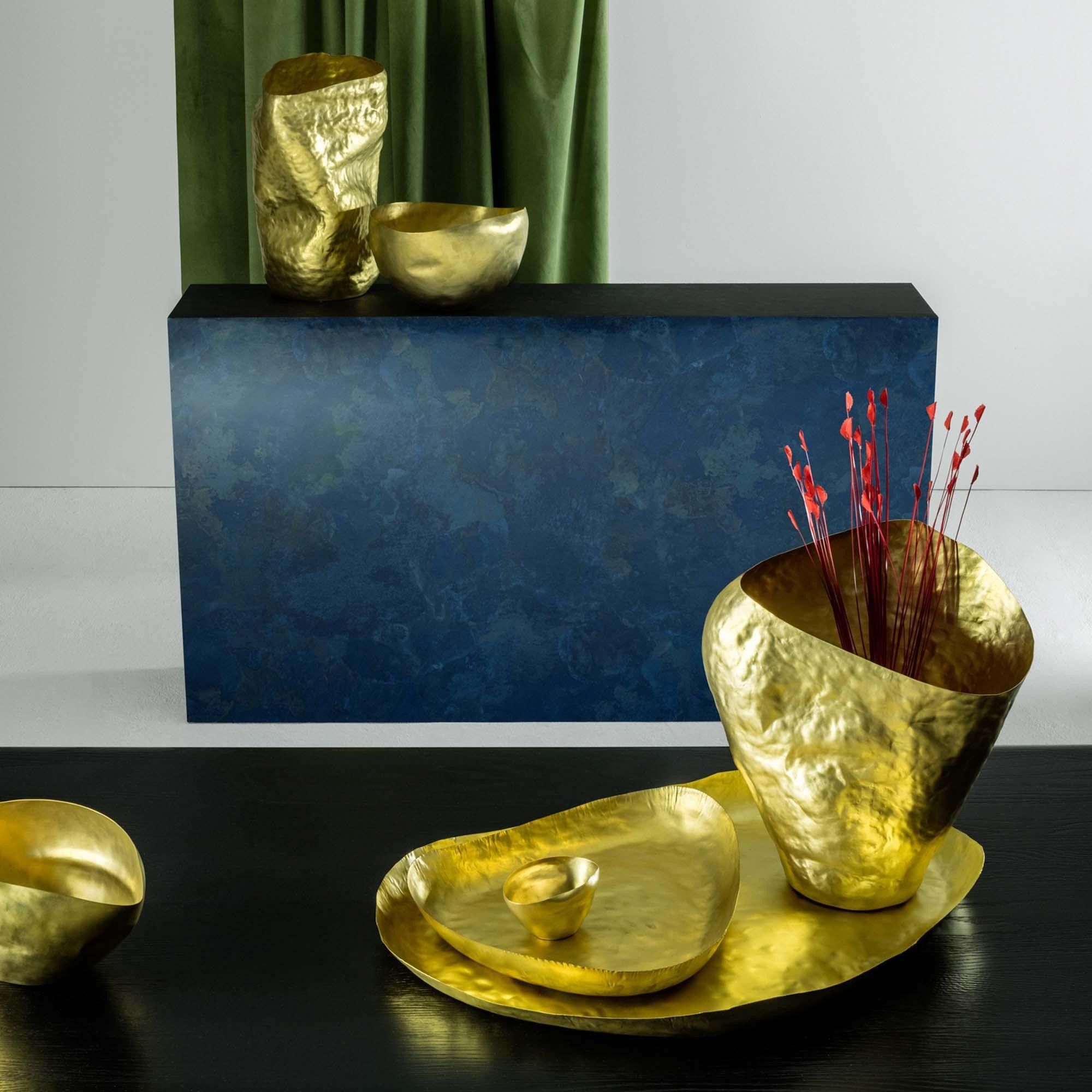 Bash is one of our most appropriately named products – beaten, banged and bashed from large sheets of annealed brass – they functioned so far as great bowls or serving dishes but we were missing ovescaled platters and vases. Something to put a cherry blossom branch in, to use as an umbrella stand or even a most extravagant waste paper basket. The tray allows for bigger parties and more ceremonial snacks.