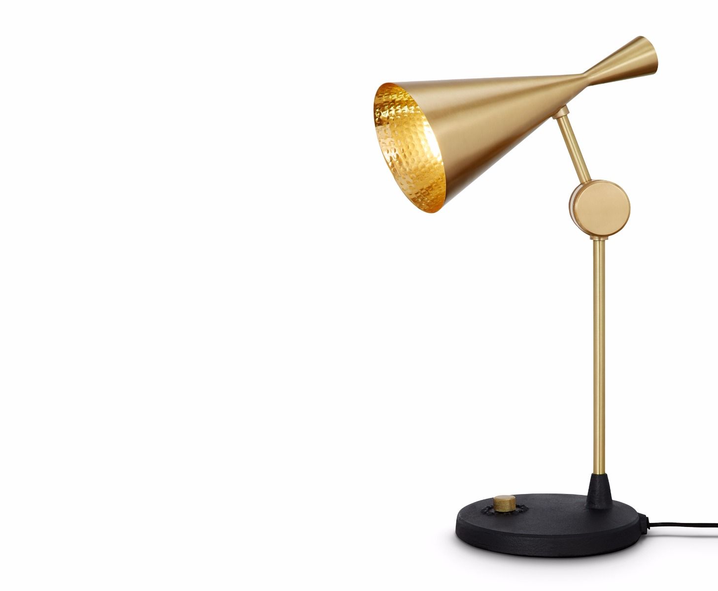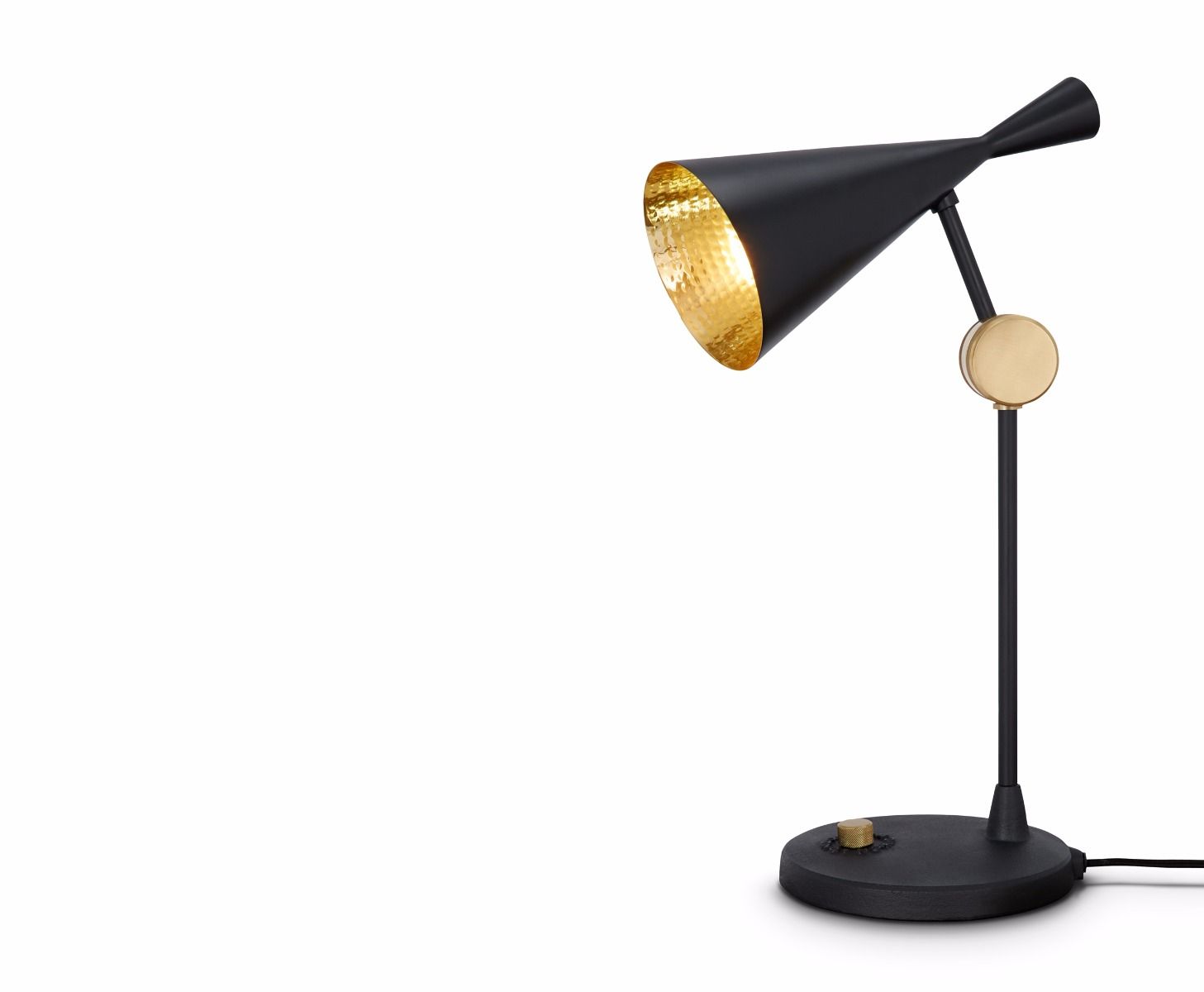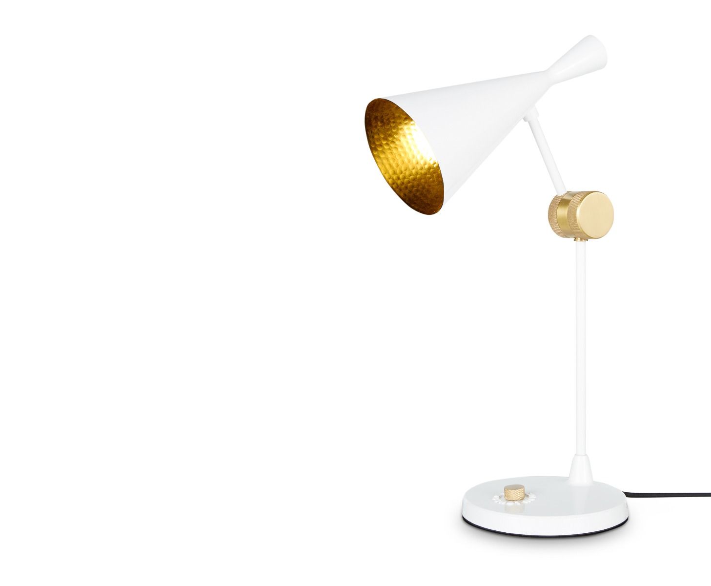 A variation on the famous original Beat Light, this table standing version on a slender articulated arm can be adjusted to direct the light beam. Solid brass componentry and iron sand cast bases create an iconic footprint for any interior. Available in black, brass and white.