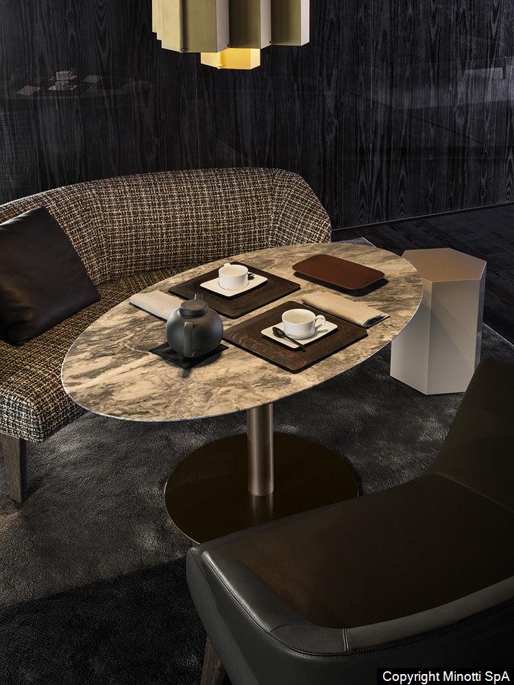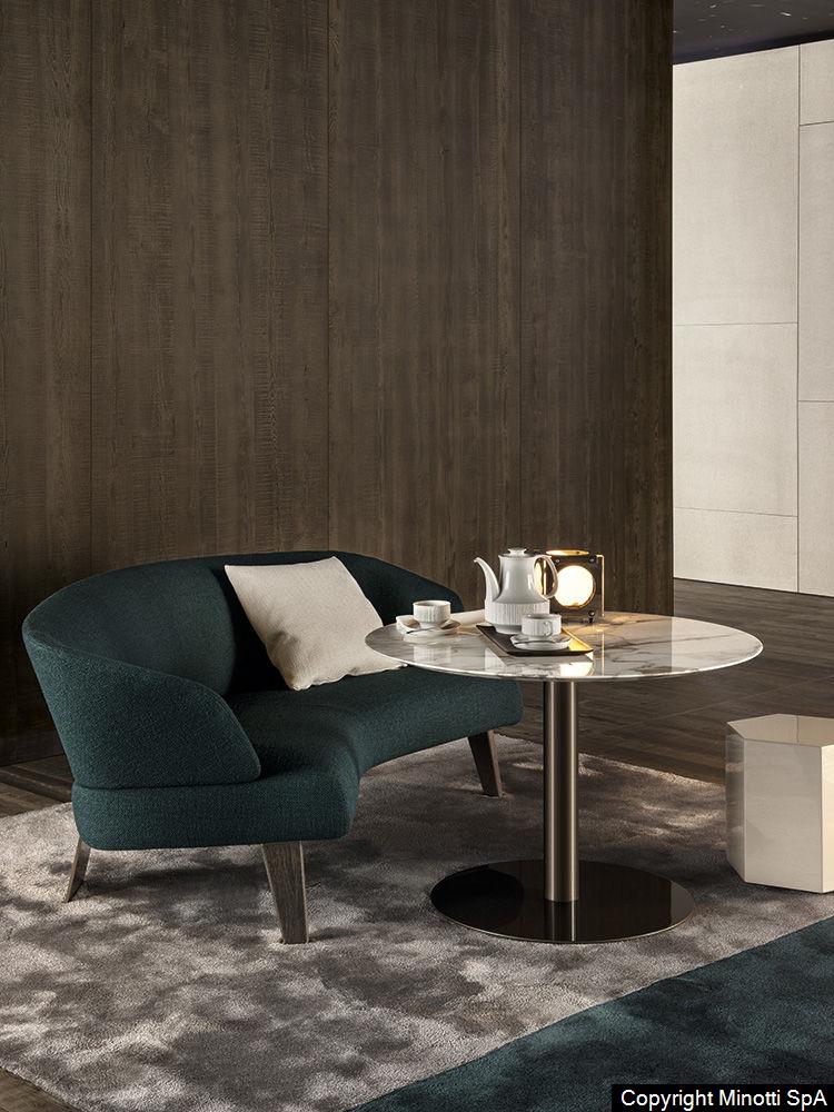 The family of Bellagio “Lounge” tables expands to include new finishes for both the base and the top. The base is in tubular metal with a glossy light Bronze painted finish, while the contoured top, available in the round and oval versions, is furnished in Sucupira veneer with stained Mink finish or in Bardiglio Nuvolato or Calacatta marble. The sizes and finishes of the Bellagio “Lounge” tables were engineered to create unique, sophisticated pairings with the chairs in the 2016 Collection, particularly with the sofas and armchairs in the Creed series