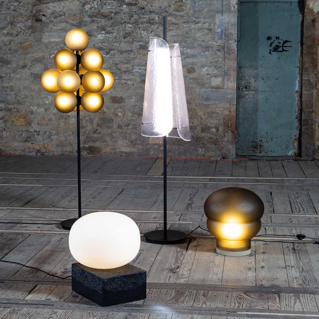 Perhaps his most loved material; designer Sebastian Herkner has again stretched the capabilities of glass production into a series of sculptural lamps. The bent series utilises simple fluted glass panels, pushing and pulling the still fluid forms into flared and curved shapes. The unique pattern of the thin flutes throughout the panel creates a shield of light, the LED light source within spreading across their glass form. Presented simply stop a black steel frame, these mesmerizing glass panels take centre stage.