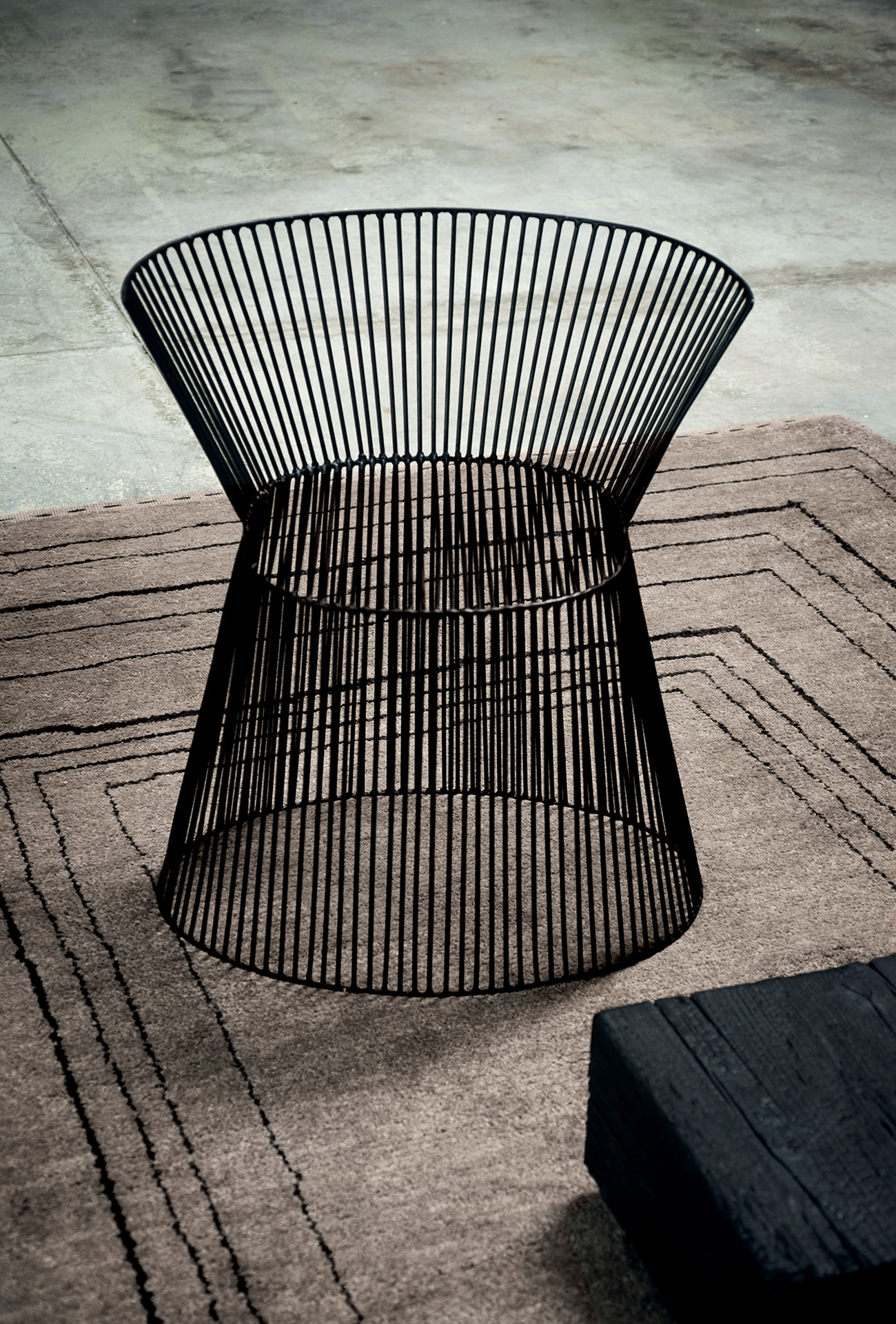 This rug is completely hand-knotted on traditional vertical looms in hand-spun wool, following the features of the Berber-Moroccan rugs of the beginning of ‘900. The finishing process is very elaborate: after the first shave and the handwash, every single rug is handled in order to create a unique product: a skilled craftsman works on the surface with scissors, in order to give it the typical irregularities of the original rugs. On one side a selvage is created, matching with the design pattern and decorated with a woolen stitching. On the other side, fringes are woven one by one, following the style of the old Berber rugs. The b/w version is carried out through the use of non-dyed wools, while the other versions involve the use of vegetable dyes.