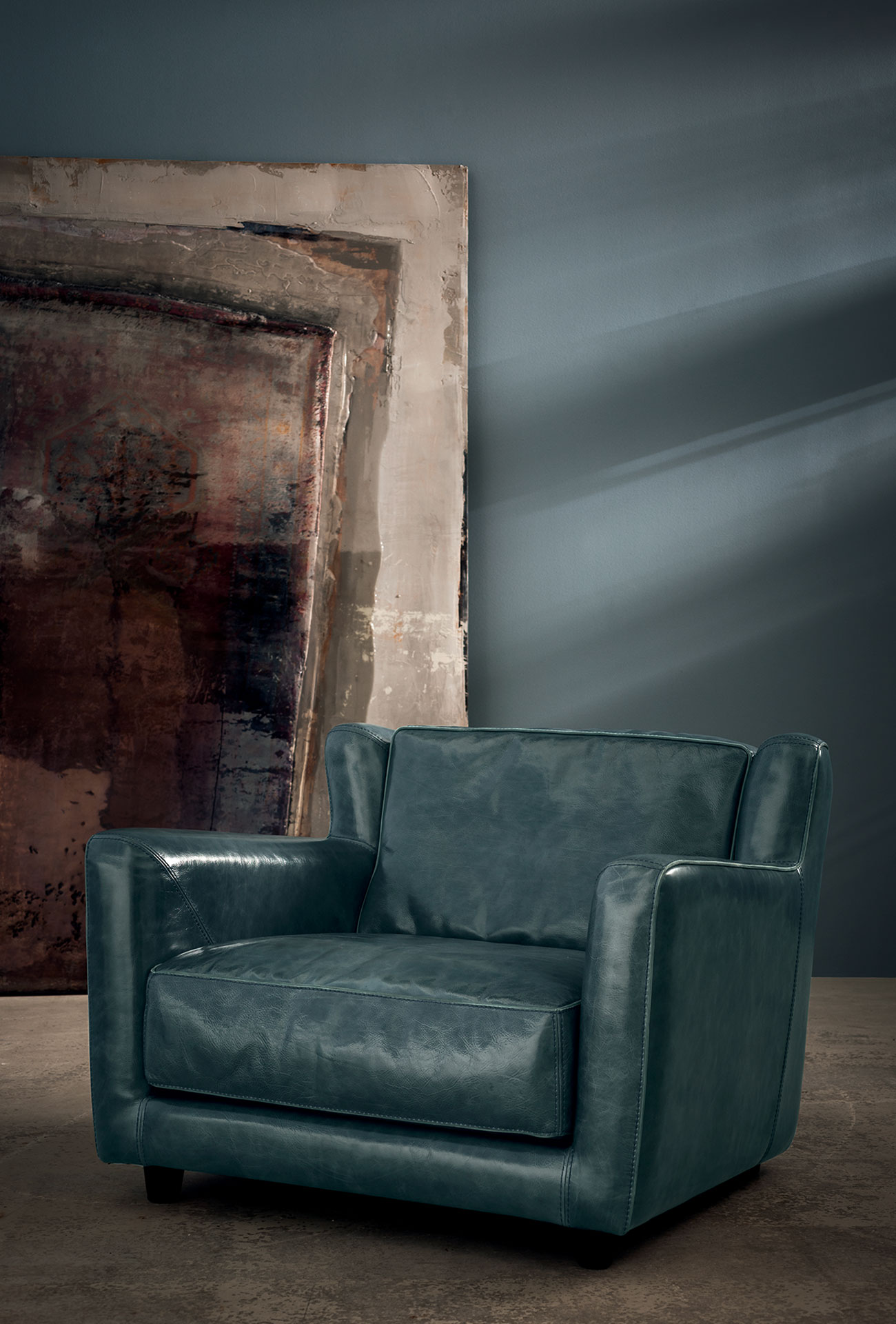 Bergère armchair also available in “Longe” version. One-piece frame in double-panelled fir and poplar. Feet in walnut-stained beech, natural sand-blasted or dark brown sand-blasted. Differentiated density polyurethane foam filling. Springing with woven elastic straps in covered rubber. Seat cushions and back cushions in washed and sterilized goose down with pad in differentiated density polyurethane foam. Decorative piping in the same shade of leather on in contrast.