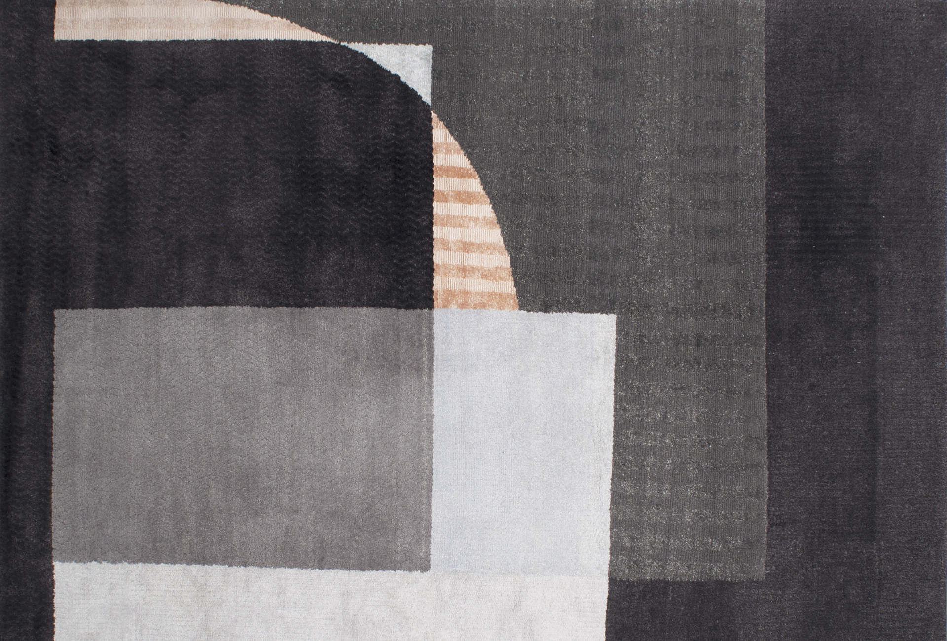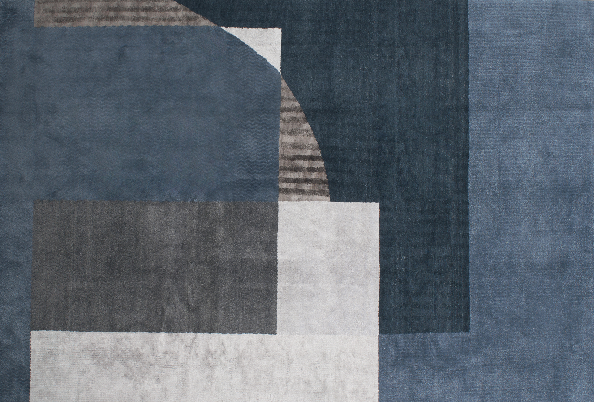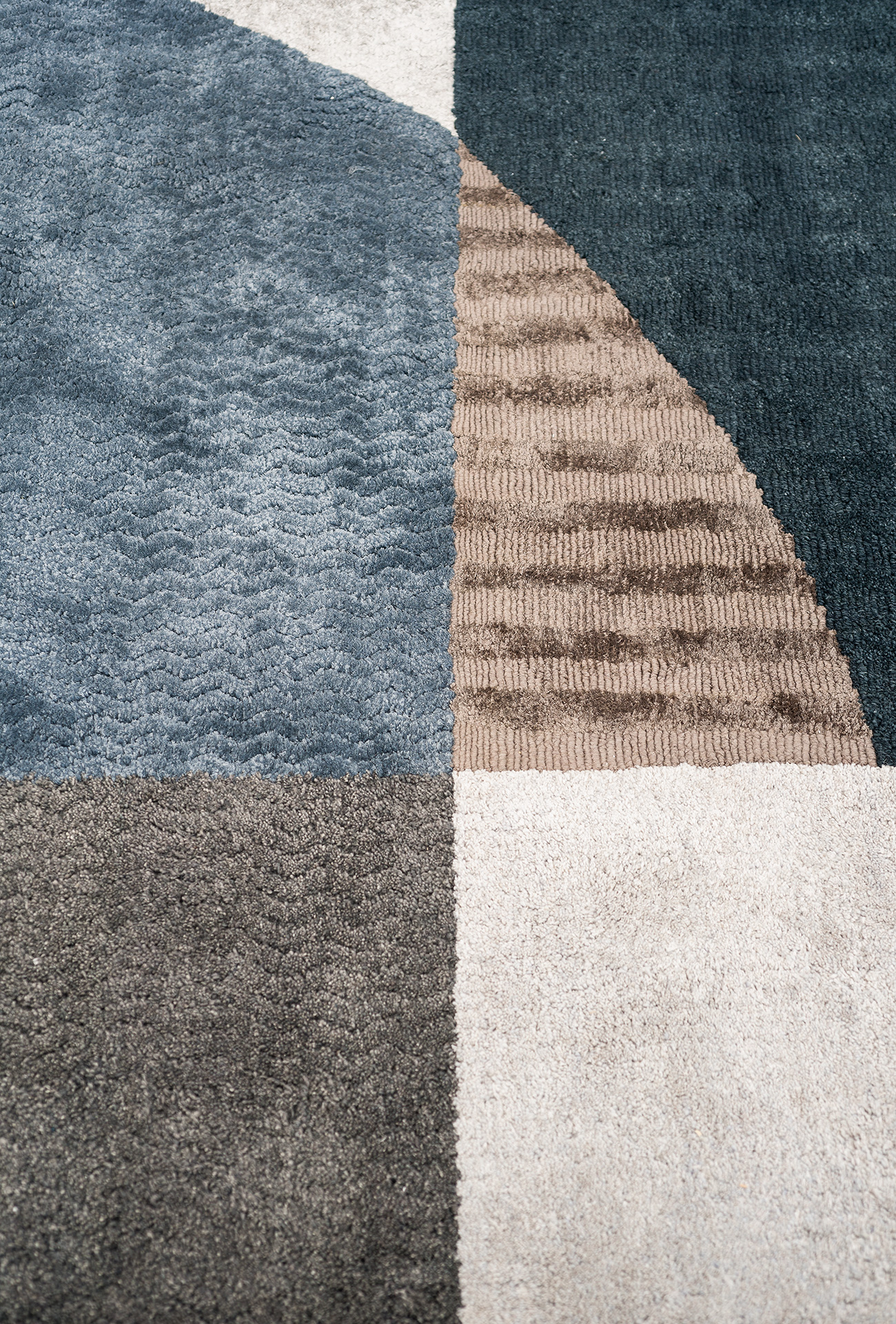 Completely hand-knotted rug in Nepal with the application of different textures. 54% Tibetan wool, 32% linen and 14% viscose.