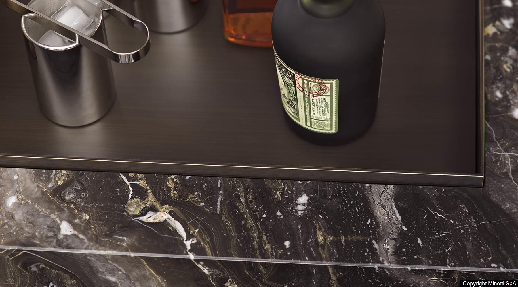 Alternatively, a top in Grigio Orobico marble features a lowered metal tray with a Golden Brown finish, like the legs. The edge of the tray protrudes from the top by 15 mm.