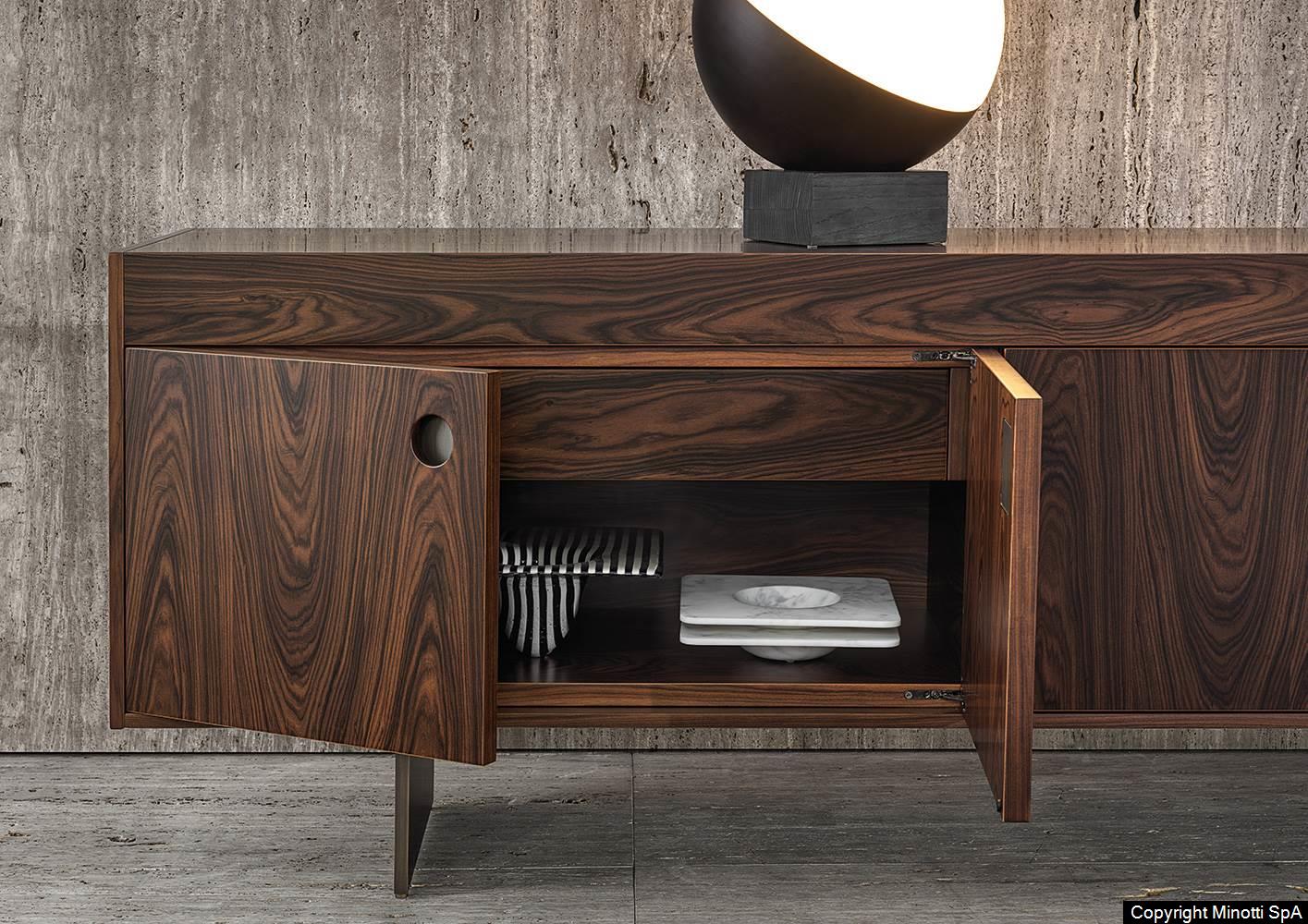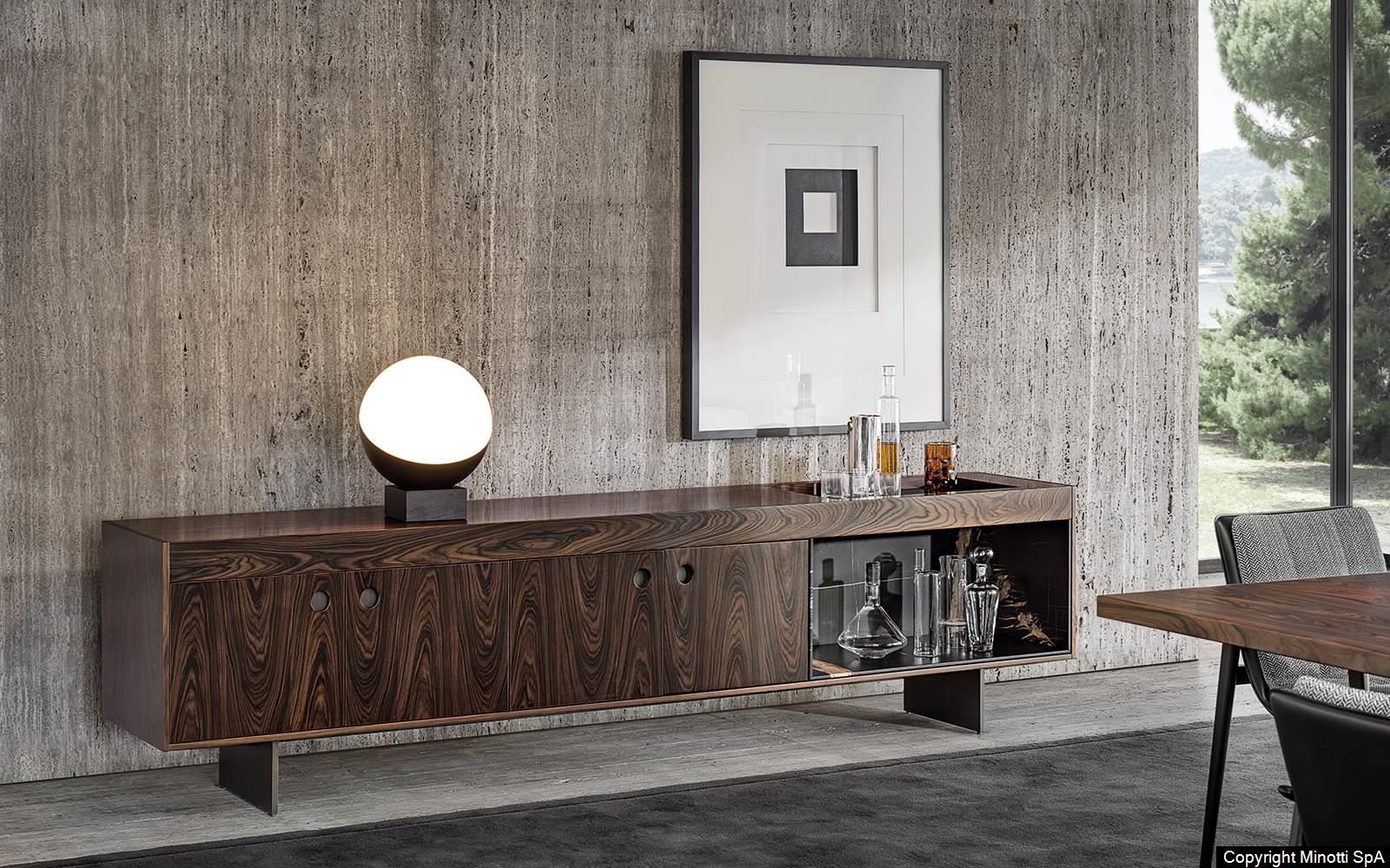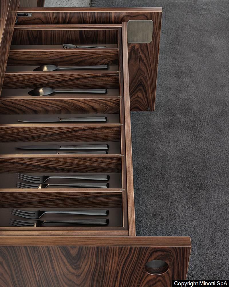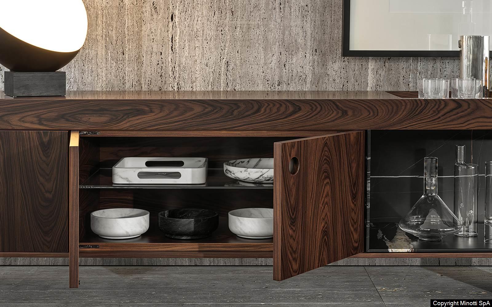 The sideboards stand on aluminium, blade-like legs with a Golden Brown finish. In the dining version, the interiors, whose finish matches the exterior one, are accessorised with a cutlery drawer and, in the sideboard with four doors, a glass shelf.