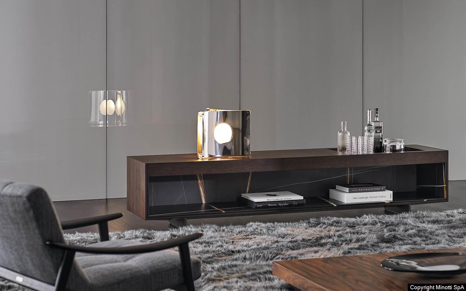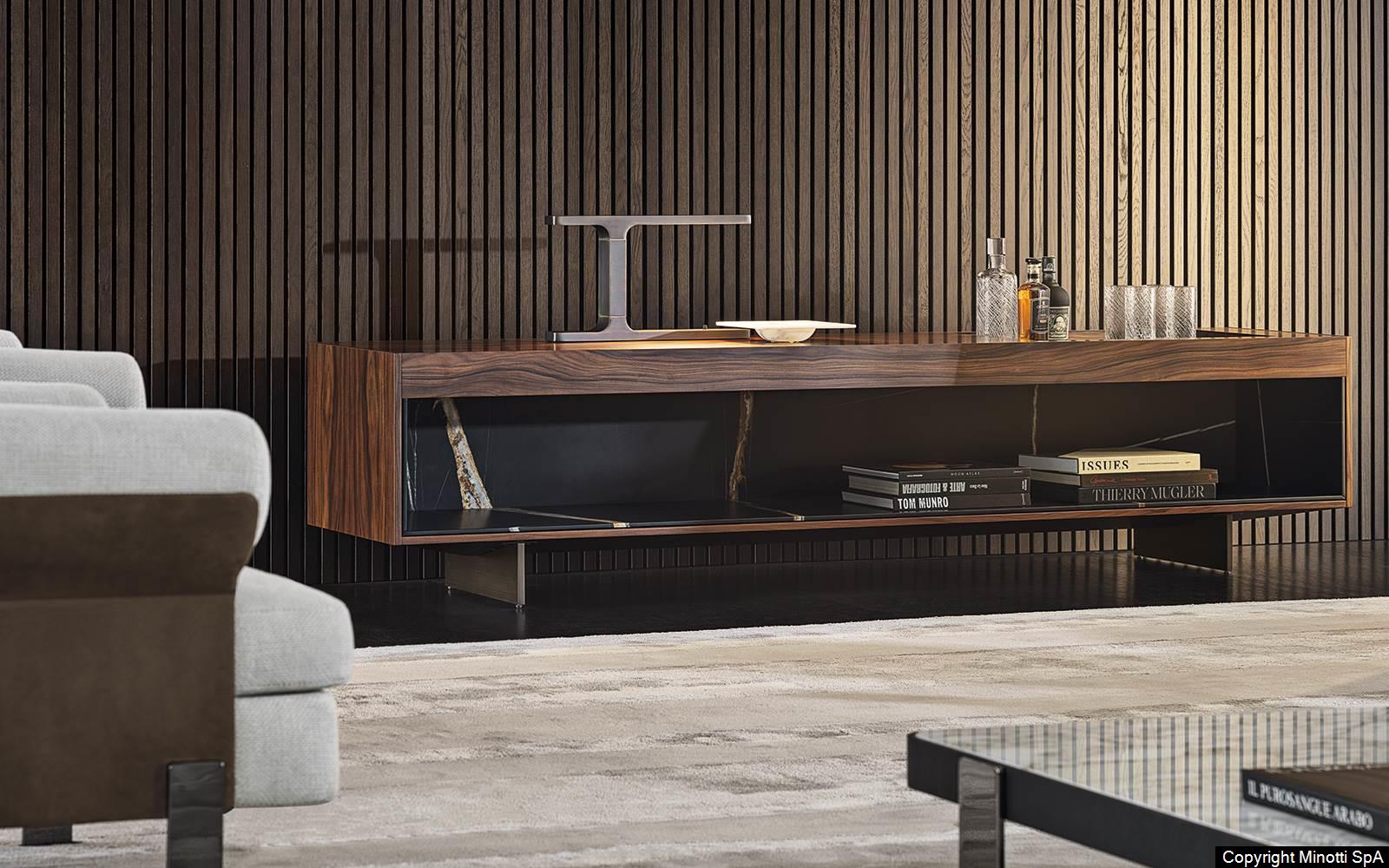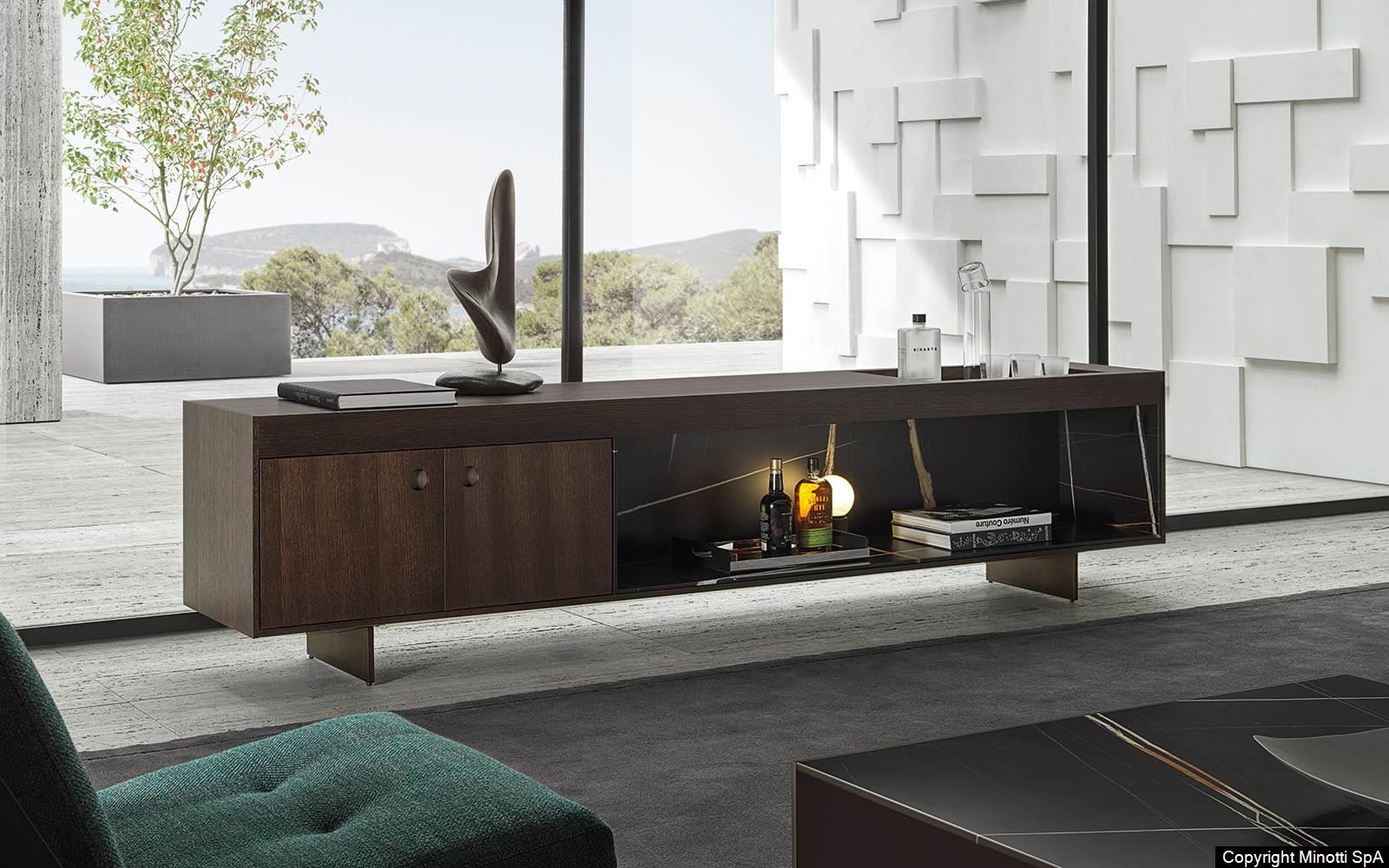 The sideboards stand on aluminium, blade-like legs with a Golden Brown finish. In the dining version, the interiors, whose finish matches the exterior one, are accessorised with a cutlery drawer and, in the sideboard with four doors, a glass shelf.