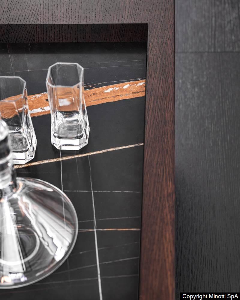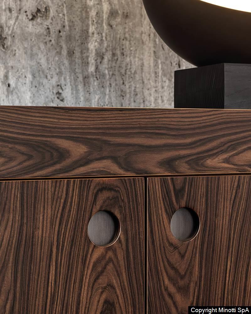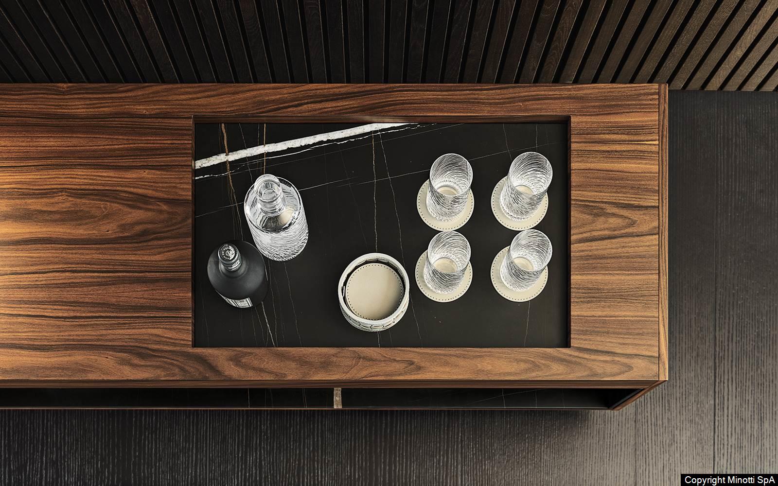 The living and dining sideboards, with one single open compartment or with closable doors, have a structure in oak with Tobacco colour stain finish or palisander Santos in matt polyester lacquer finish, and a top that accommodates a tray insert with the bottom in Sahara Noir marble, the same used on the open compartment.