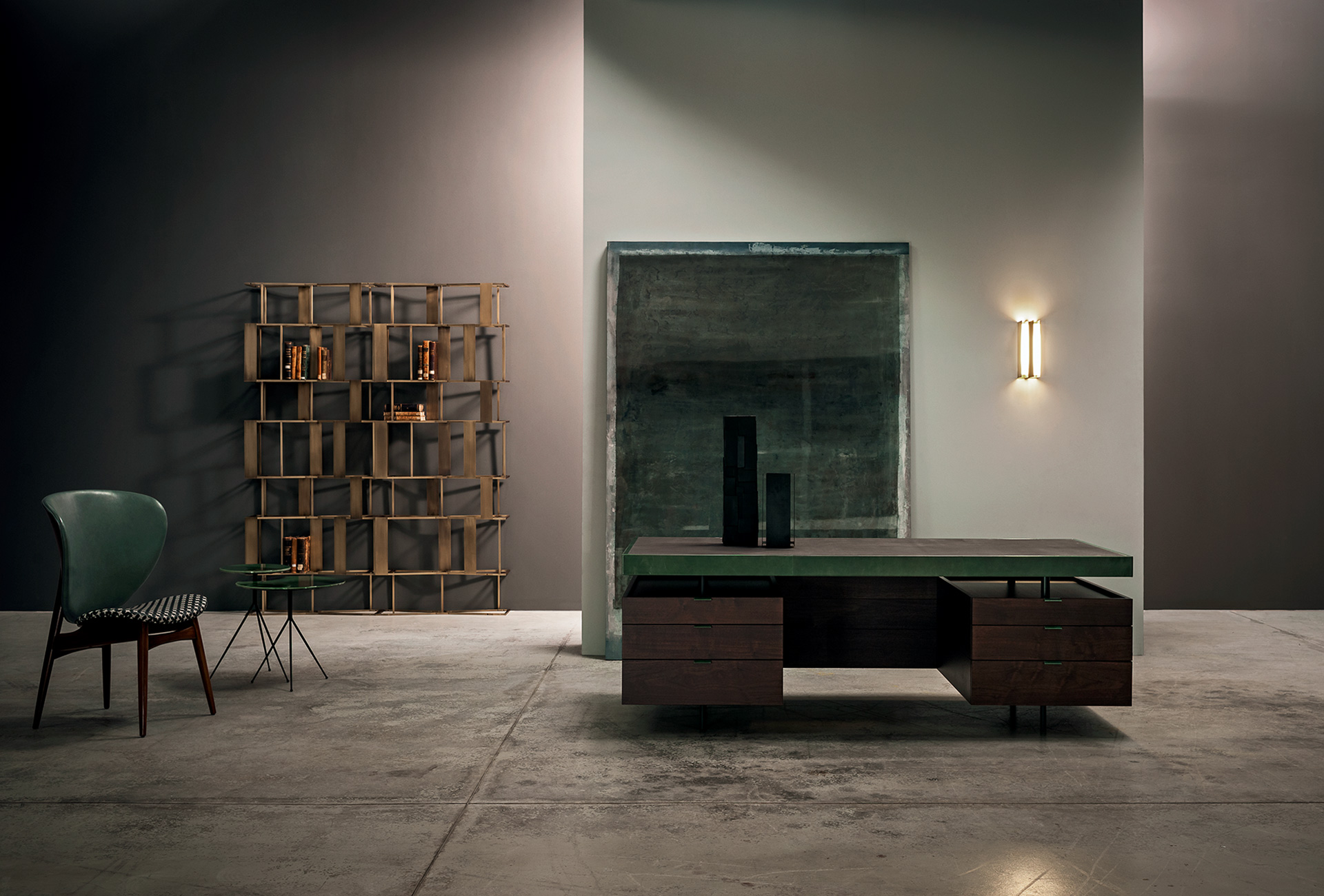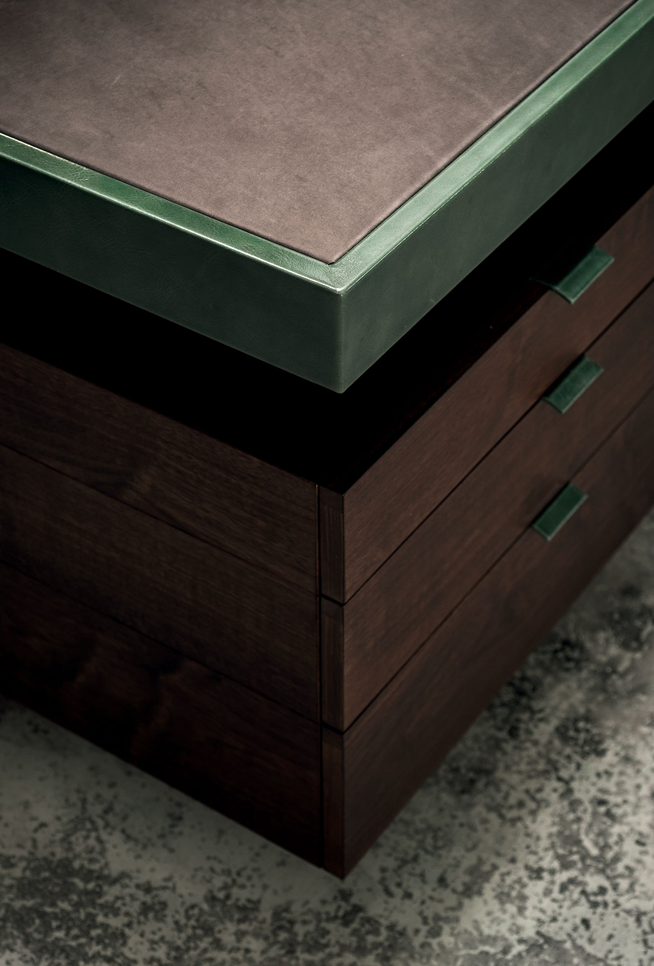 Veneered plywood frame with thick walnut sheet and drawers in solid walnut stained and finished with natural oils. Handles made from sheet steel upholstered in leather. Base in wiredrawn steel painted matte black. Surface and external frame in plywood upholstered in leather. Possibility of having surface and frame in two different leathers; in that case, the colour of the handles will be the same as that of the frame.