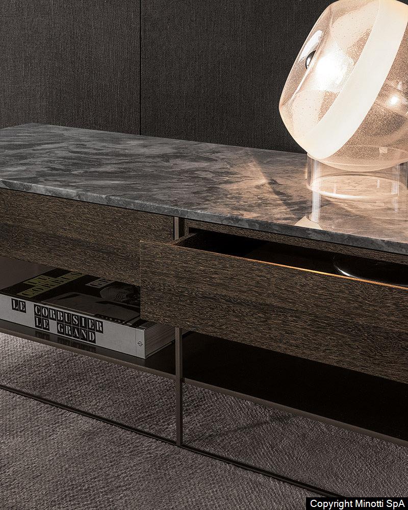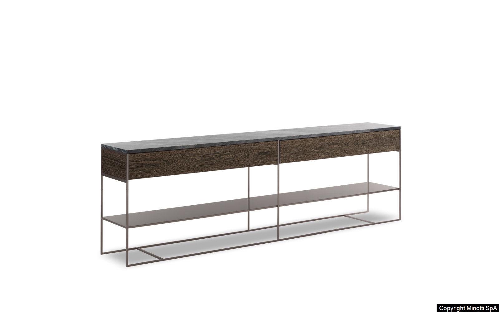 The slender iron structure now comes in a Bronze satin finish. Several new versions of the top are also available: glossy lacquered Sand, Sucupira veneer stained Mink color, and Bardiglio Nuvolato or Calacatta marble. The under shelf is also in satin finish metal painted Bronze. Some of the consoles are equipped with drawers in Sucupira stained Mink color.