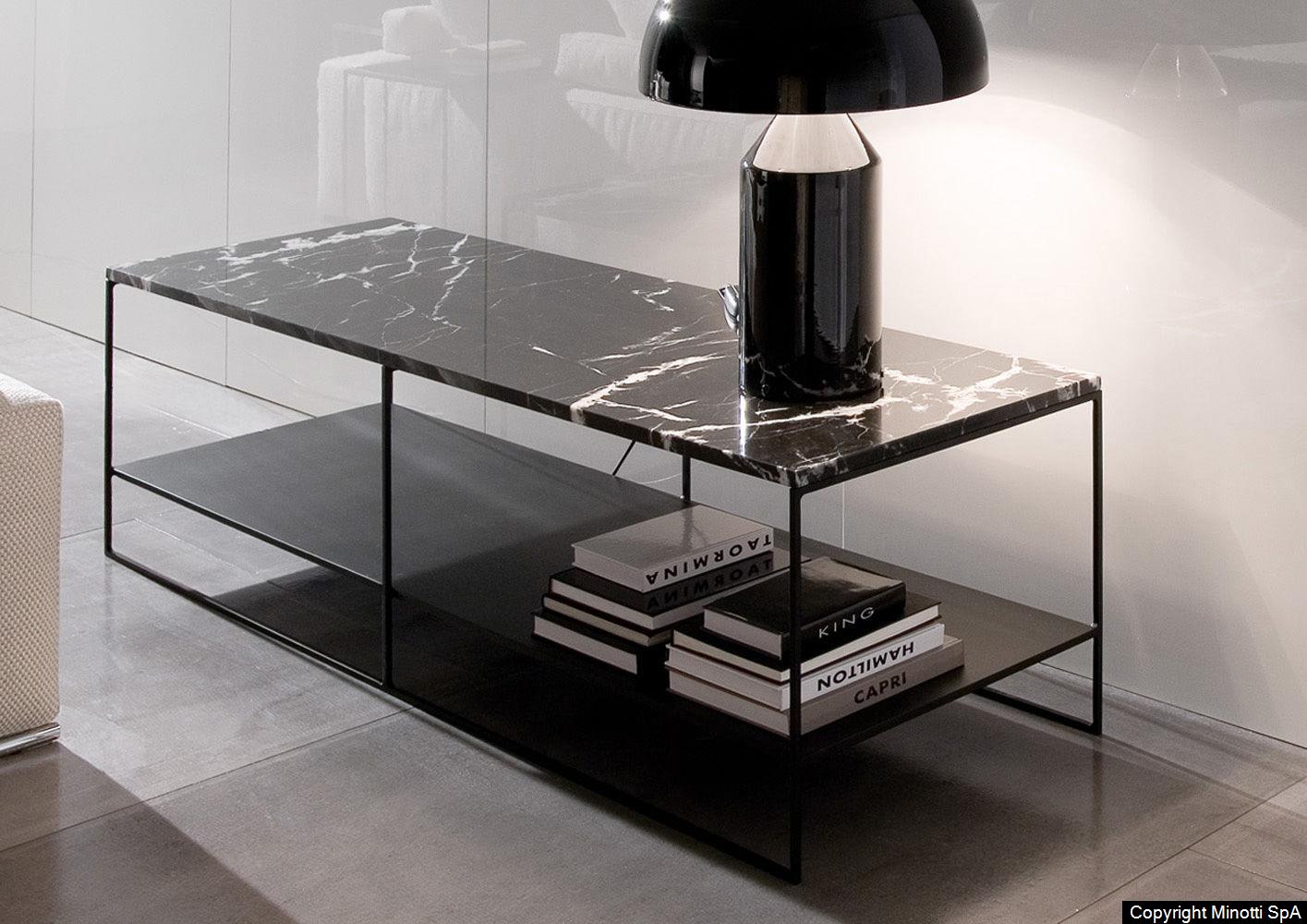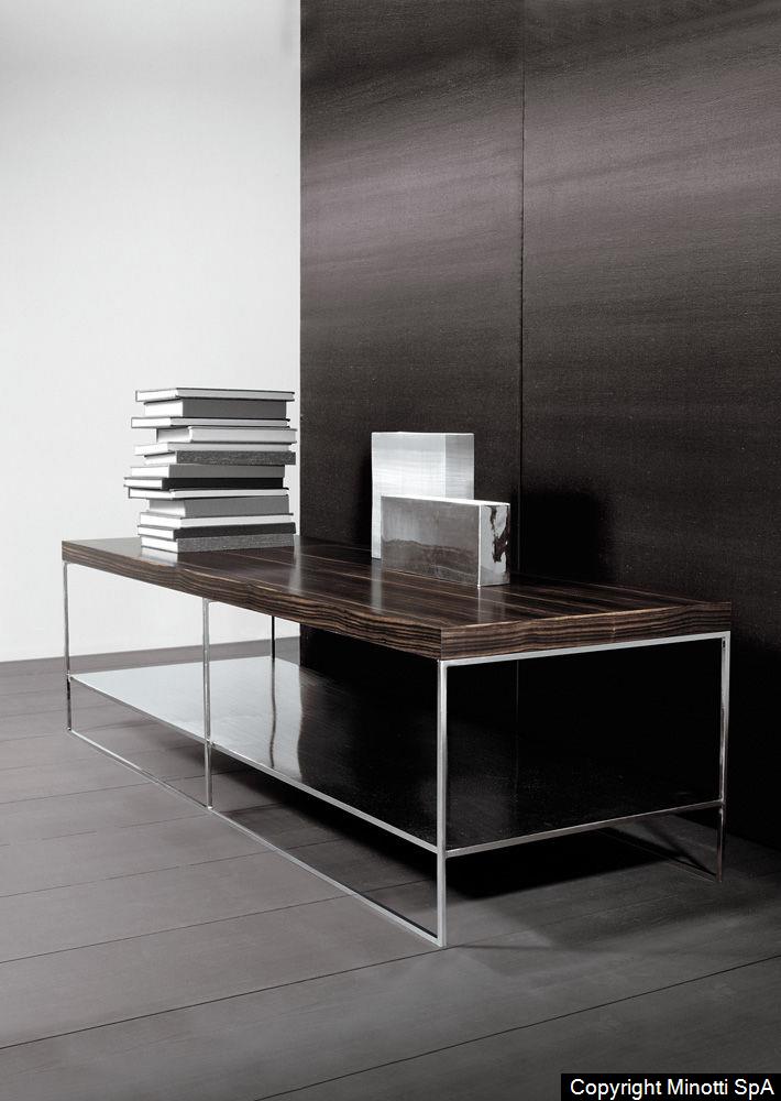 The hand-crafted or matt black solid iron structure can be teamed with the following tops: ebony veneer with a matt or glossy clear polyester finish, natural brushed oak, open pore Grey, Moka or Black tinted oak, lacquered in a variety of refined nuances and Black Marquina marble